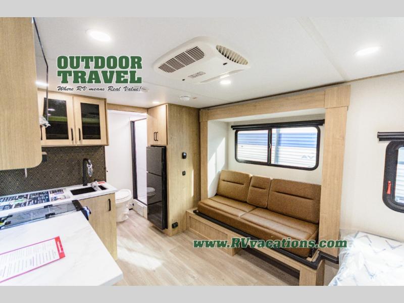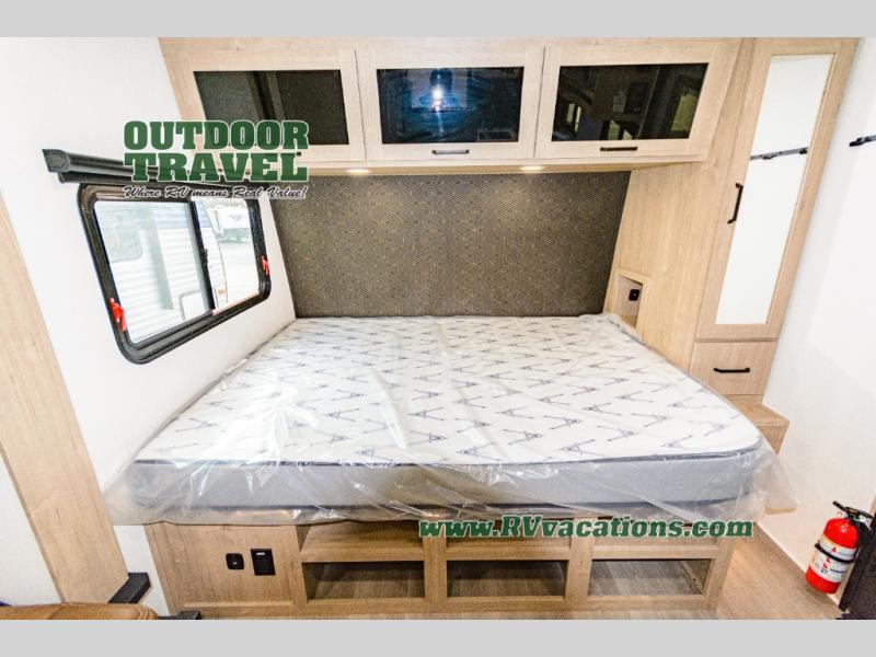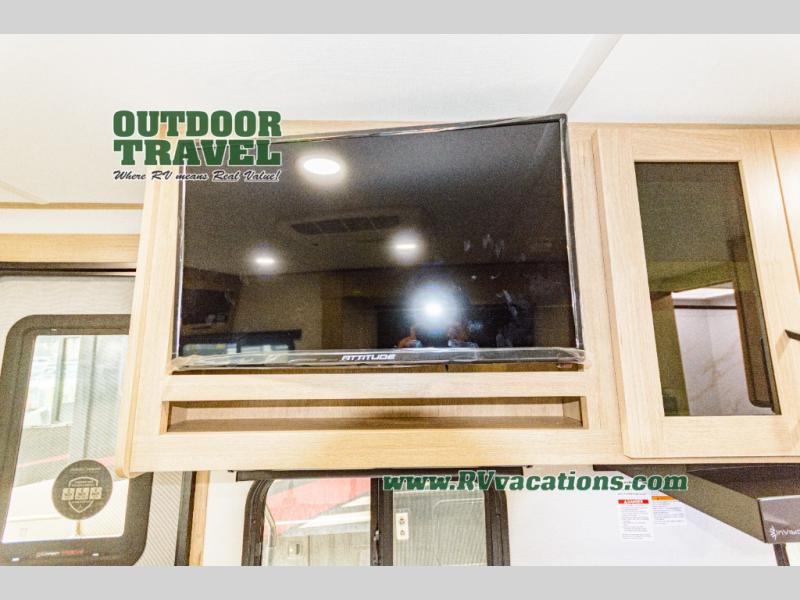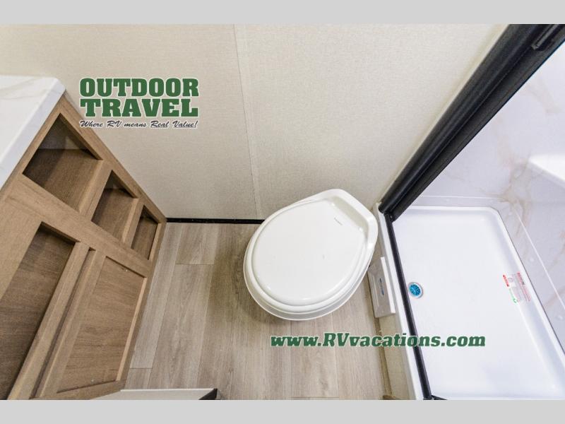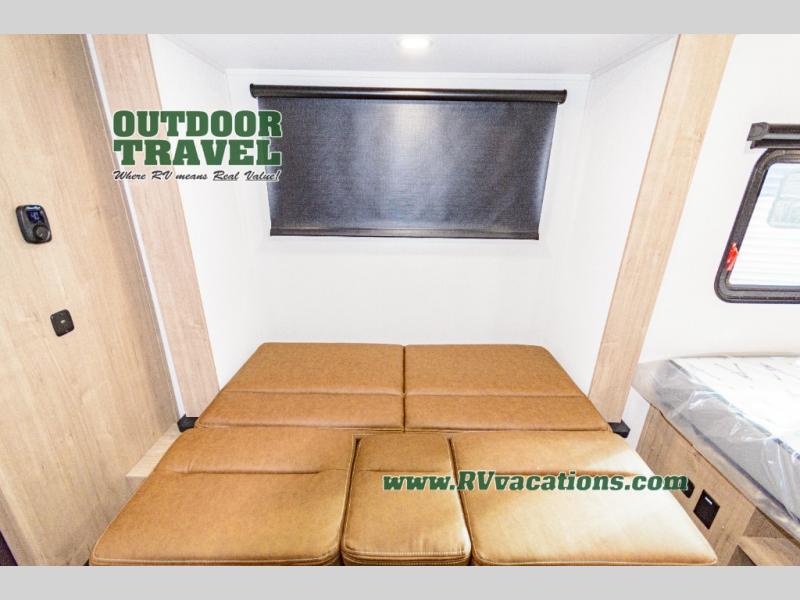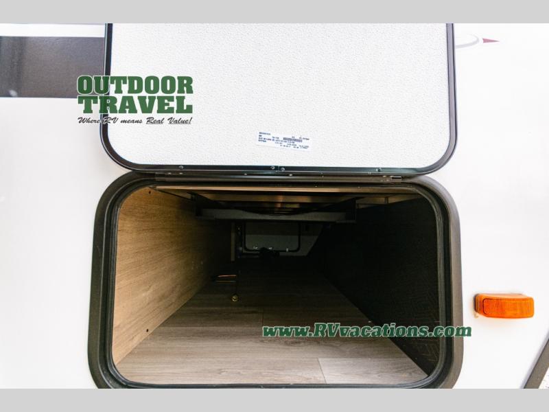 Pack your bags and head out on a fun camping trip in this travel trailer! The front queen bed offers a comfortable place to sleep at night, as well as the roll-over sleeper sofa slide with shoe storage. You can make meals on the cooktop or in the convection microwave. The full rear bathroom has a walk-in shower with an oversized vanity to easily get ready each day. Outside, you'll find a spray port, an unobstructed pass-thru storage, and an interior/exterior table to use at your convenience.