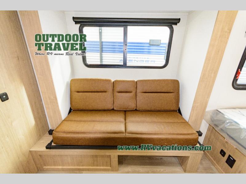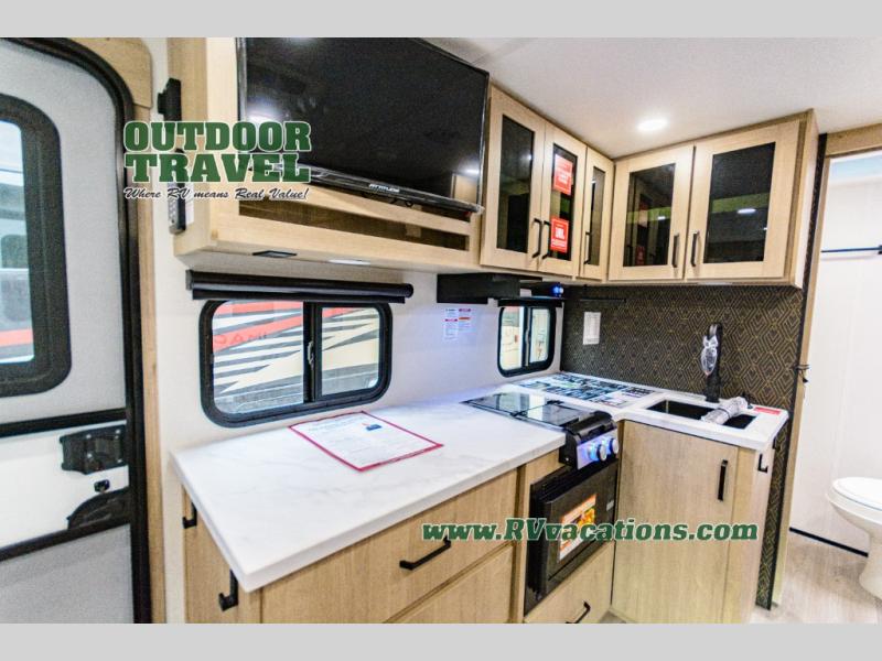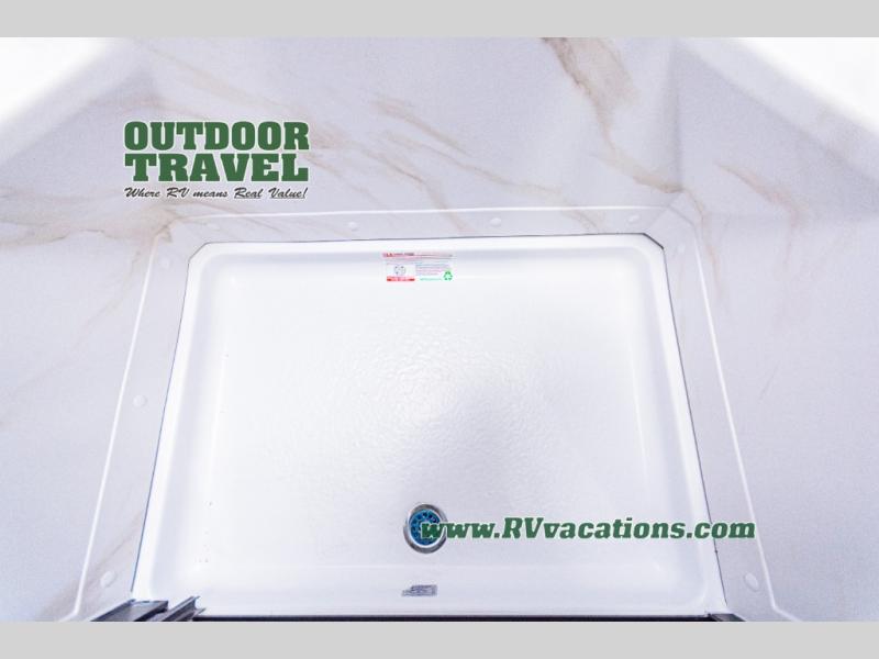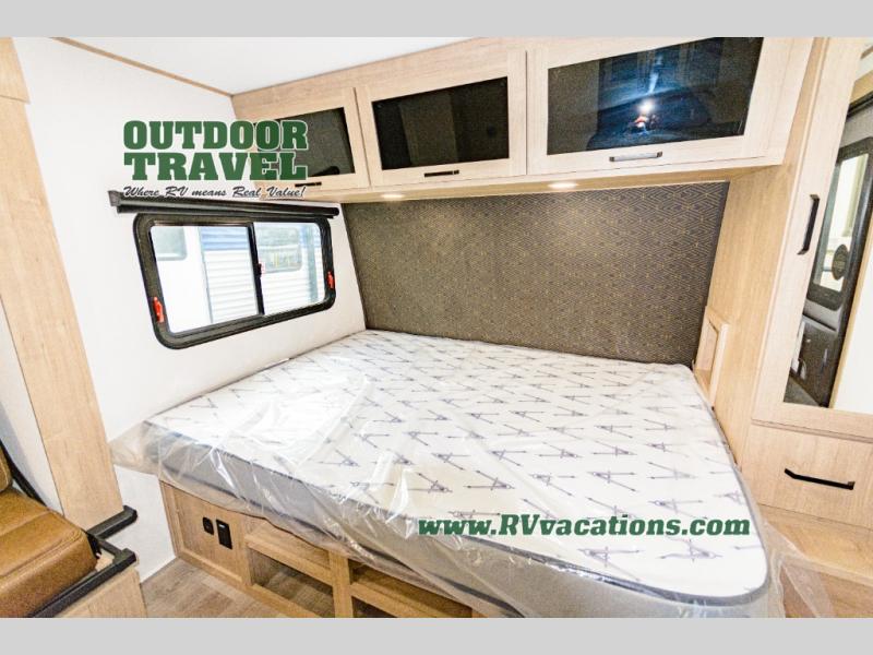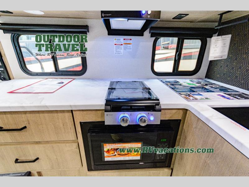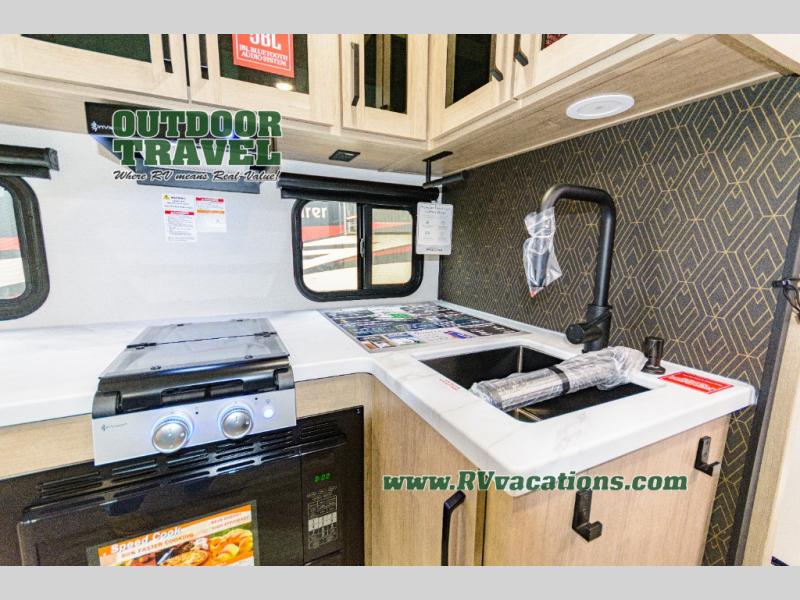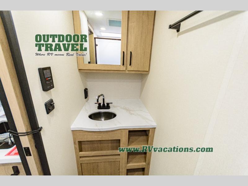 Pack your bags and head out on a fun camping trip in this travel trailer! The front queen bed offers a comfortable place to sleep at night, as well as the roll-over sleeper sofa slide with shoe storage. You can make meals on the cooktop or in the convection microwave. The full rear bathroom has a walk-in shower with an oversized vanity to easily get ready each day. Outside, you'll find a spray port, an unobstructed pass-thru storage, and an interior/exterior table to use at your convenience.