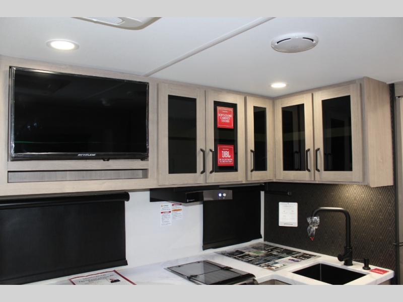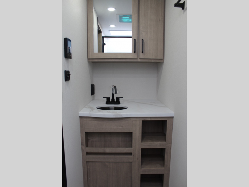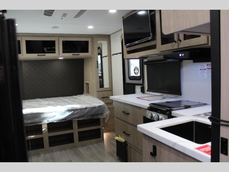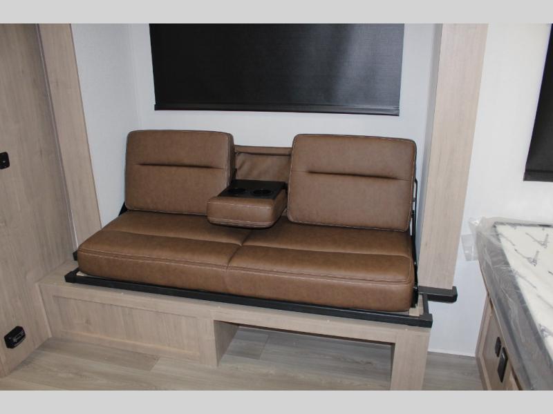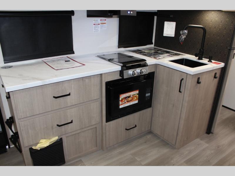 Pack your bags and head out on a fun camping trip in this travel trailer! The front queen bed offers a comfortable place to sleep at night, as well as the roll-over sleeper sofa slide with shoe storage. You can make meals on the cooktop or in the convection microwave. The full rear bathroom has a walk-in shower with an oversized vanity to easily get ready each day. Outside, you'll find a spray port, an unobstructed pass-thru storage, and an interior/exterior table to use at your convenience.