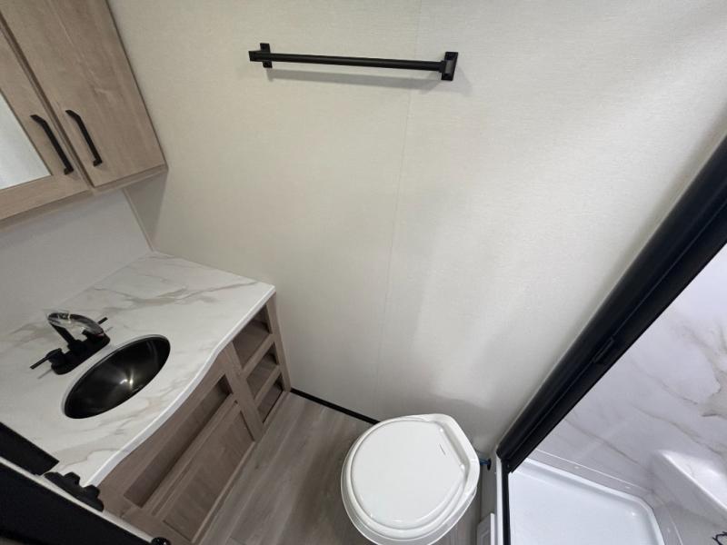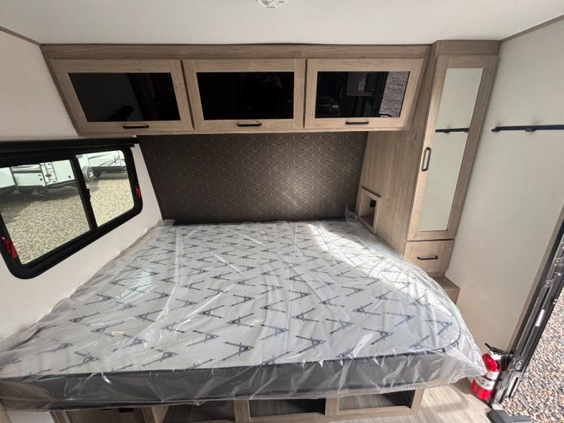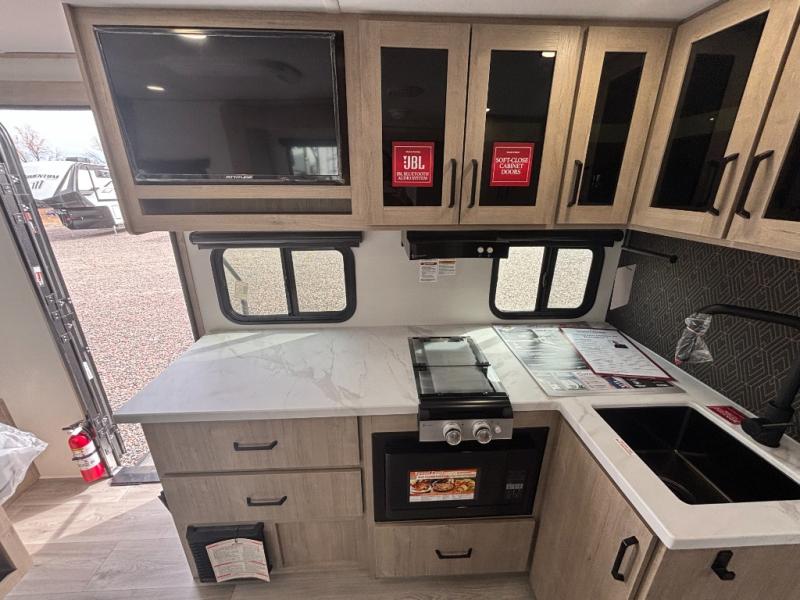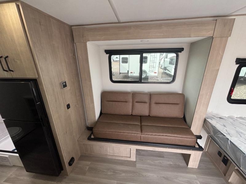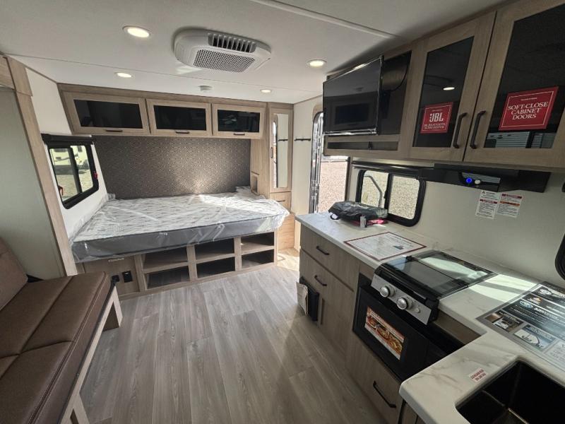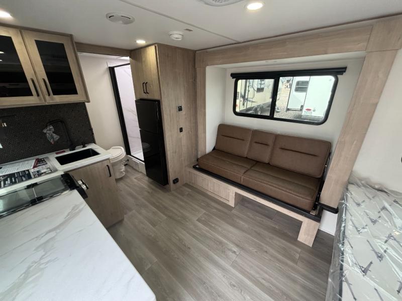 Pack your bags and head out on a fun camping trip in this travel trailer! The front queen bed offers a comfortable place to sleep at night, as well as the roll-over sleeper sofa slide with shoe storage. You can make meals on the cooktop or in the convection microwave. The full rear bathroom has a walk-in shower with an oversized vanity to easily get ready each day. Outside, you'll find a spray port, an unobstructed pass-thru storage, and an interior/exterior table to use at your convenience.