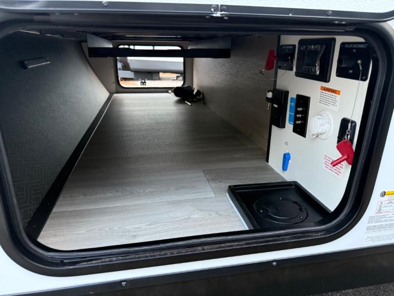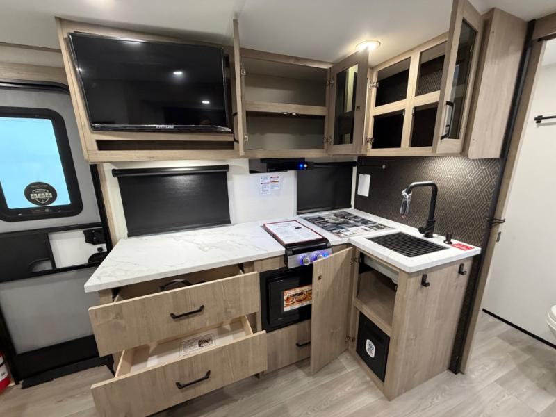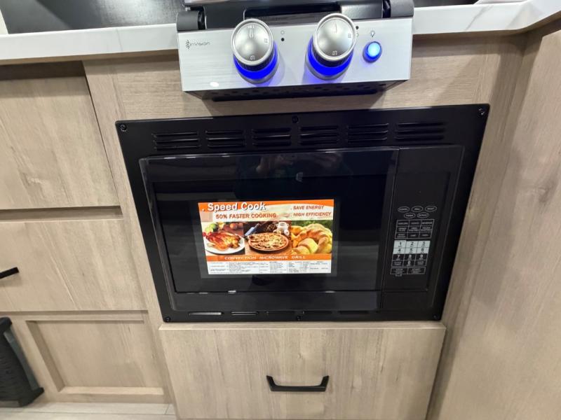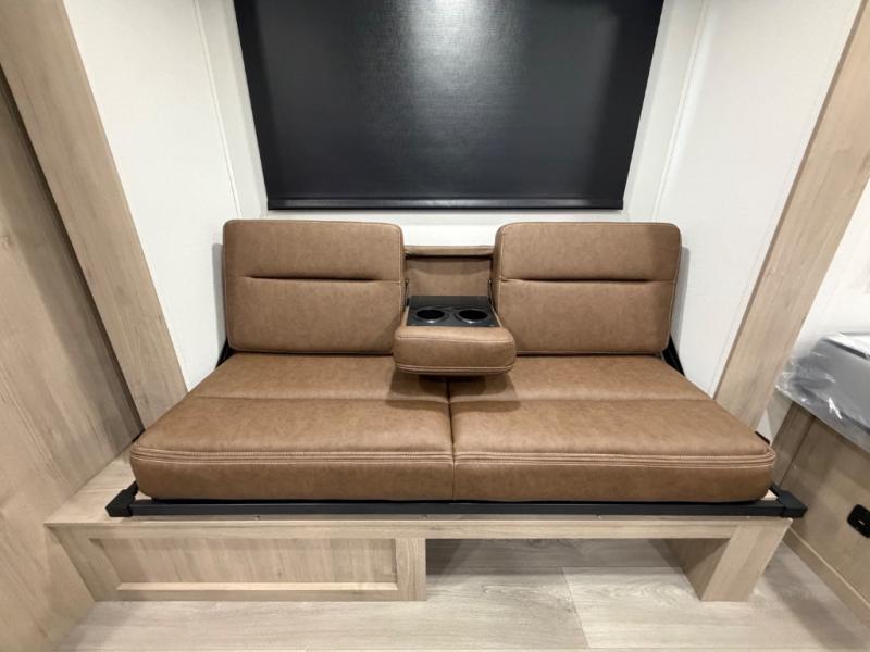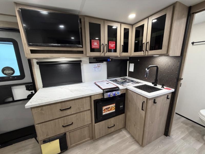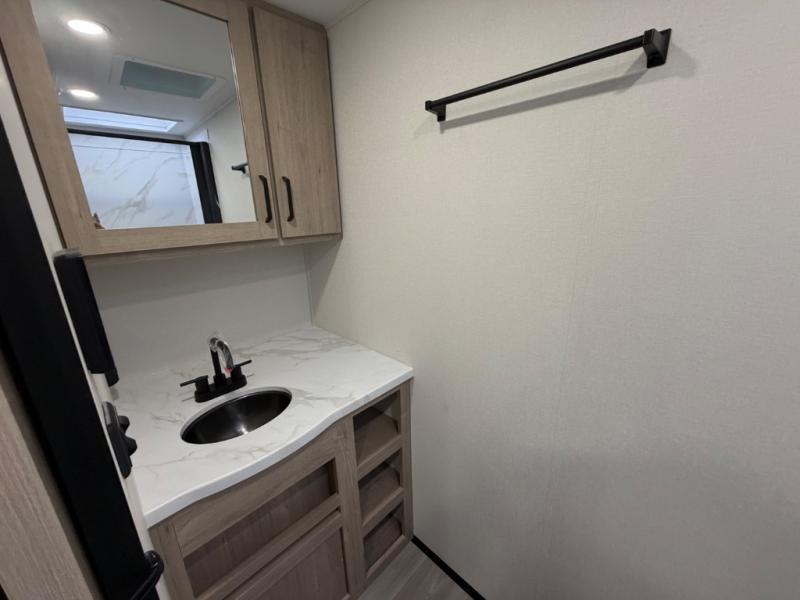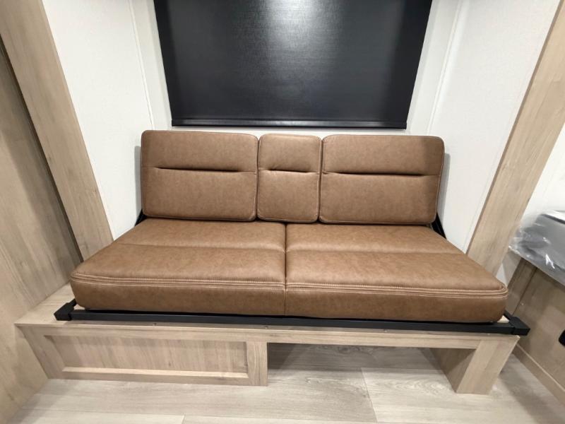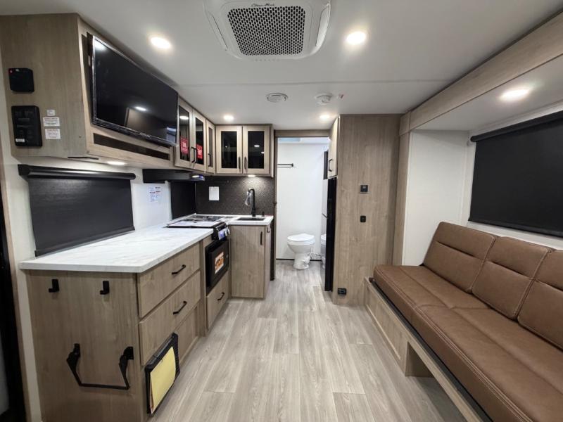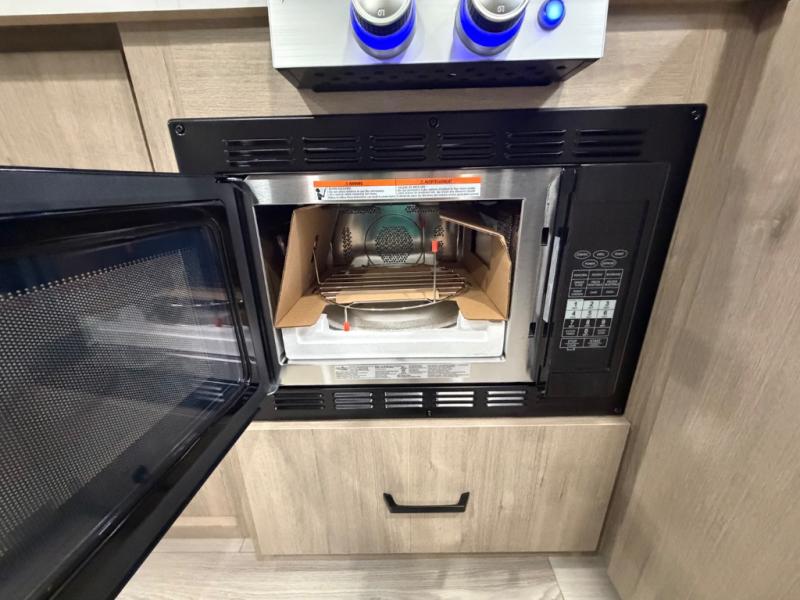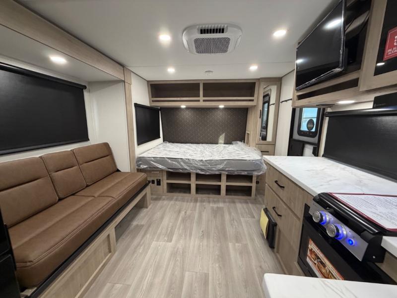 Pack your bags and head out on a fun camping trip in this travel trailer! The front queen bed offers a comfortable place to sleep at night, as well as the roll-over sleeper sofa slide with shoe storage. You can make meals on the cooktop or in the convection microwave. The full rear bathroom has a walk-in shower with an oversized vanity to easily get ready each day. Outside, you'll find a spray port, an unobstructed pass-thru storage, and an interior/exterior table to use at your convenience.