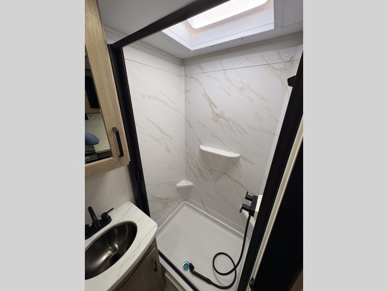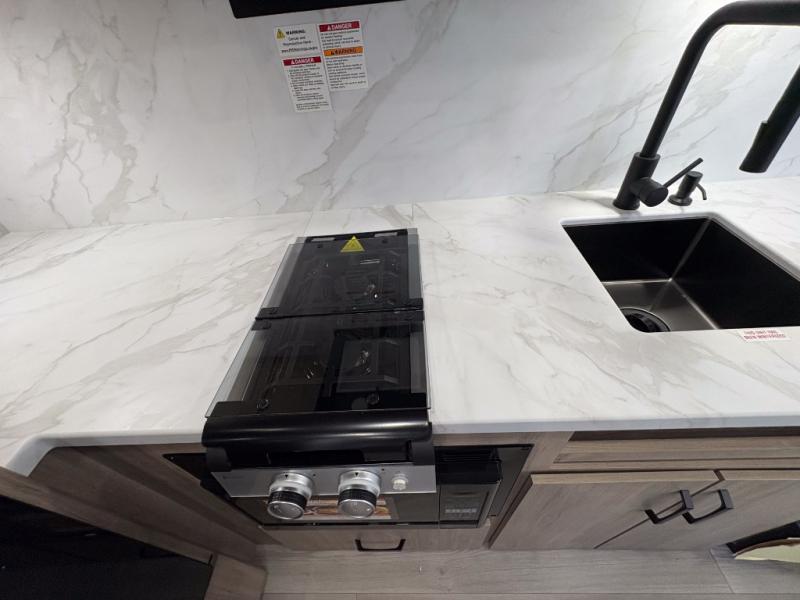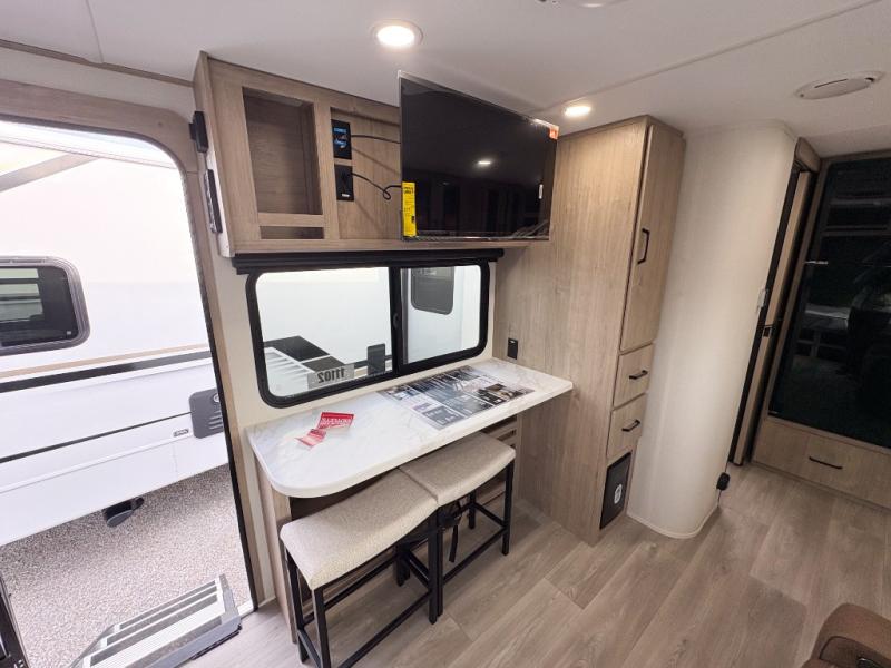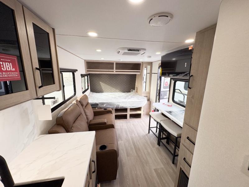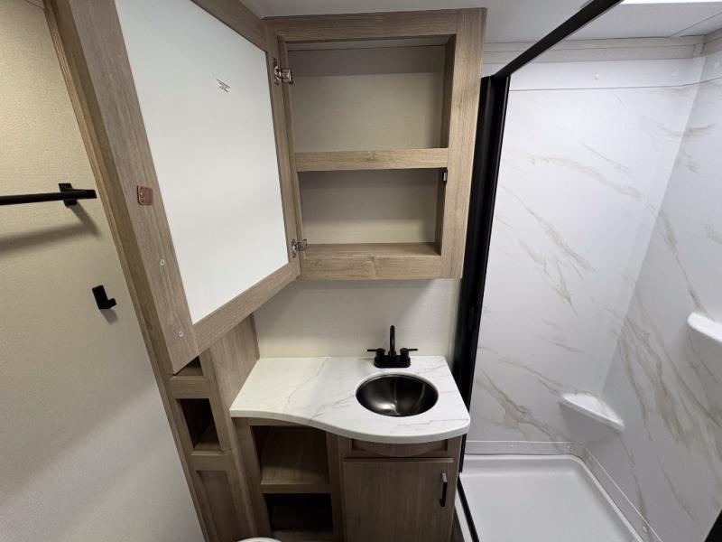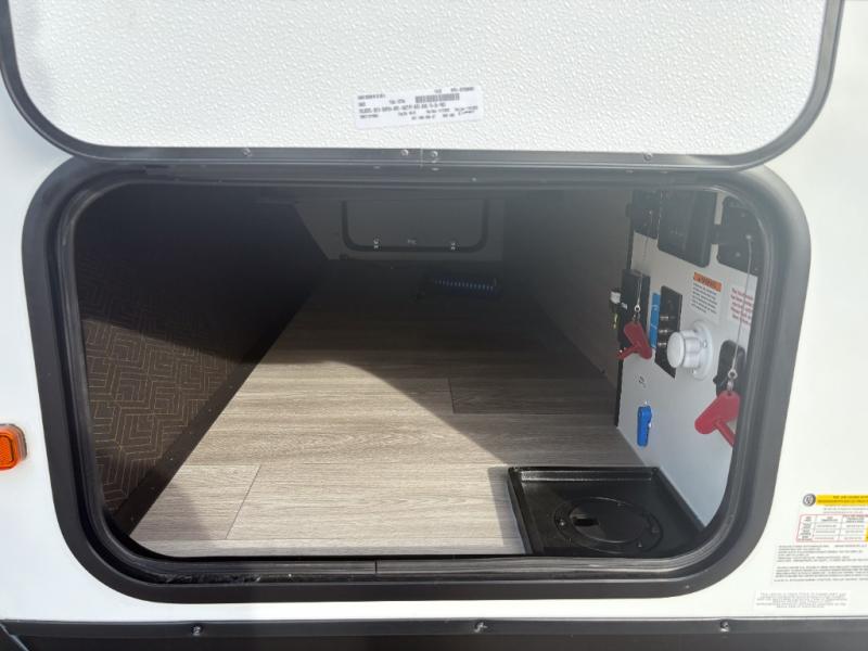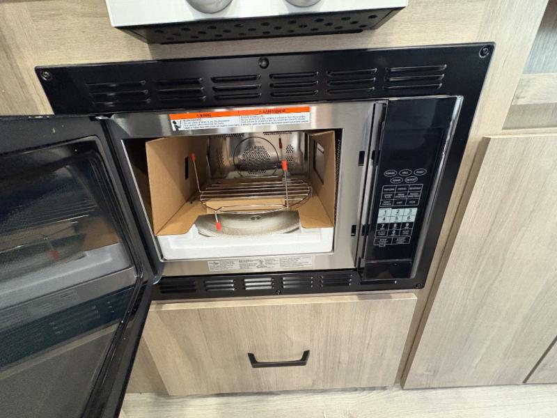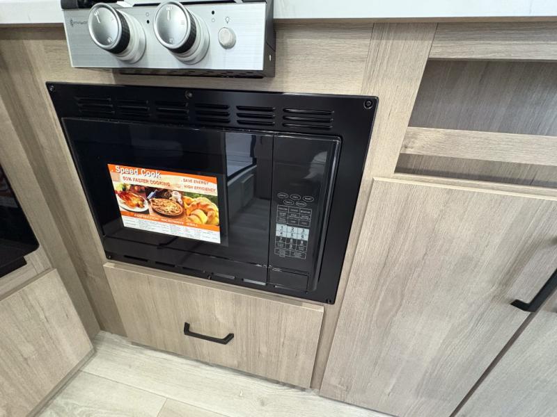 Pack your bags and head out on a fun camping trip in this travel trailer! The front queen bed offers a comfortable place to sleep at after taking off your footwear and place them in the shoe storage. You can make meals on the cooktop or in the convection microwave. The full rear corner bathroom has a walk-in shower with an oversized vanity to easily get ready each day. Outside, you'll find a spray port, an unobstructed pass-thru storage, and an interior/exterior table to use at your convenience.