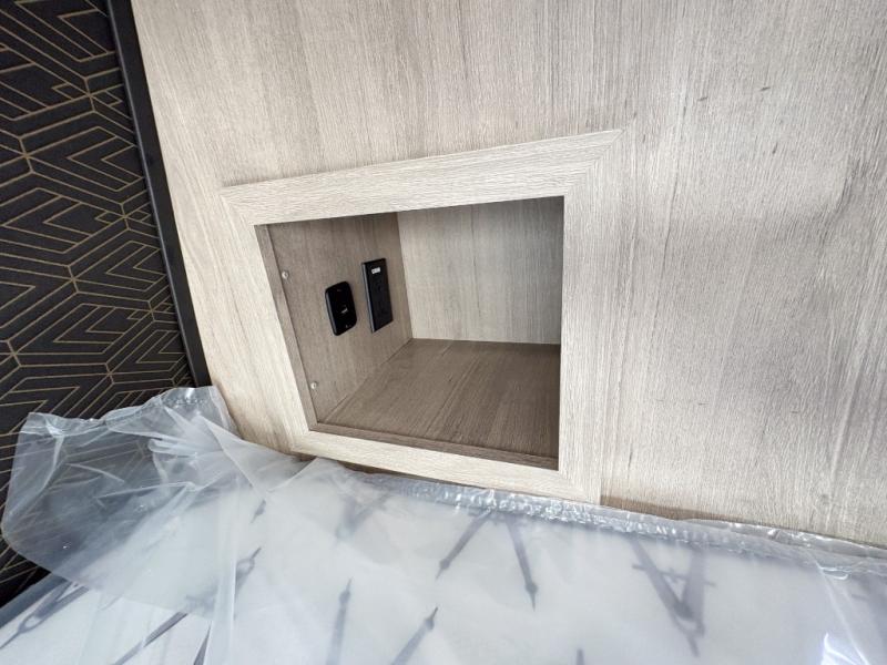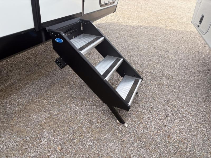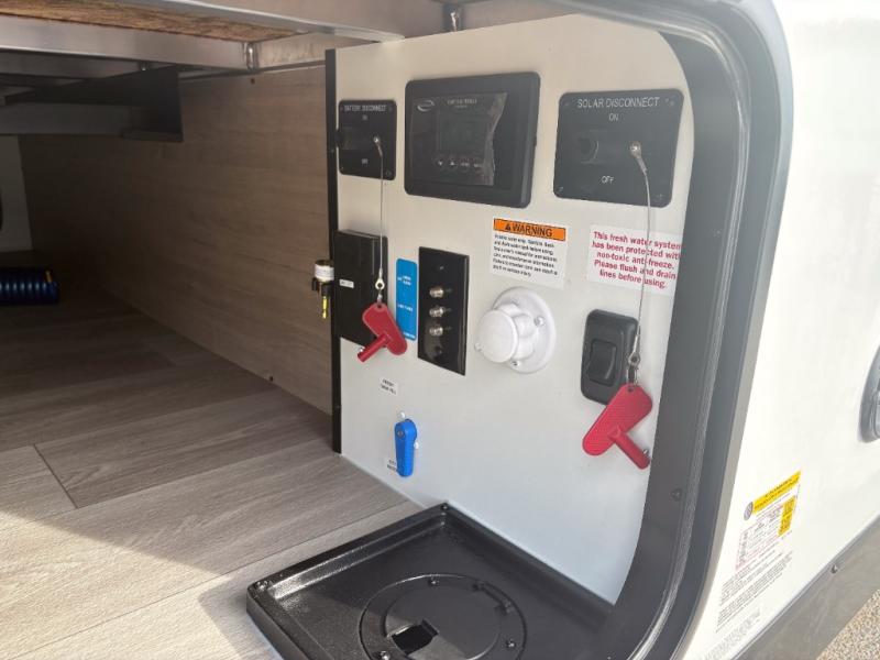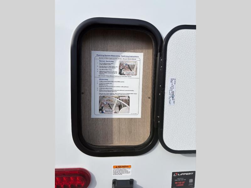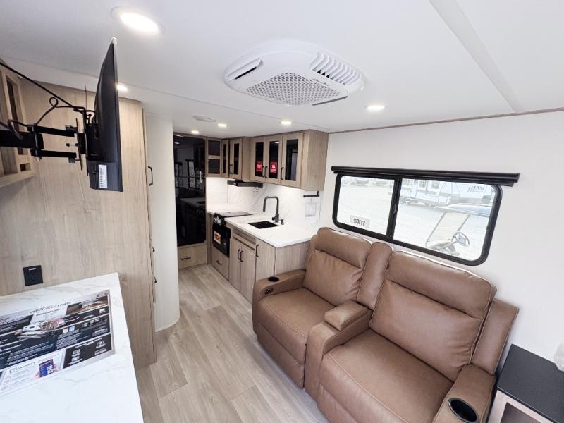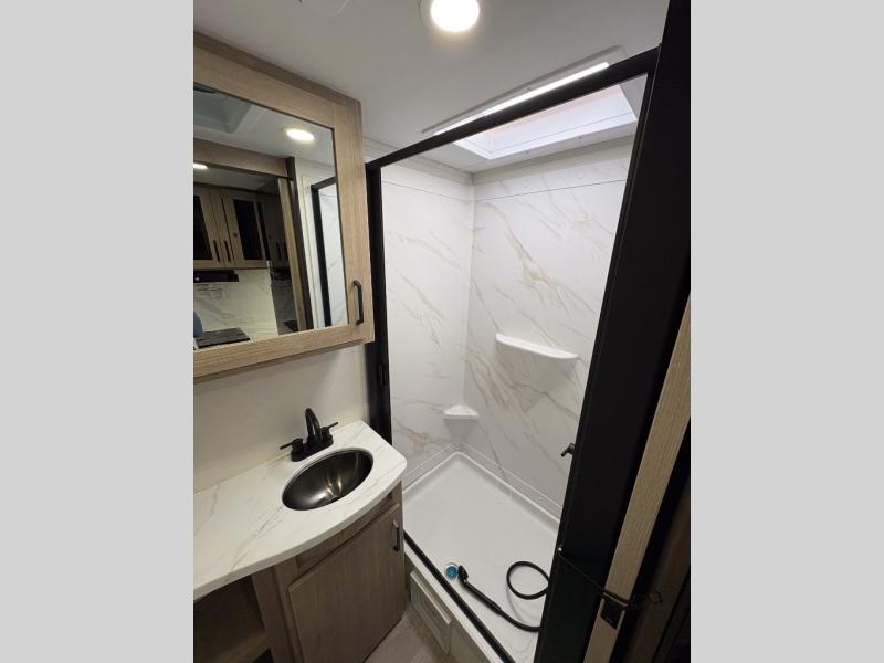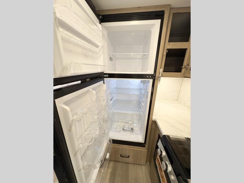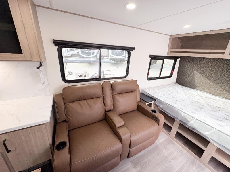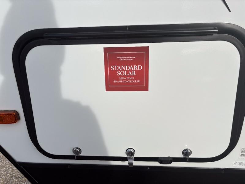 Pack your bags and head out on a fun camping trip in this travel trailer! The front queen bed offers a comfortable place to sleep at after taking off your footwear and place them in the shoe storage. You can make meals on the cooktop or in the convection microwave. The full rear corner bathroom has a walk-in shower with an oversized vanity to easily get ready each day. Outside, you'll find a spray port, an unobstructed pass-thru storage, and an interior/exterior table to use at your convenience.