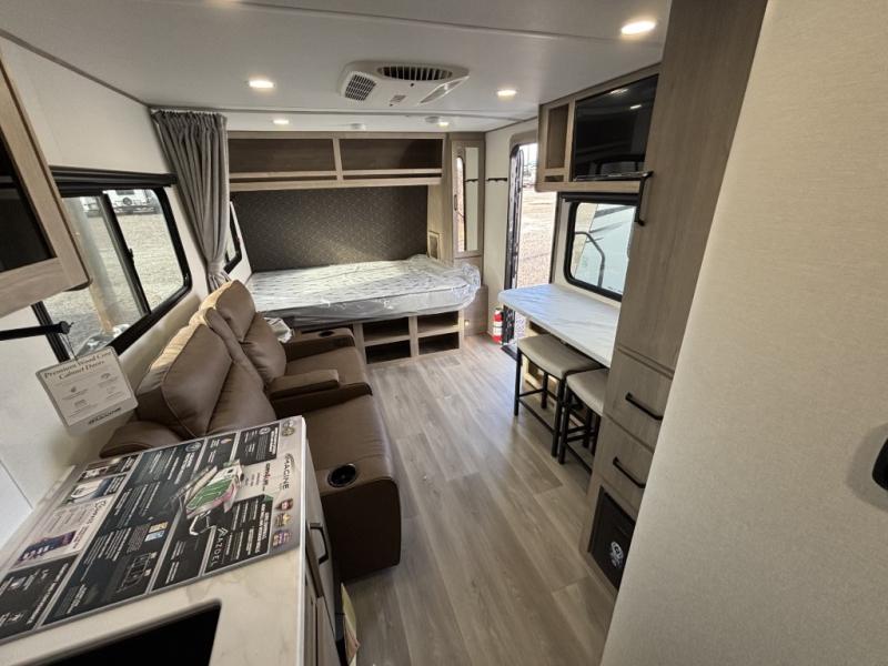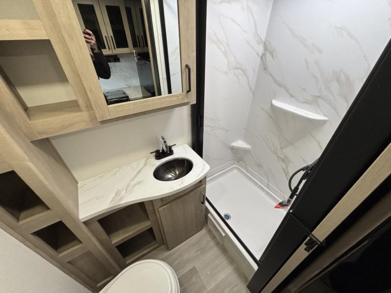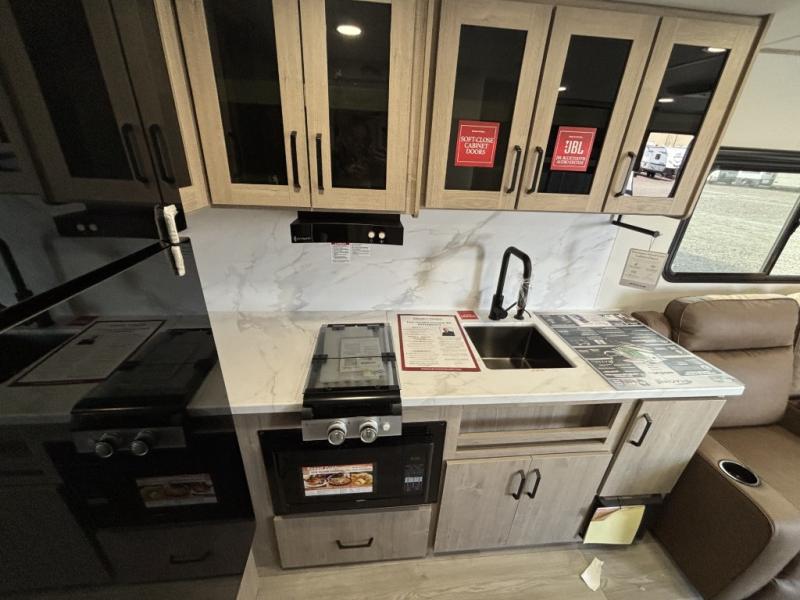 Pack your bags and head out on a fun camping trip in this travel trailer! The front queen bed offers a comfortable place to sleep at after taking off your footwear and place them in the shoe storage. You can make meals on the cooktop or in the convection microwave. The full rear corner bathroom has a walk-in shower with an oversized vanity to easily get ready each day. Outside, you'll find a spray port, an unobstructed pass-thru storage, and an interior/exterior table to use at your convenience.