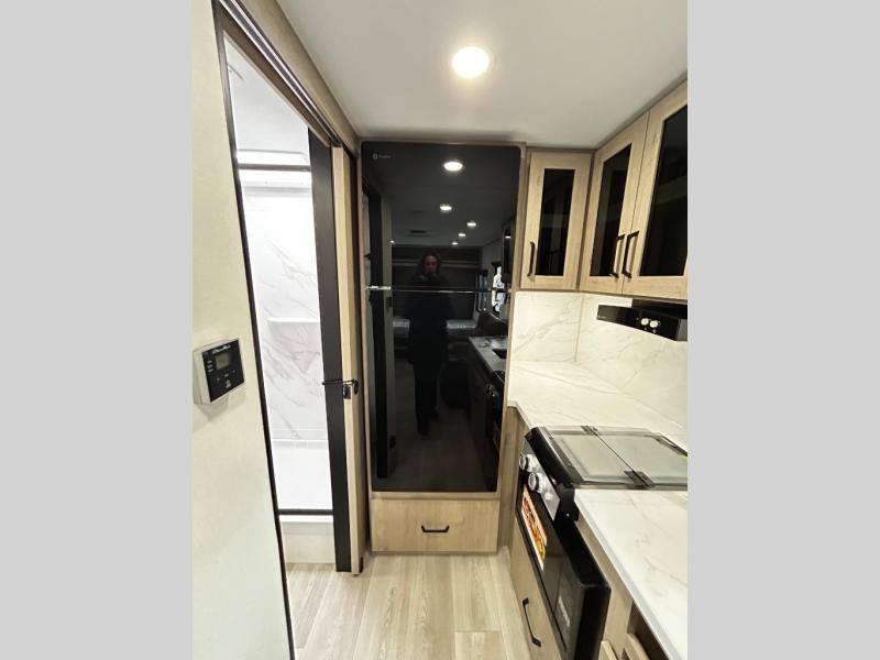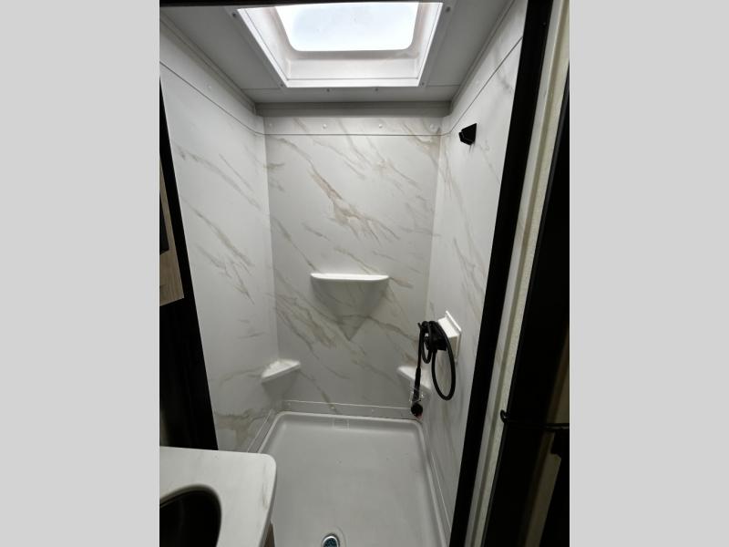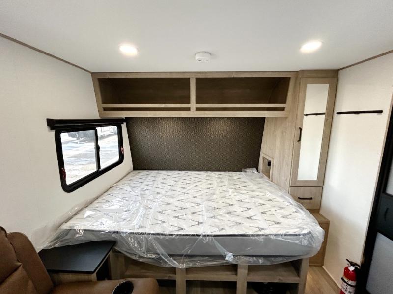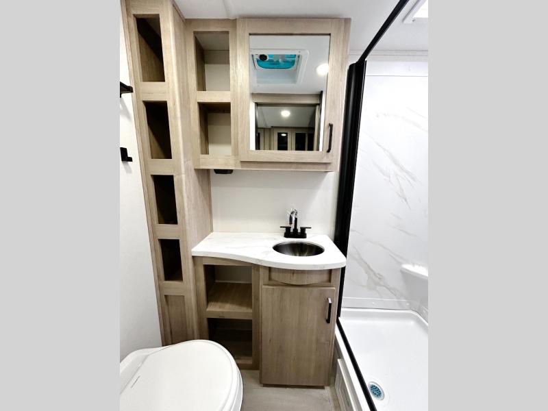 Pack your bags and head out on a fun camping trip in this travel trailer! The front queen bed offers a comfortable place to sleep at after taking off your footwear and place them in the shoe storage. You can make meals on the cooktop or in the convection microwave. The full rear corner bathroom has a walk-in shower with an oversized vanity to easily get ready each day. Outside, you'll find a spray port, an unobstructed pass-thru storage, and an interior/exterior table to use at your convenience.