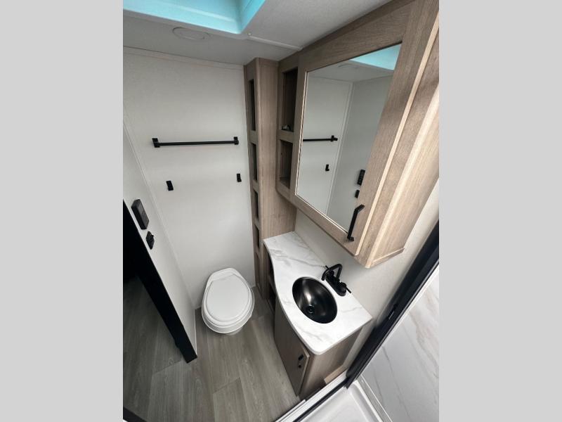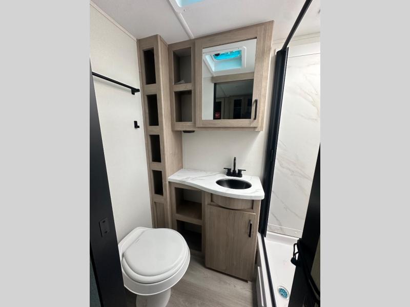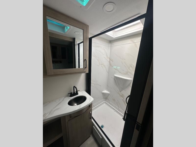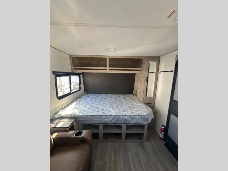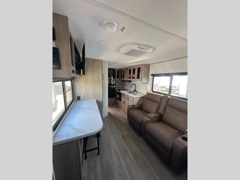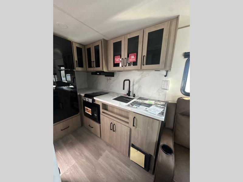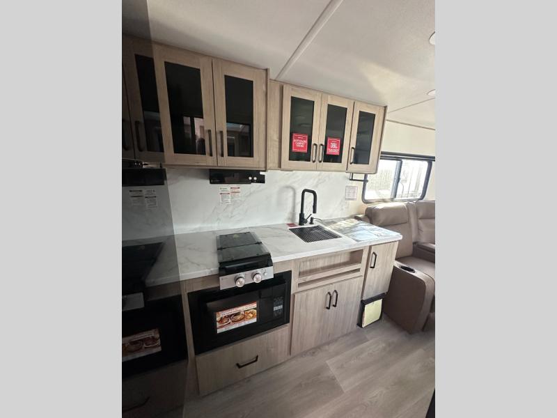 Pack your bags and head out on a fun camping trip in this travel trailer! The front queen bed offers a comfortable place to sleep at after taking off your footwear and place them in the shoe storage. You can make meals on the cooktop or in the convection microwave. The full rear corner bathroom has a walk-in shower with an oversized vanity to easily get ready each day. Outside, you'll find a spray port, an unobstructed pass-thru storage, and an interior/exterior table to use at your convenience.