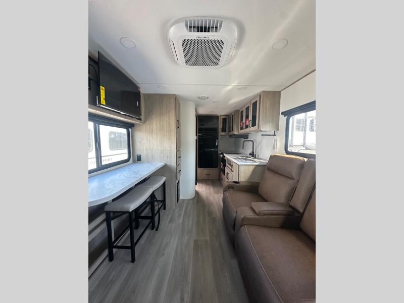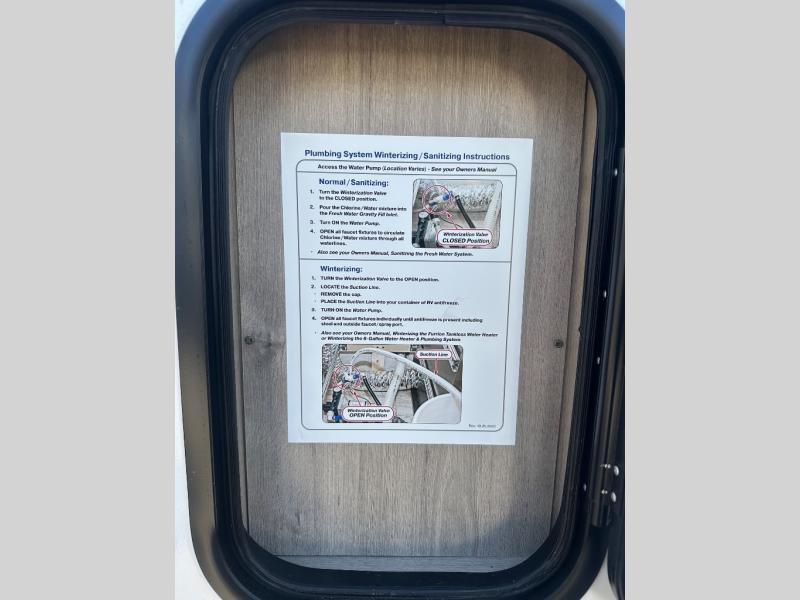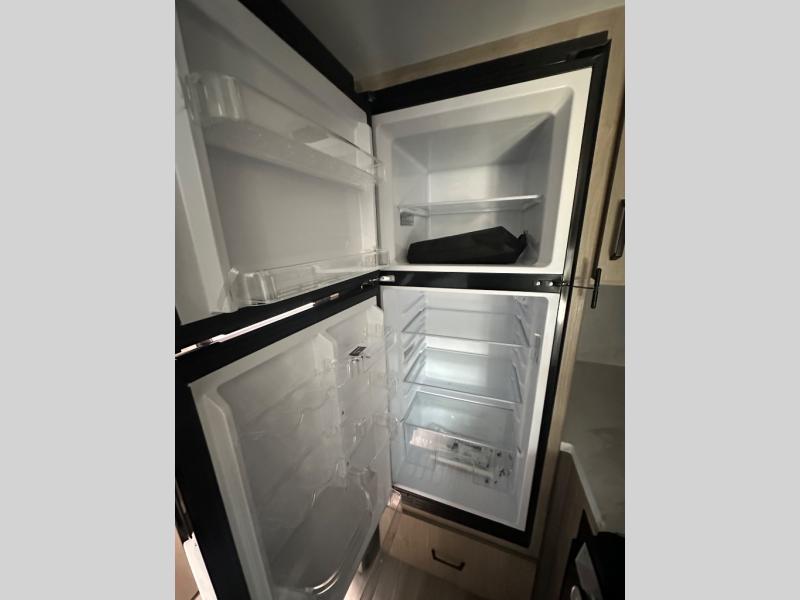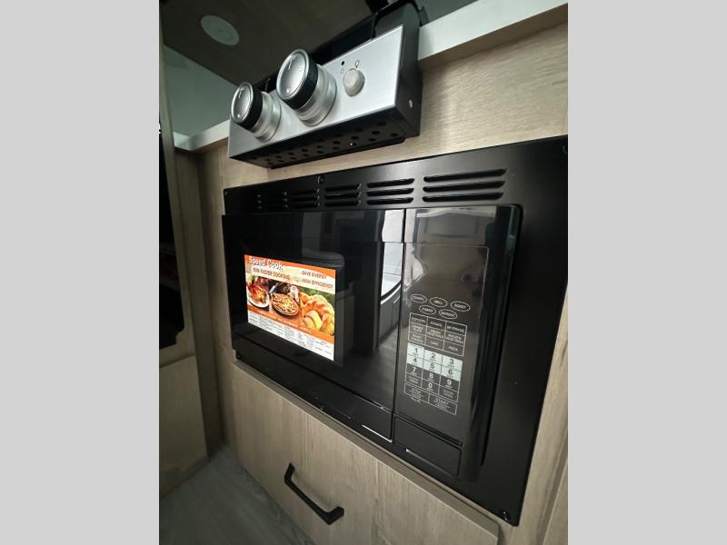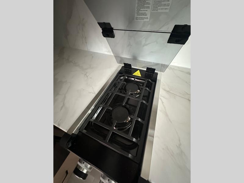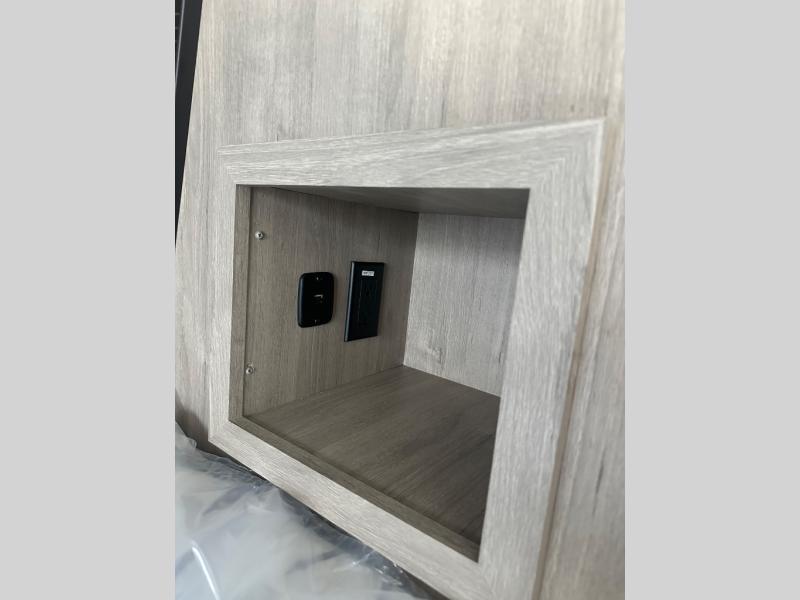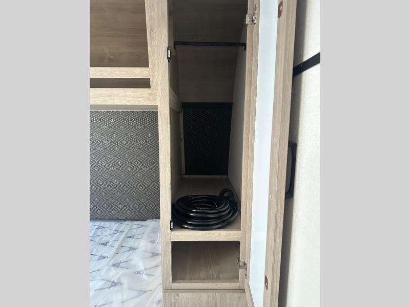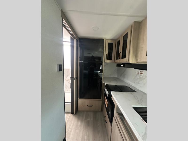 Pack your bags and head out on a fun camping trip in this travel trailer! The front queen bed offers a comfortable place to sleep at after taking off your footwear and place them in the shoe storage. You can make meals on the cooktop or in the convection microwave. The full rear corner bathroom has a walk-in shower with an oversized vanity to easily get ready each day. Outside, you'll find a spray port, an unobstructed pass-thru storage, and an interior/exterior table to use at your convenience.