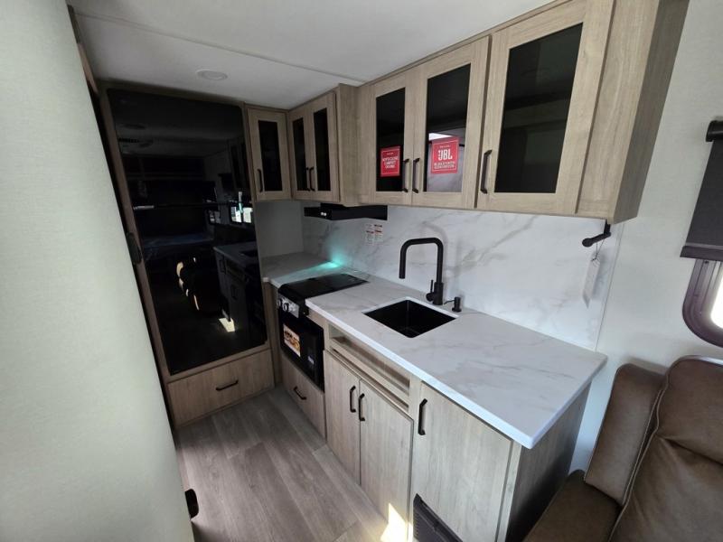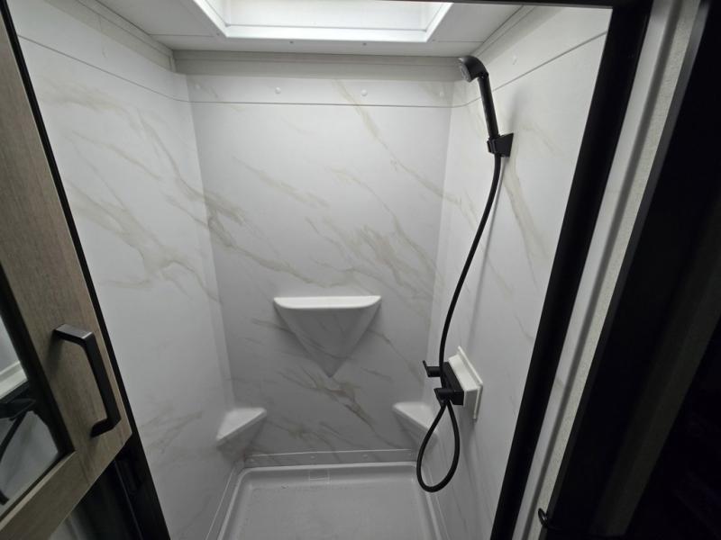 Pack your bags and head out on a fun camping trip in this travel trailer! The front queen bed offers a comfortable place to sleep at after taking off your footwear and place them in the shoe storage. You can make meals on the cooktop or in the convection microwave. The full rear corner bathroom has a walk-in shower with an oversized vanity to easily get ready each day. Outside, you'll find a spray port, an unobstructed pass-thru storage, and an interior/exterior table to use at your convenience.