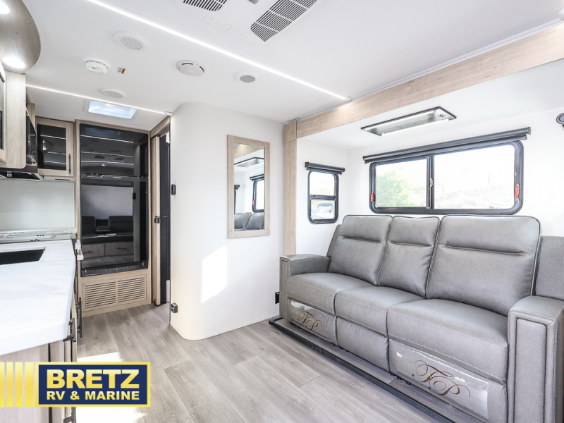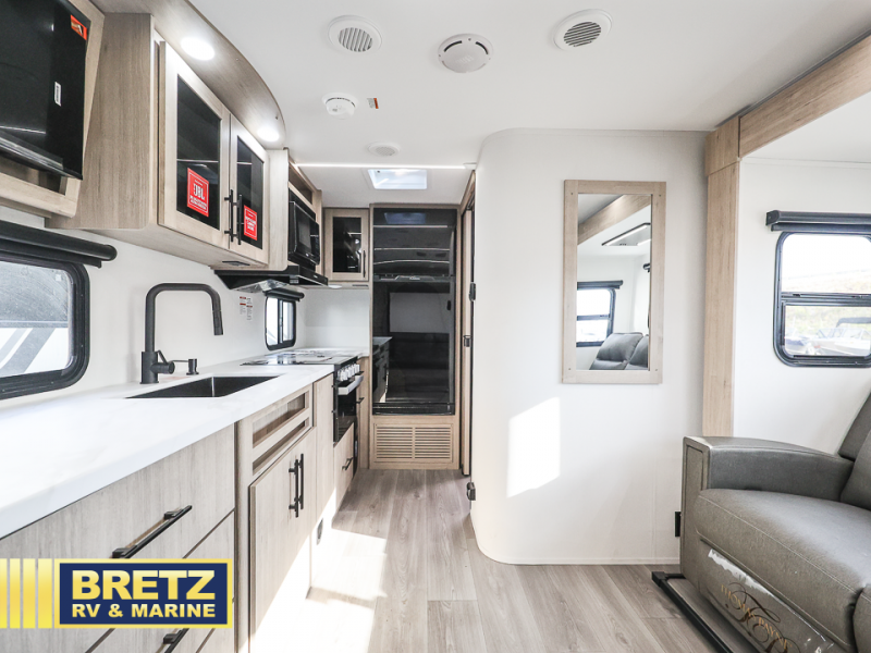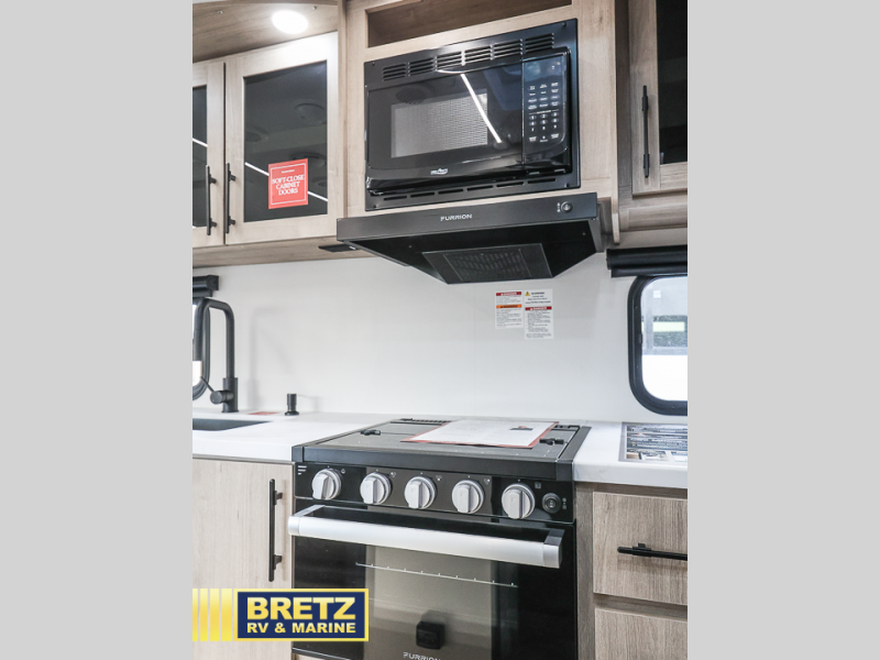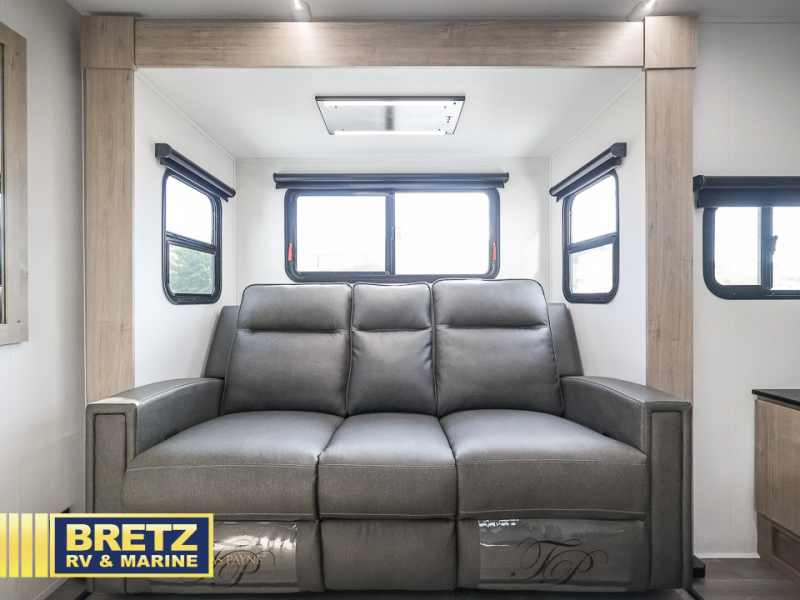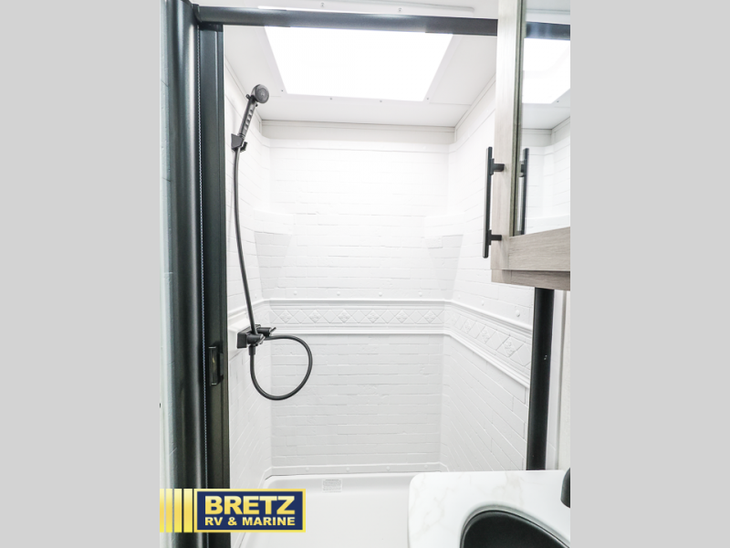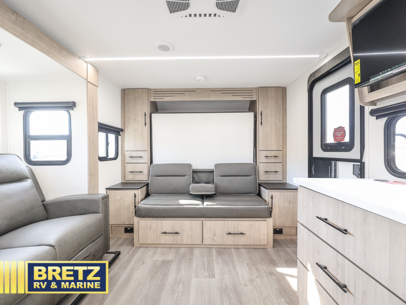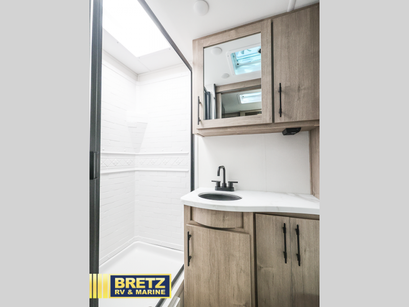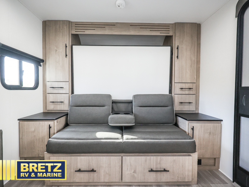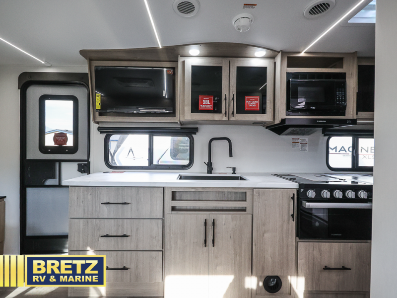 The Murphy bed is the eye-catching feature on this Imagine XLS travel trailer! Not only can it fold away in the morning to reveal a sofa for lounging, but it will also provide you with drawer storage under the sofa. Another functional feature is the theater dinette with a removable table in front or you can choose the optional U-shaped dinette if you like to gather around for game night. It rests on the single slide so that there is more floor space, and it offers you great comfort while you dine across from the LED HDTV. A full bathroom will keep you clean and fresh with its residential walk-in shower, skylight, linen closet, vanity, toilet, and power vent fan.