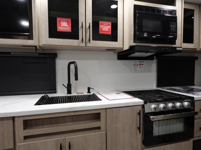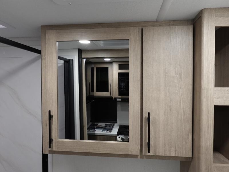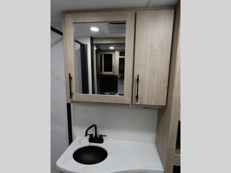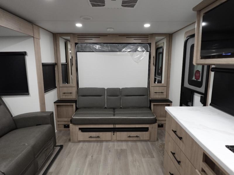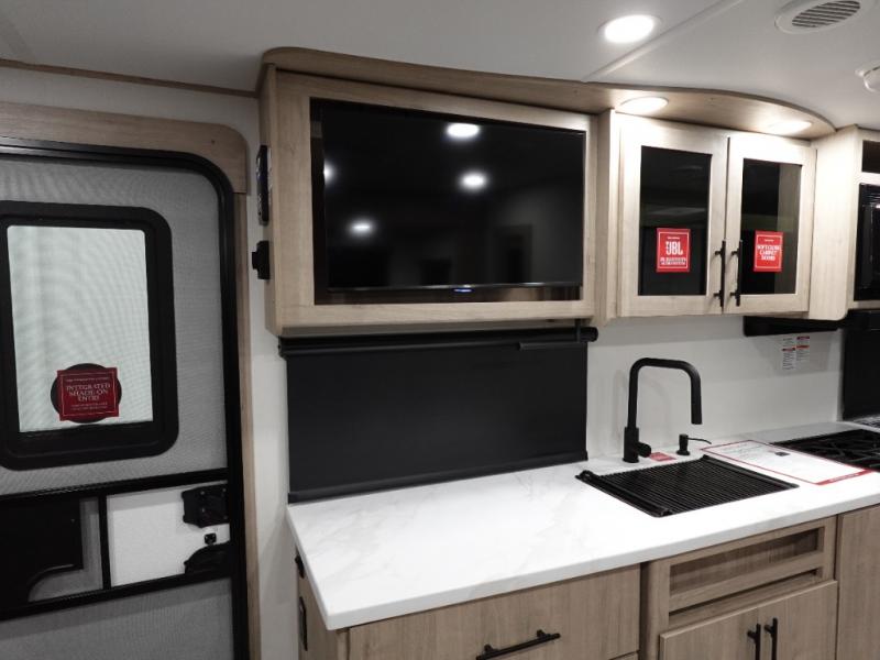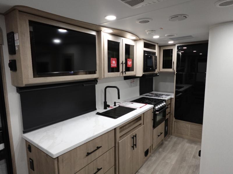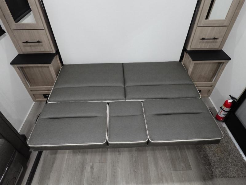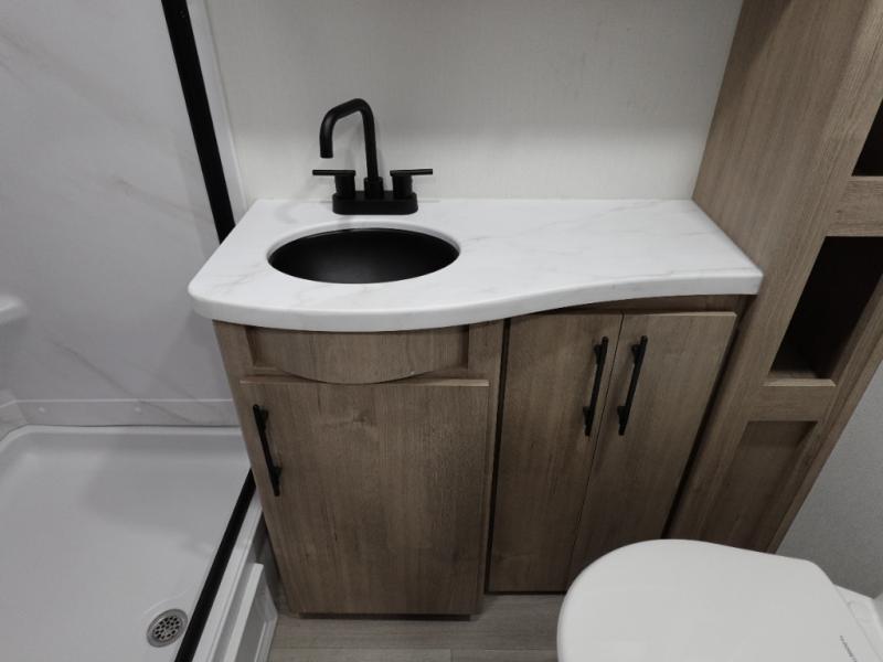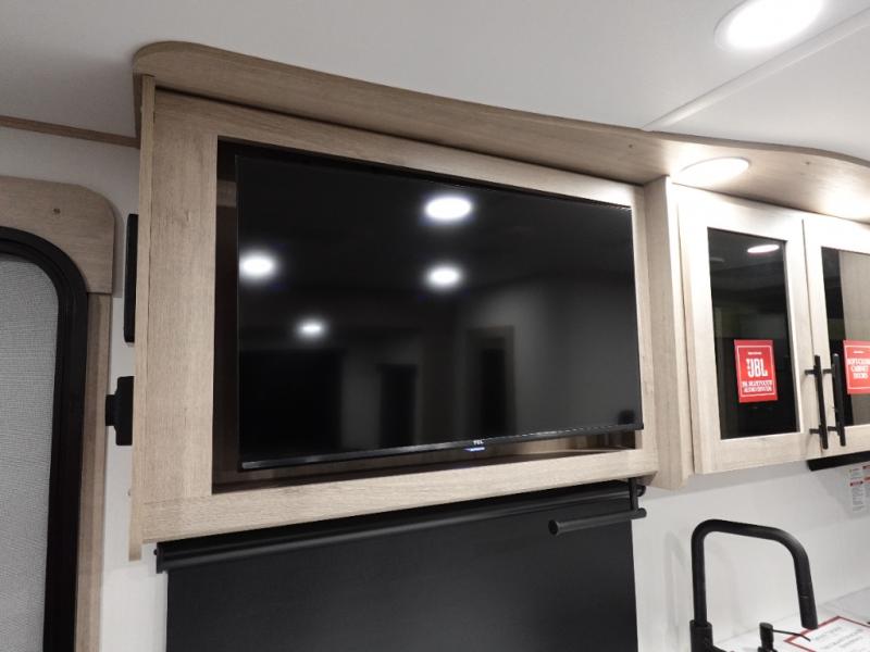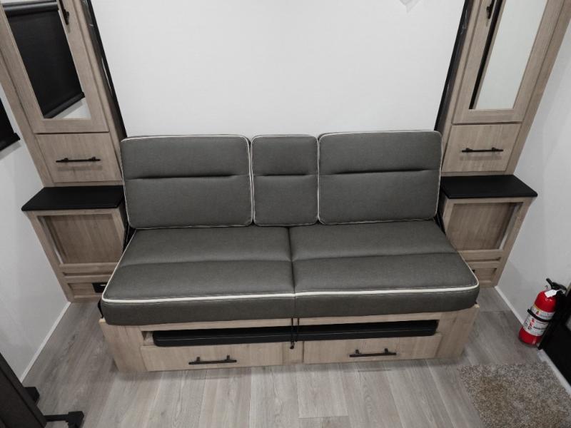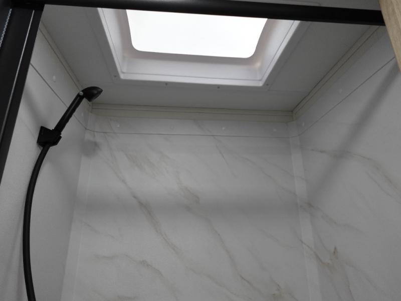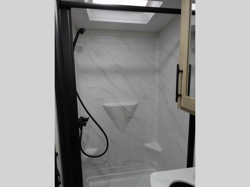 The Murphy bed is the eye-catching feature on this Imagine XLS travel trailer! Not only can it fold away in the morning to reveal a sofa for lounging, but it will also provide you with drawer storage under the sofa. Another functional feature is the theater dinette with a removable table in front for game night. It rests on the single slide so that there is more floor space, and it offers you great comfort while you dine across from the LED HDTV. A full bathroom will keep you clean and fresh with its residential walk-in shower, skylight, linen closet, vanity, toilet, and power vent fan.