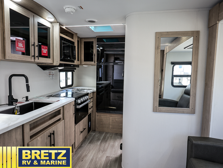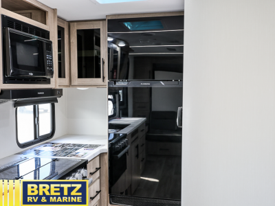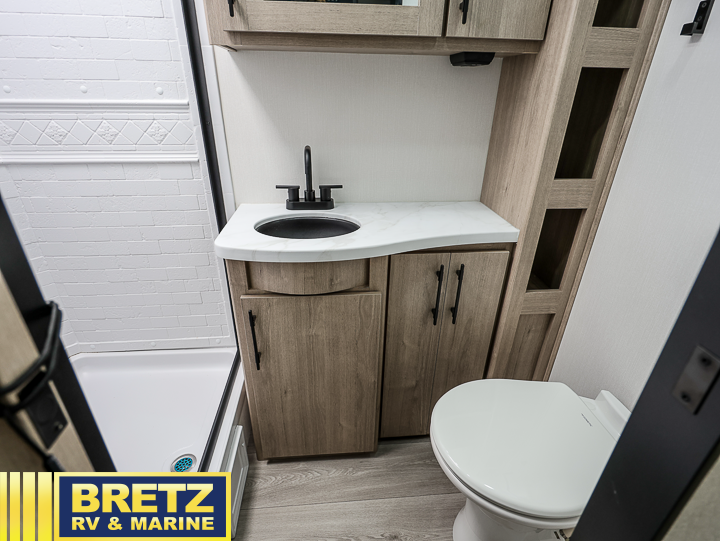 The Murphy bed is the eye-catching feature on this Imagine XLS travel trailer! Not only can it fold away in the morning to reveal a sofa for lounging, but it will also provide you with drawer storage under the sofa. Another functional feature is the theater dinette with a removable table in front or you can choose the optional U-shaped dinette if you like to gather around for game night. It rests on the single slide so that there is more floor space, and it offers you great comfort while you dine across from the LED HDTV. A full bathroom will keep you clean and fresh with its residential walk-in shower, skylight, linen closet, vanity, toilet, and power vent fan.