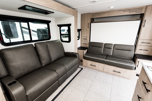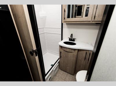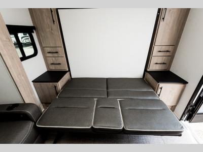 The Murphy bed is the eye-catching feature on this Imagine XLS travel trailer! Not only can it fold away in the morning to reveal a sofa for lounging, but it will also provide you with drawer storage under the sofa. Another functional feature is the theater dinette with a removable table in front or you can choose the optional U-shaped dinette if you like to gather around for game night. It rests on the single slide so that there is more floor space, and it offers you great comfort while you dine across from the LED HDTV. A full bathroom will keep you clean and fresh with its residential walk-in shower, skylight, linen closet, vanity, toilet, and power vent fan.
