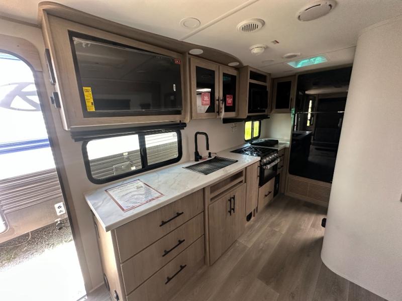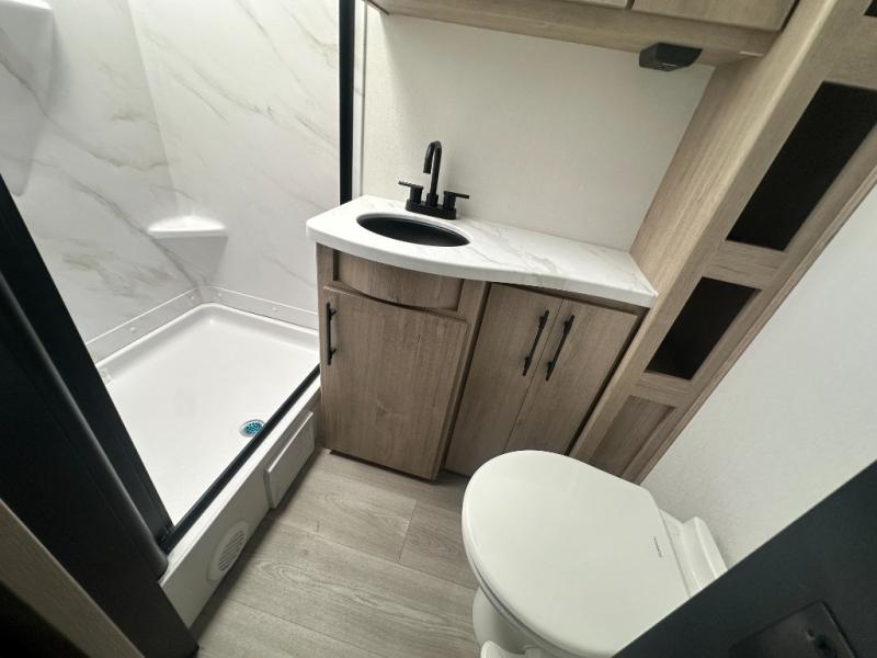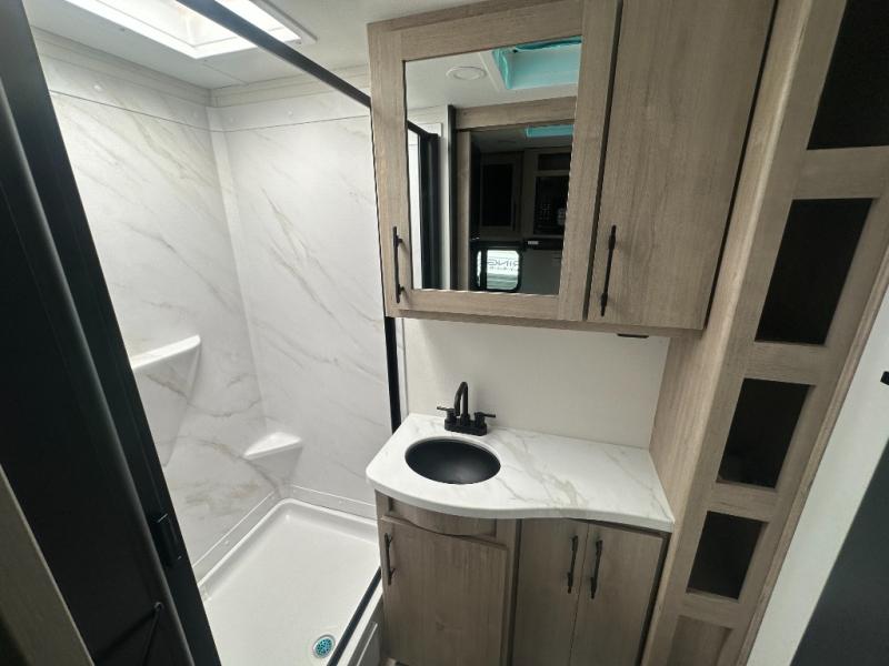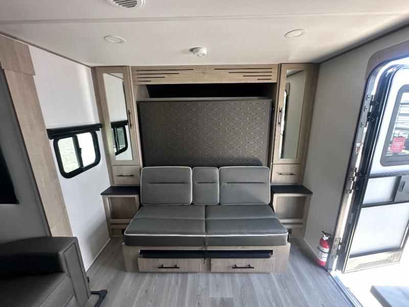 The Murphy bed is the eye-catching feature on this Imagine XLS travel trailer! Not only can it fold away in the morning to reveal a sofa for lounging, but it will also provide you with drawer storage under the sofa. Another functional feature is the theater dinette with a removable table in front or you can choose the optional U-shaped dinette if you like to gather around for game night. It rests on the single slide so that there is more floor space, and it offers you great comfort while you dine across from the LED HDTV. A full bathroom will keep you clean and fresh with its residential walk-in shower, skylight, linen closet, vanity, toilet, and power vent fan.