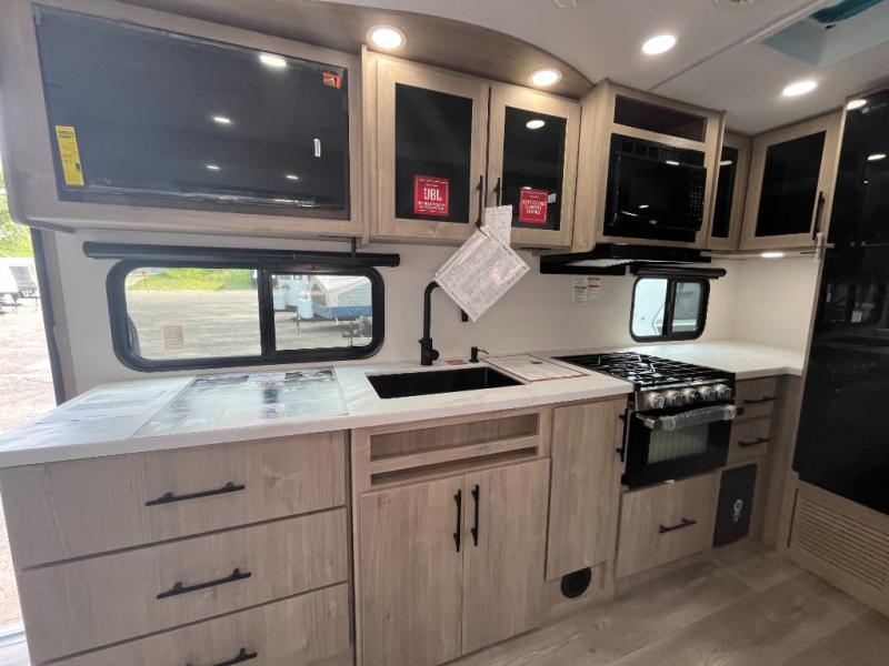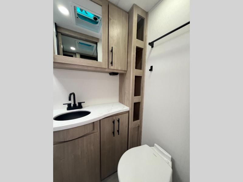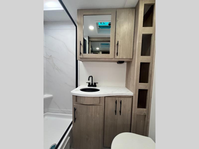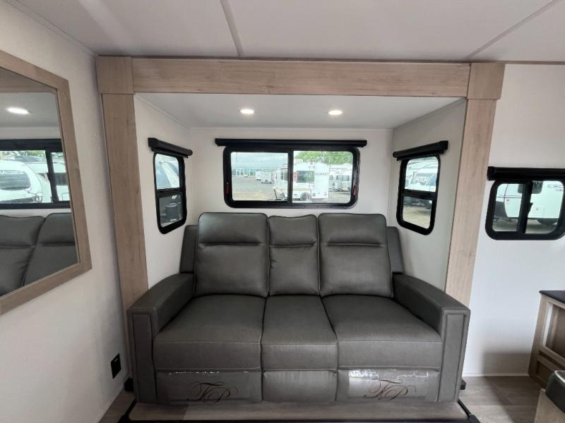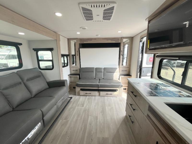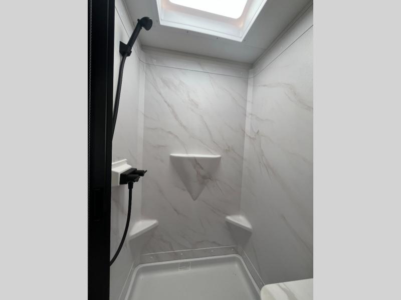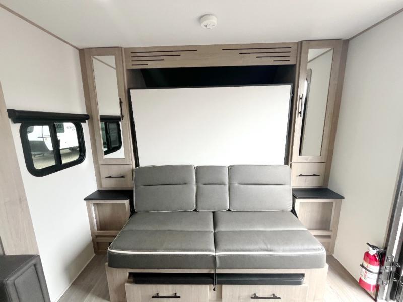 The Murphy bed is the eye-catching feature on this Imagine XLS travel trailer! Not only can it fold away in the morning to reveal a sofa for lounging, but it will also provide you with drawer storage under the sofa. Another functional feature is the theater dinette with a removable table in front or you can choose the optional U-shaped dinette if you like to gather around for game night. It rests on the single slide so that there is more floor space, and it offers you great comfort while you dine across from the LED HDTV. A full bathroom will keep you clean and fresh with its residential walk-in shower, skylight, linen closet, vanity, toilet, and power vent fan.