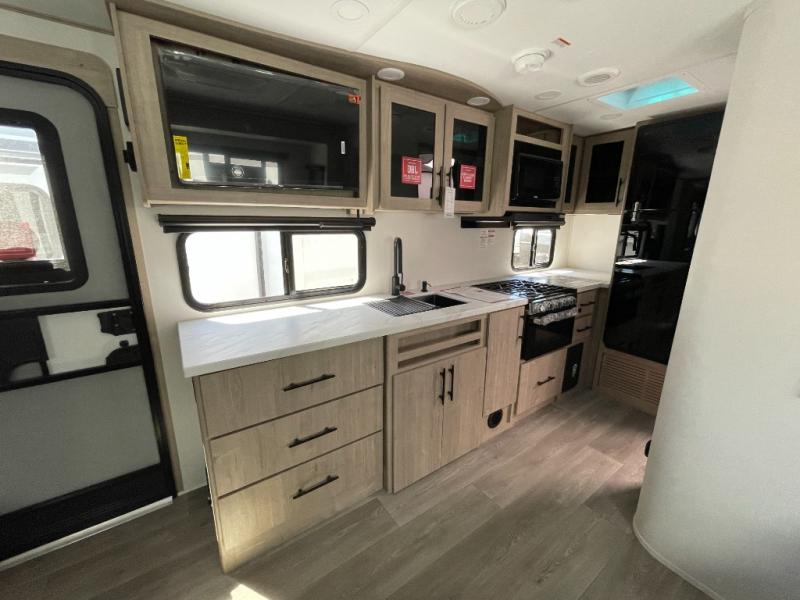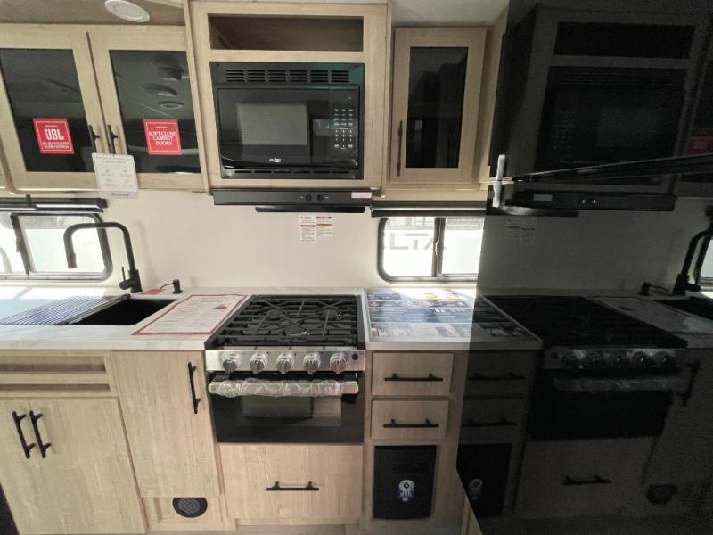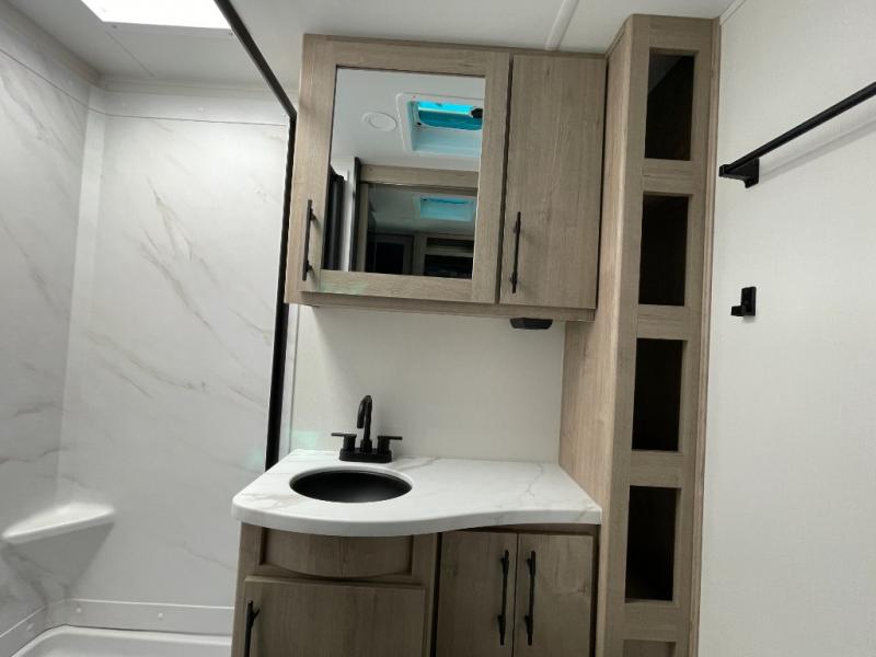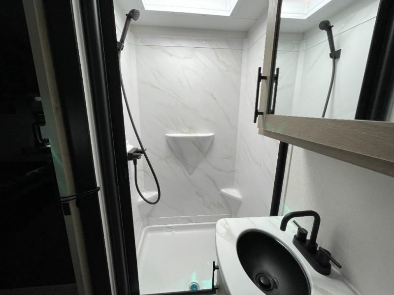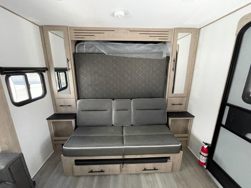 The Murphy bed is the eye-catching feature on this Imagine XLS travel trailer! Not only can it fold away in the morning to reveal a sofa for lounging, but it will also provide you with drawer storage under the sofa. Another functional feature is the theater dinette with a removable table in front or you can choose the optional U-shaped dinette if you like to gather around for game night. It rests on the single slide so that there is more floor space, and it offers you great comfort while you dine across from the LED HDTV. A full bathroom will keep you clean and fresh with its residential walk-in shower, skylight, linen closet, vanity, toilet, and power vent fan.