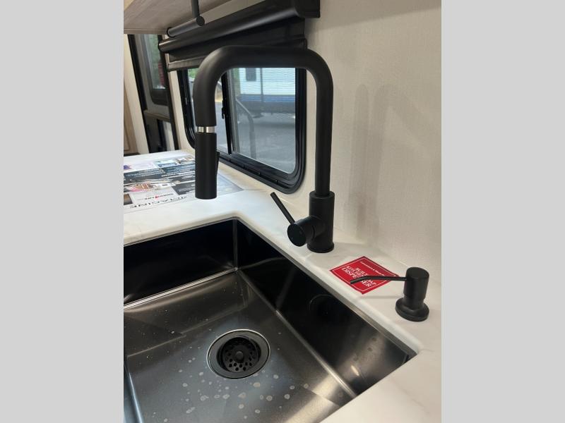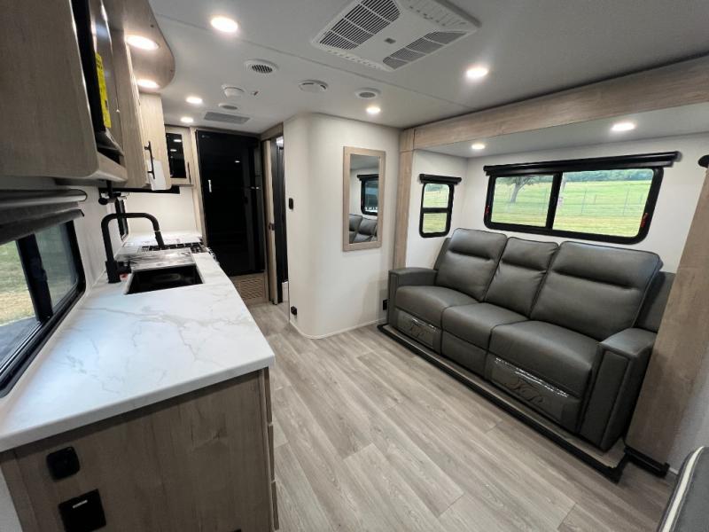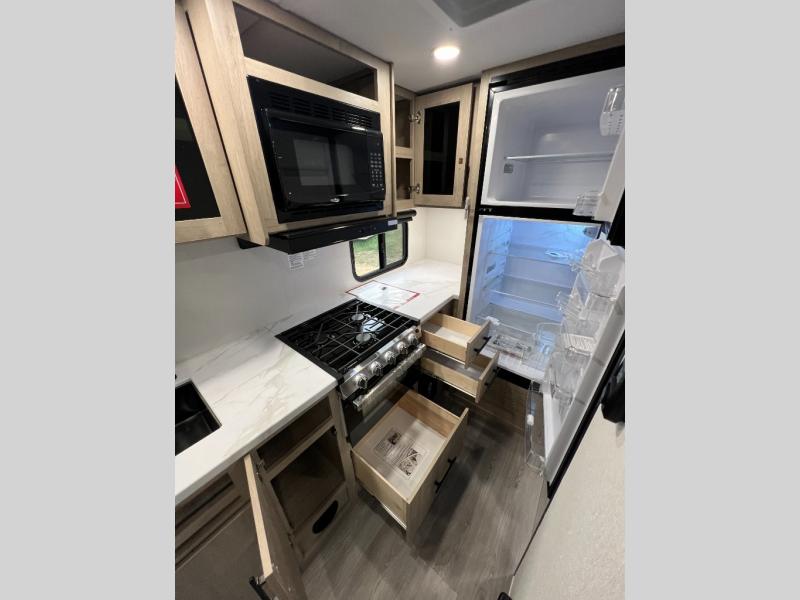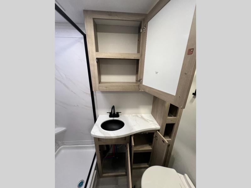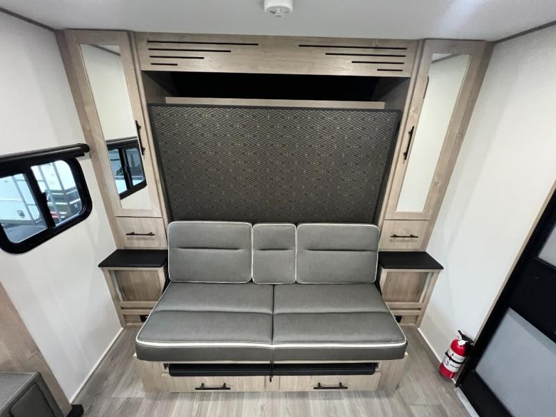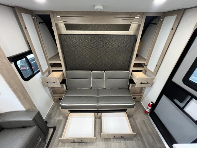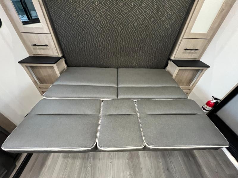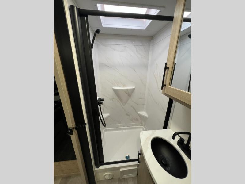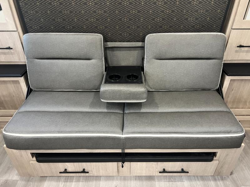 The Murphy bed is the eye-catching feature on this Imagine XLS travel trailer! Not only can it fold away in the morning to reveal a sofa for lounging, but it will also provide you with drawer storage under the sofa. Another functional feature is the theater dinette with a removable table in front or you can choose the optional U-shaped dinette if you like to gather around for game night. It rests on the single slide so that there is more floor space, and it offers you great comfort while you dine across from the LED HDTV. A full bathroom will keep you clean and fresh with its residential walk-in shower, skylight, linen closet, vanity, toilet, and power vent fan.