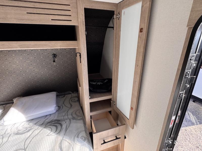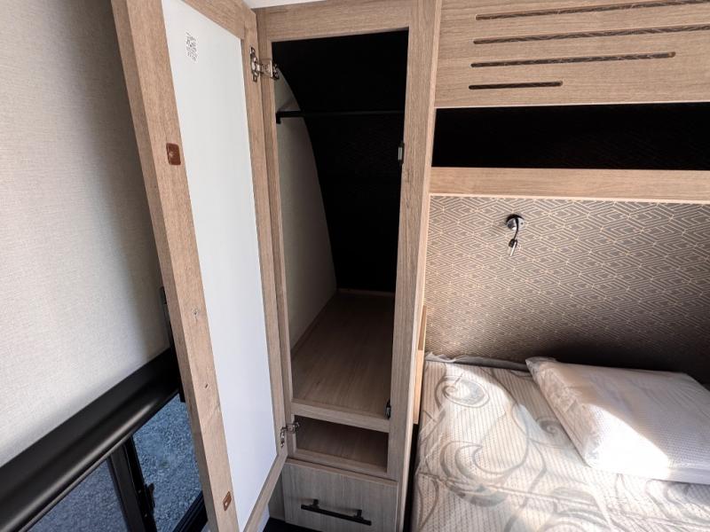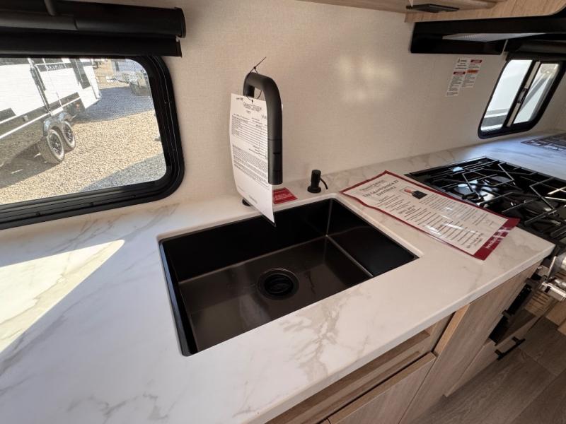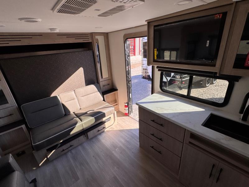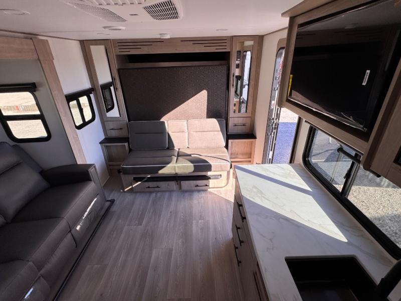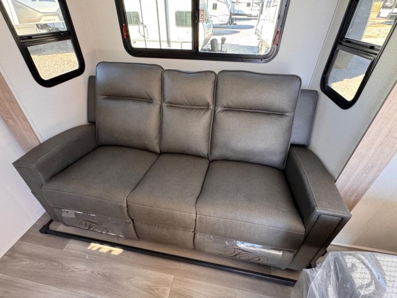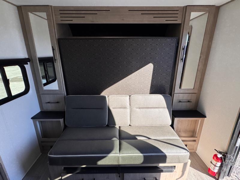The Murphy bed is the eye-catching feature on this Imagine XLS travel trailer! Not only can it fold away in the morning to reveal a sofa for lounging, but it will also provide you with drawer storage under the sofa. Another functional feature is the theater dinette with a removable table in front or you can choose the optional U-shaped dinette if you like to gather around for game night. It rests on the single slide so that there is more floor space, and it offers you great comfort while you dine across from the LED HDTV. A full bathroom will keep you clean and fresh with its residential walk-in shower, skylight, linen closet, vanity, toilet, and power vent fan.