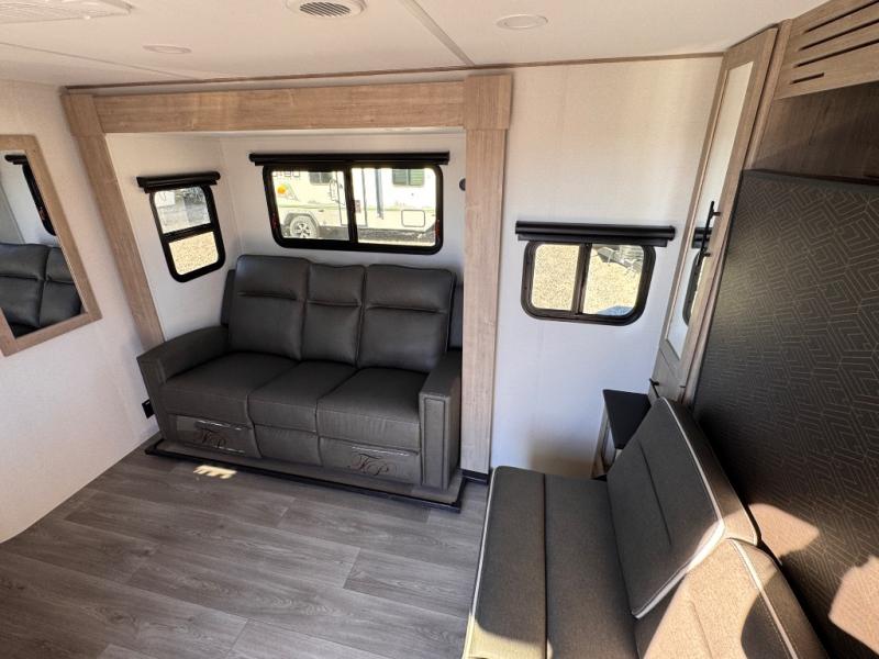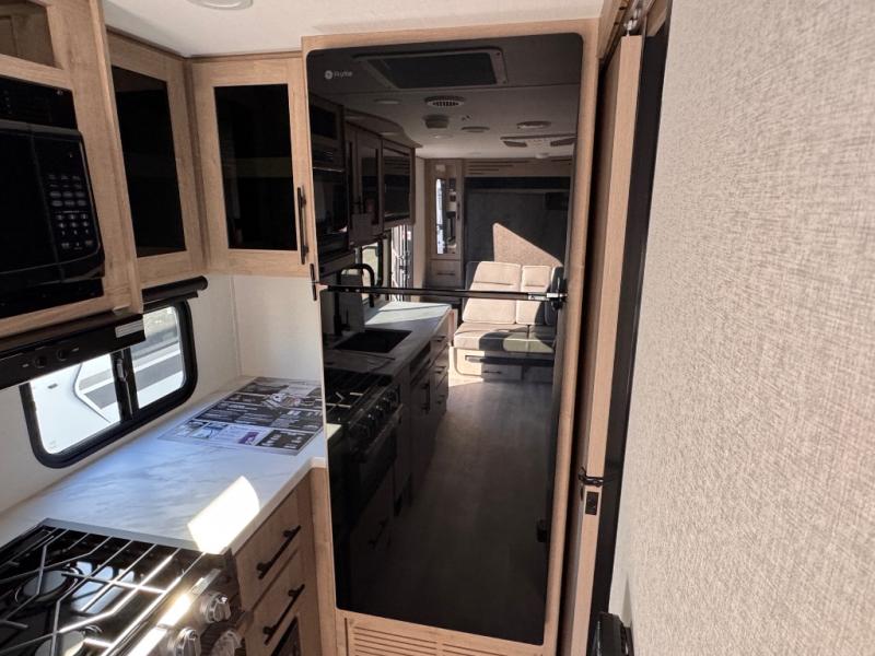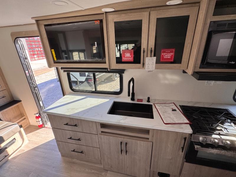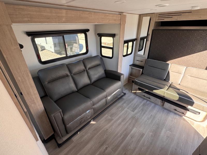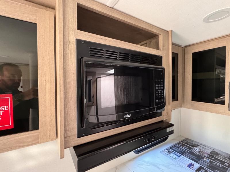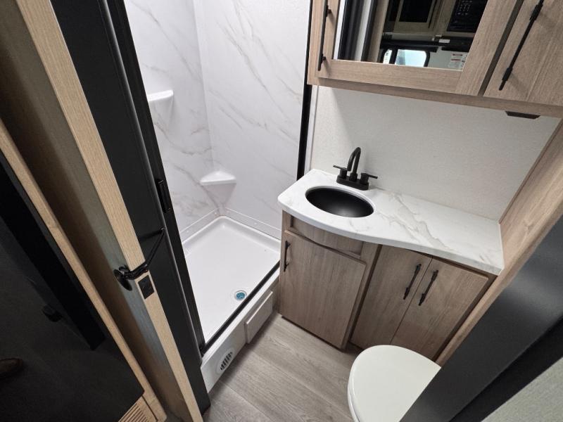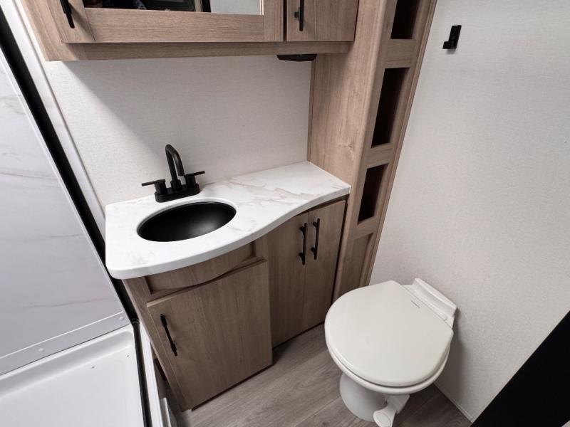 The Murphy bed is the eye-catching feature on this Imagine XLS travel trailer! Not only can it fold away in the morning to reveal a sofa for lounging, but it will also provide you with drawer storage under the sofa. Another functional feature is the theater dinette with a removable table in front or you can choose the optional U-shaped dinette if you like to gather around for game night. It rests on the single slide so that there is more floor space, and it offers you great comfort while you dine across from the LED HDTV. A full bathroom will keep you clean and fresh with its residential walk-in shower, skylight, linen closet, vanity, toilet, and power vent fan.