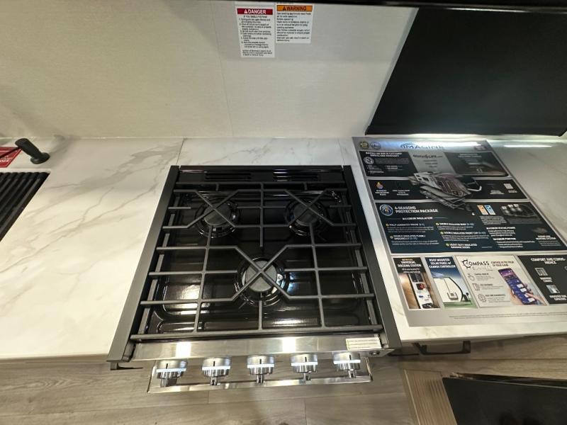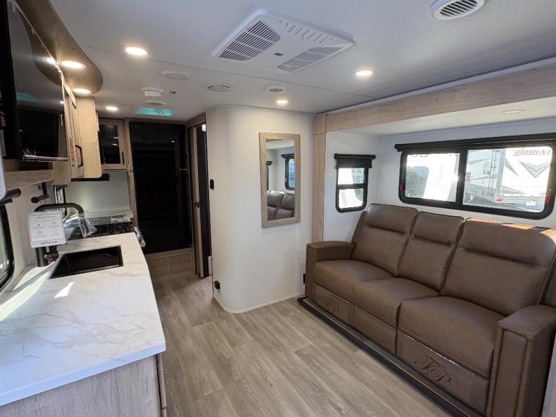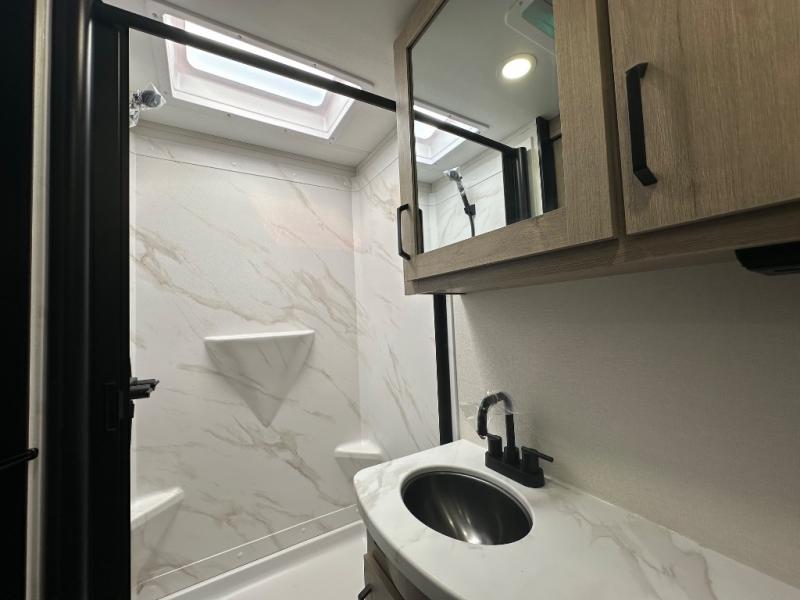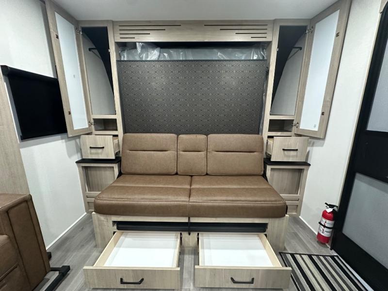 The Murphy bed is the eye-catching feature on this Imagine XLS travel trailer! Not only can it fold away in the morning to reveal a sofa for lounging, but it will also provide you with drawer storage under the sofa. Another functional feature is the theater dinette with a removable table in front or you can choose the optional U-shaped dinette if you like to gather around for game night. It rests on the single slide so that there is more floor space, and it offers you great comfort while you dine across from the LED HDTV. A full bathroom will keep you clean and fresh with its residential walk-in shower, skylight, linen closet, vanity, toilet, and power vent fan.
