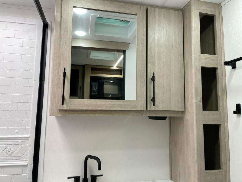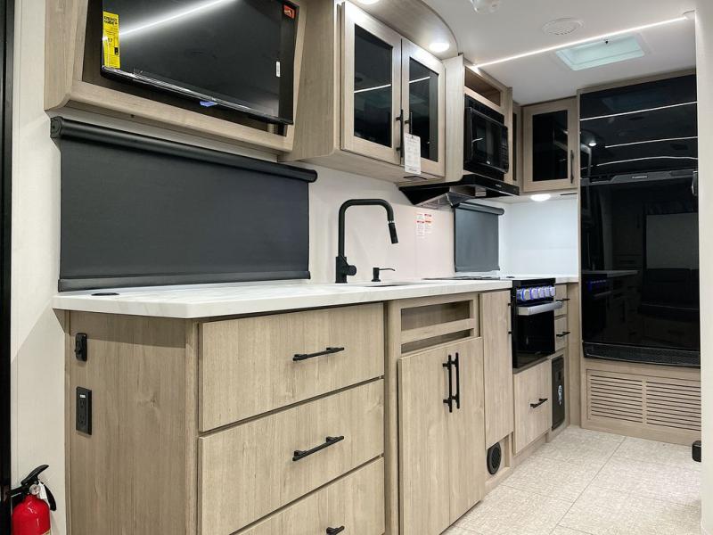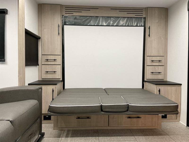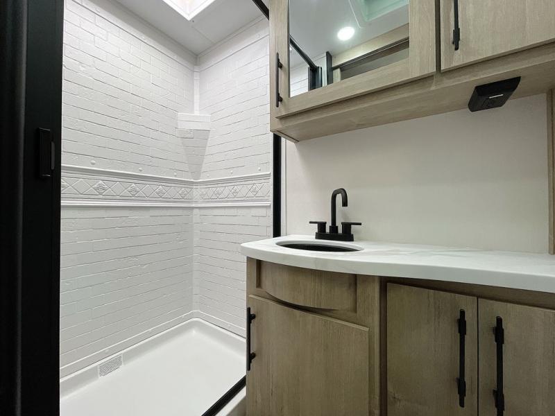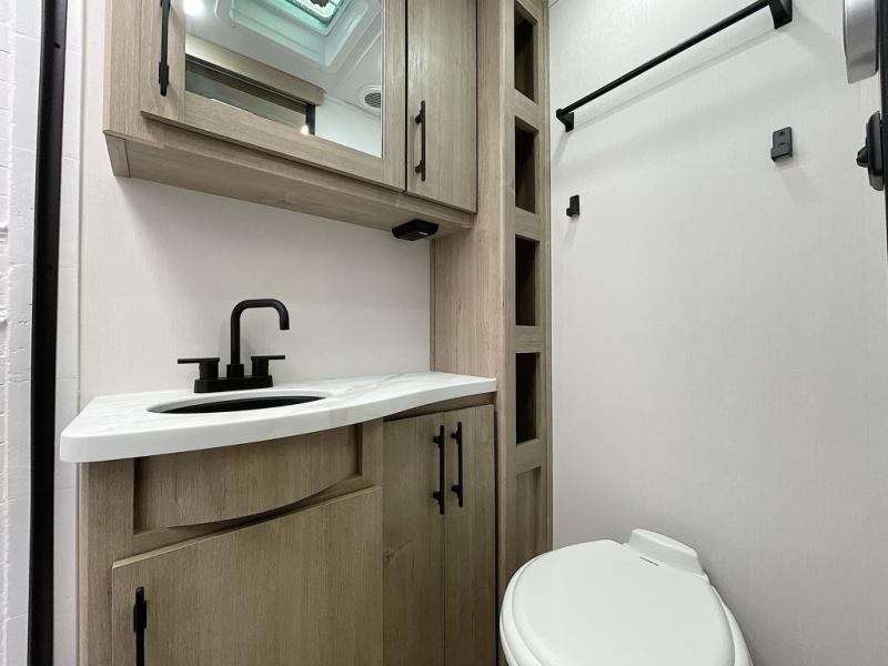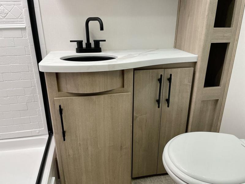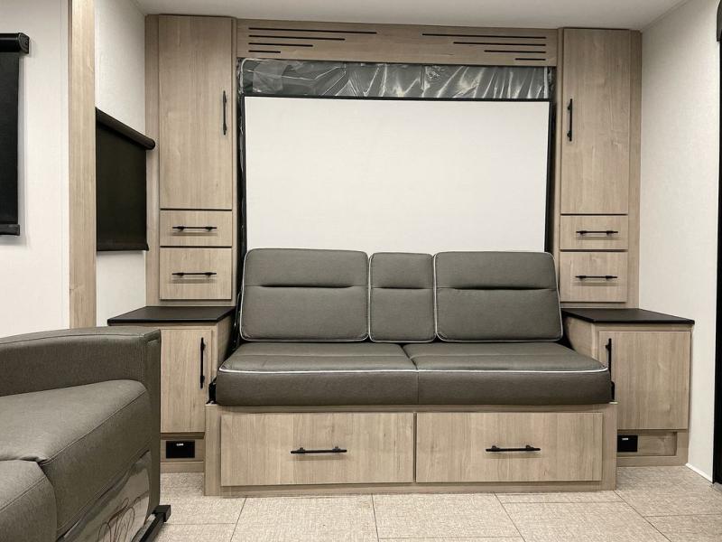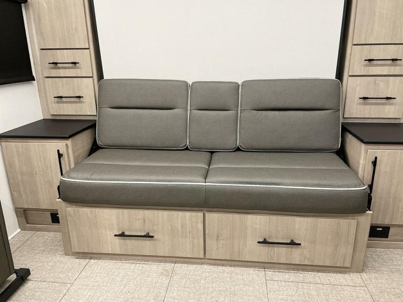 The Murphy bed is the eye-catching feature on this Imagine XLS travel trailer! Not only can it fold away in the morning to reveal a sofa for lounging, but it will also provide you with drawer storage under the sofa. Another functional feature is the theater dinette with a removable table in front or you can choose the optional U-shaped dinette if you like to gather around for game night. It rests on the single slide so that there is more floor space, and it offers you great comfort while you dine across from the LED HDTV. A full bathroom will keep you clean and fresh with its residential walk-in shower, skylight, linen closet, vanity, toilet, and power vent fan.