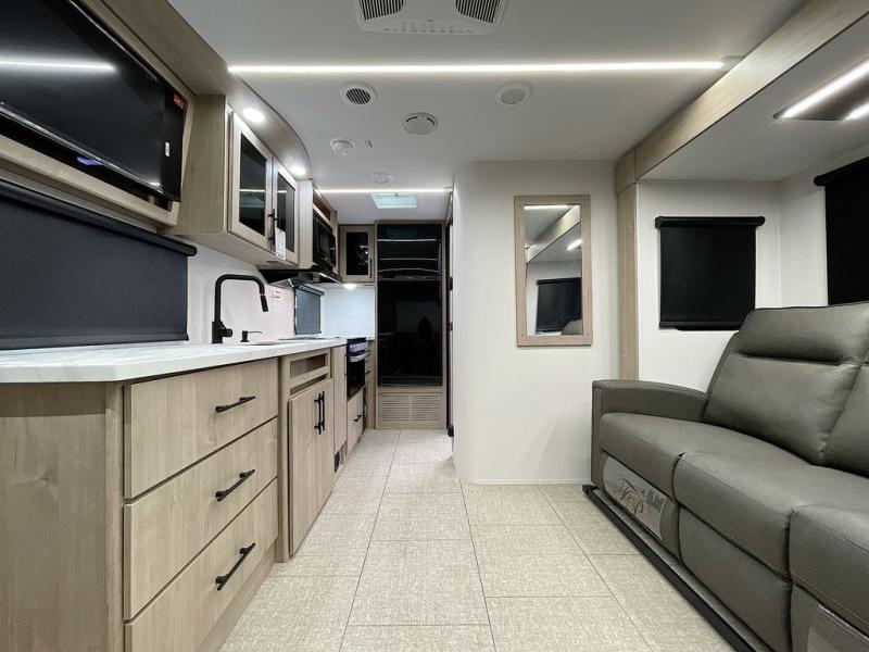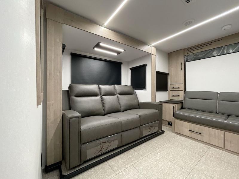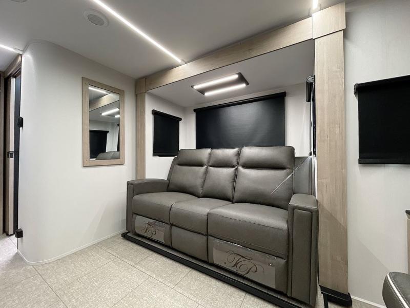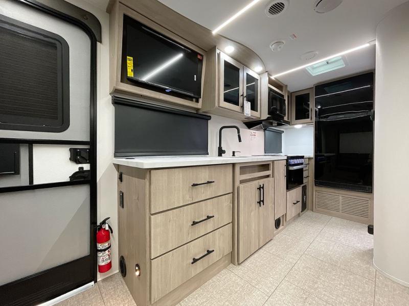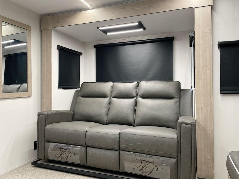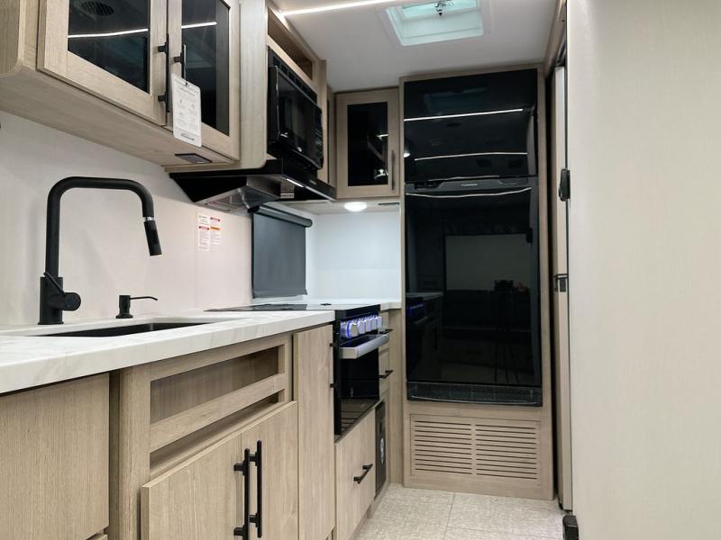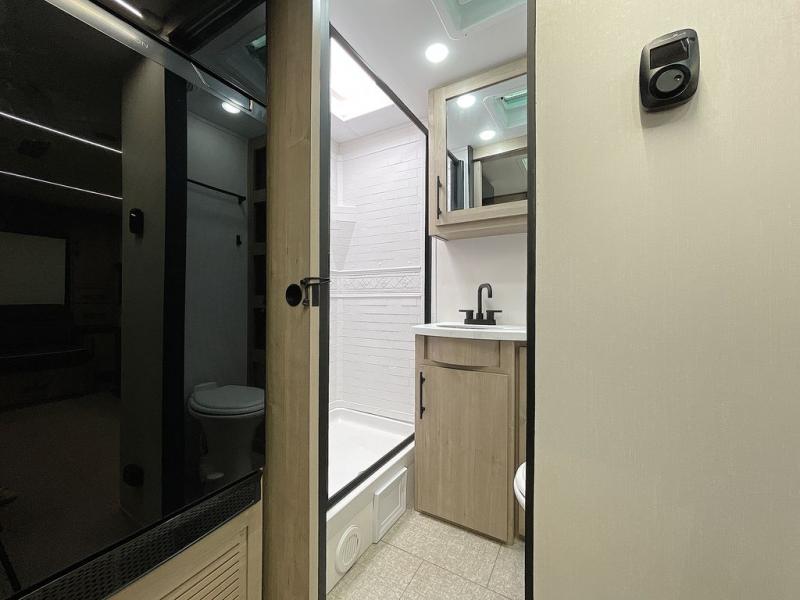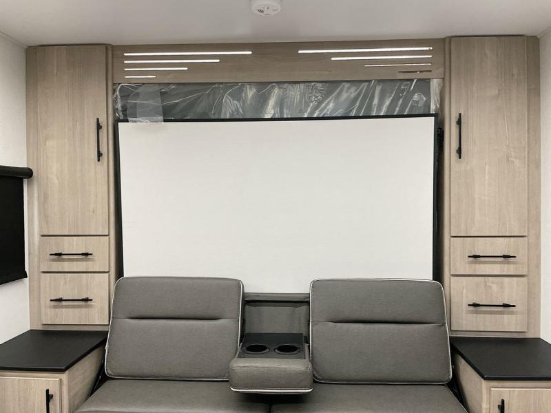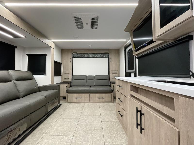 The Murphy bed is the eye-catching feature on this Imagine XLS travel trailer! Not only can it fold away in the morning to reveal a sofa for lounging, but it will also provide you with drawer storage under the sofa. Another functional feature is the theater dinette with a removable table in front or you can choose the optional U-shaped dinette if you like to gather around for game night. It rests on the single slide so that there is more floor space, and it offers you great comfort while you dine across from the LED HDTV. A full bathroom will keep you clean and fresh with its residential walk-in shower, skylight, linen closet, vanity, toilet, and power vent fan.