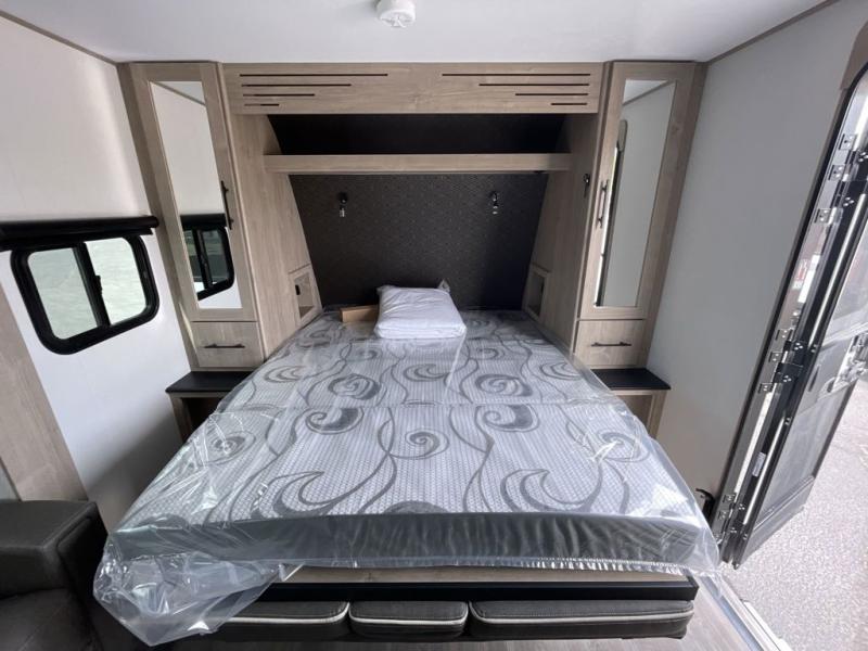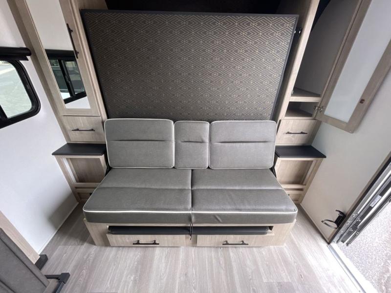 At the heart of this model is the queen Murphy bed, a smart space-saving solution that allows you to enjoy a comfortable sofa during the day and a restful bed at night. Built-in drawer storage beneath the sofa adds even more practicality, keeping essentials neatly organized. The theater dinette, positioned on the single slide, creates an open and airy feel while providing a cozy place to dine, relax, or enjoy movie nights across from the LED HDTV. Prefer a more traditional setup? An optional U-shaped dinette is available for those who enjoy gathering around for meals or games.