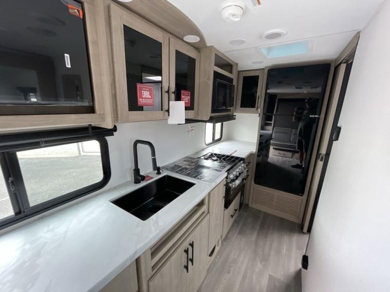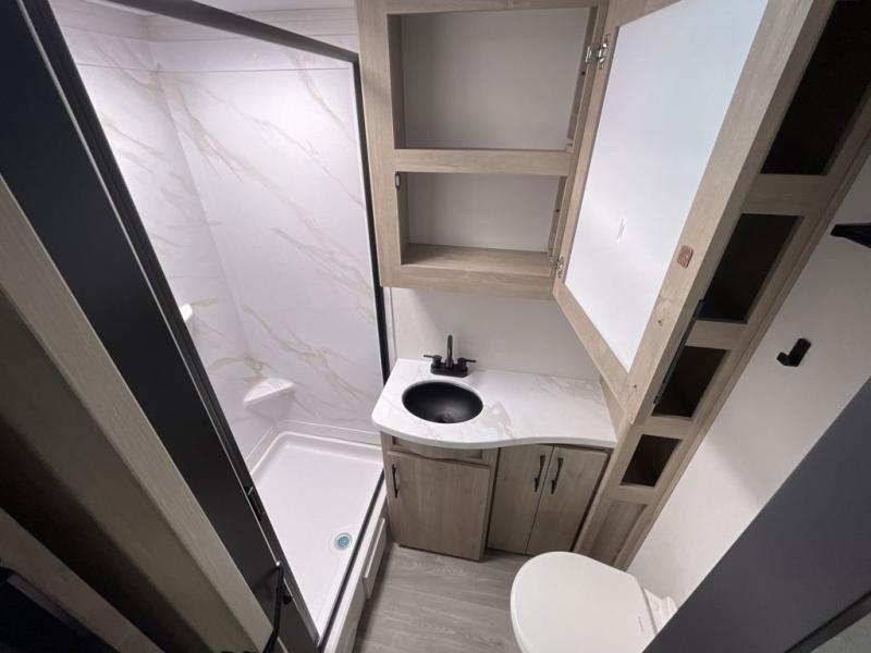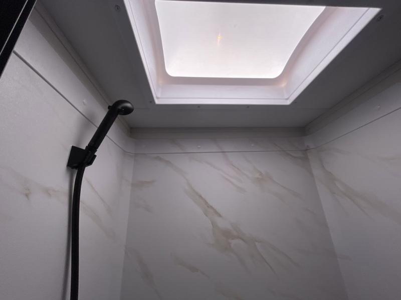 The kitchen is thoughtfully designed to support life on the road, anchored by a 12V 10 cu. ft. refrigerator that keeps food fresh for longer stays. Natural light pours in through the large panoramic window, bringing the outdoors inside and enhancing the overall camping experience. The full bathroom delivers residential comfort with a walk-in shower, skylight for added headroom and light, linen storage, vanity, toilet, and power vent fan, ensuring you stay refreshed wherever your travels take you.