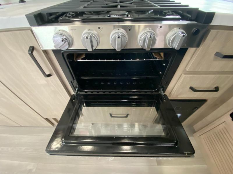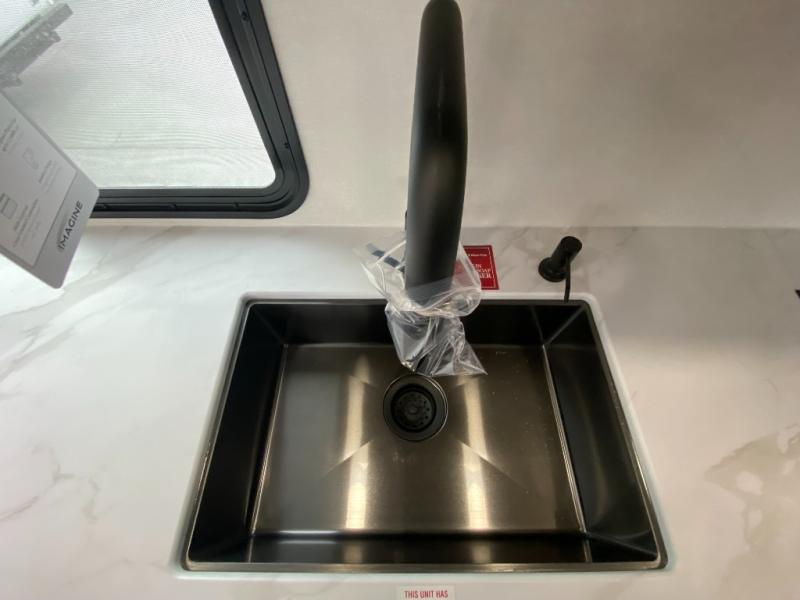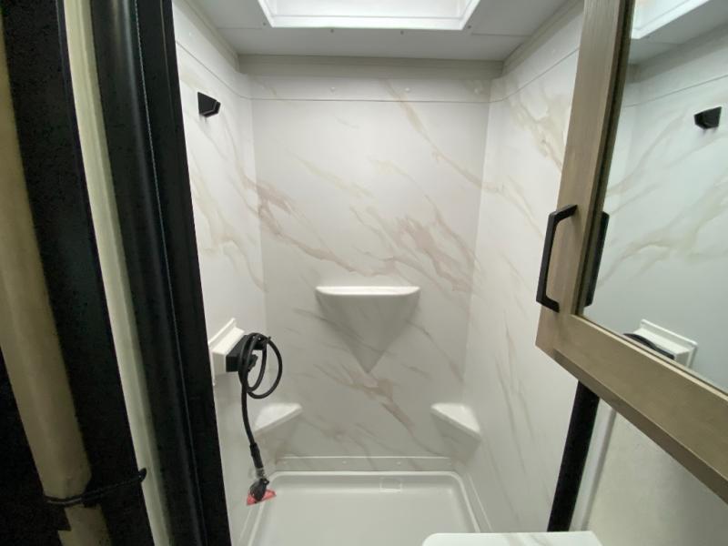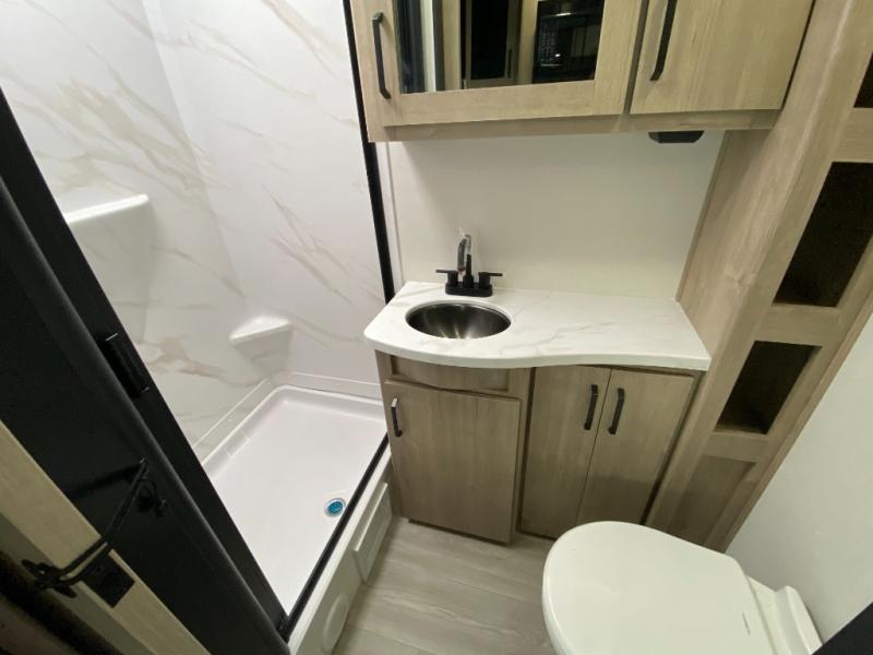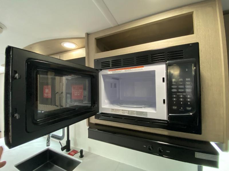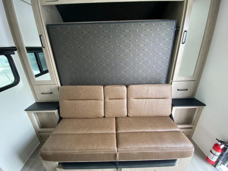 The Murphy bed is the eye-catching feature on this Imagine XLS travel trailer! Not only can it fold away in the morning to reveal a sofa for lounging, but it will also provide you with drawer storage under the sofa. Another functional feature is the theater dinette with a removable table in front, or you can choose the optional U-shaped dinette if you like to gather around for game night. It rests on the single slide so that there is more floor space, and it offers you great comfort while you dine across from the LED HDTV. A full bathroom will keep you clean and fresh with its residential walk-in shower, skylight, linen closet, vanity, toilet, and power vent fan.