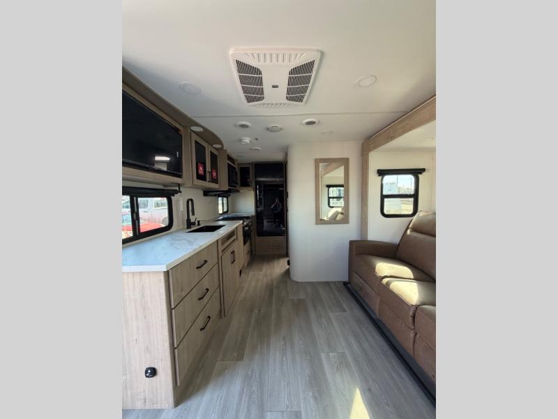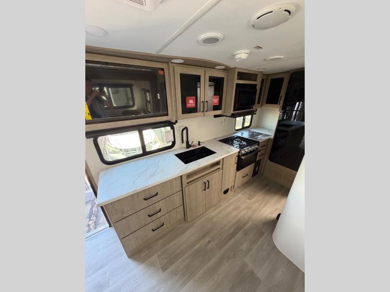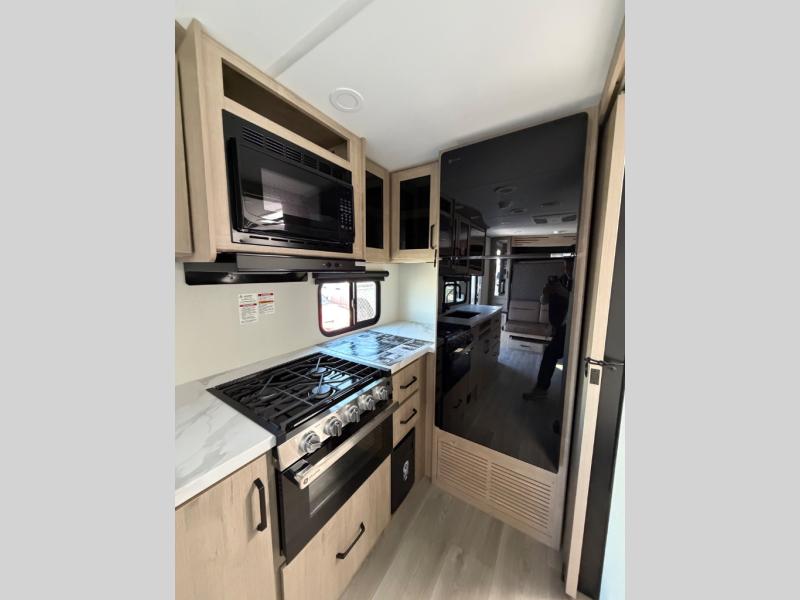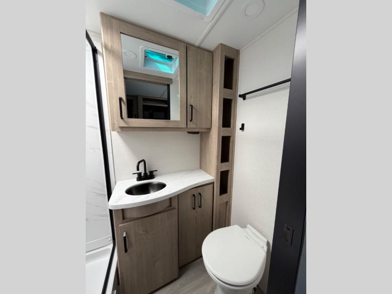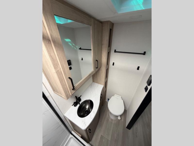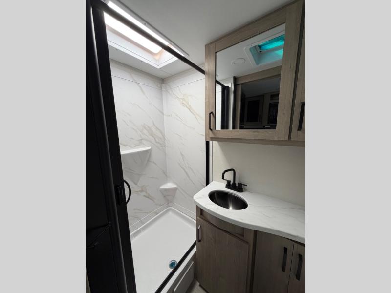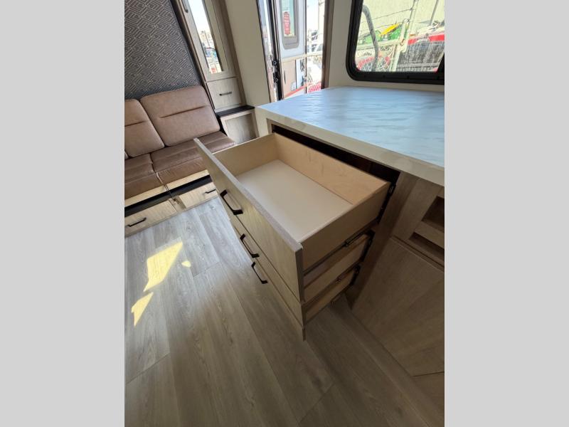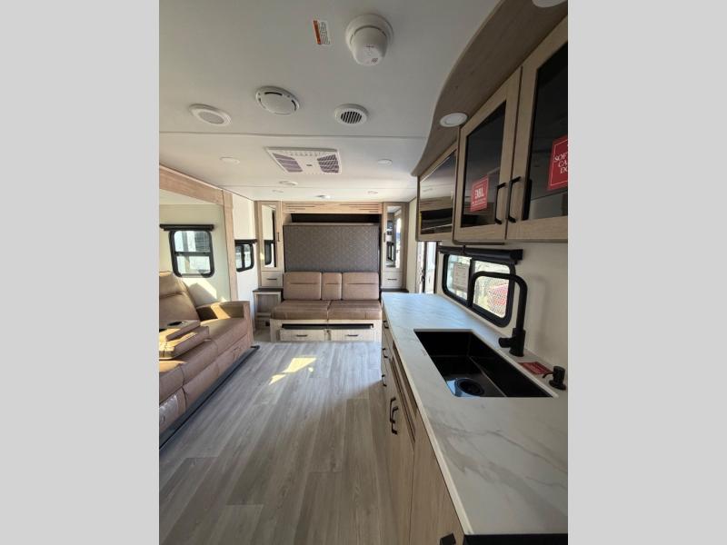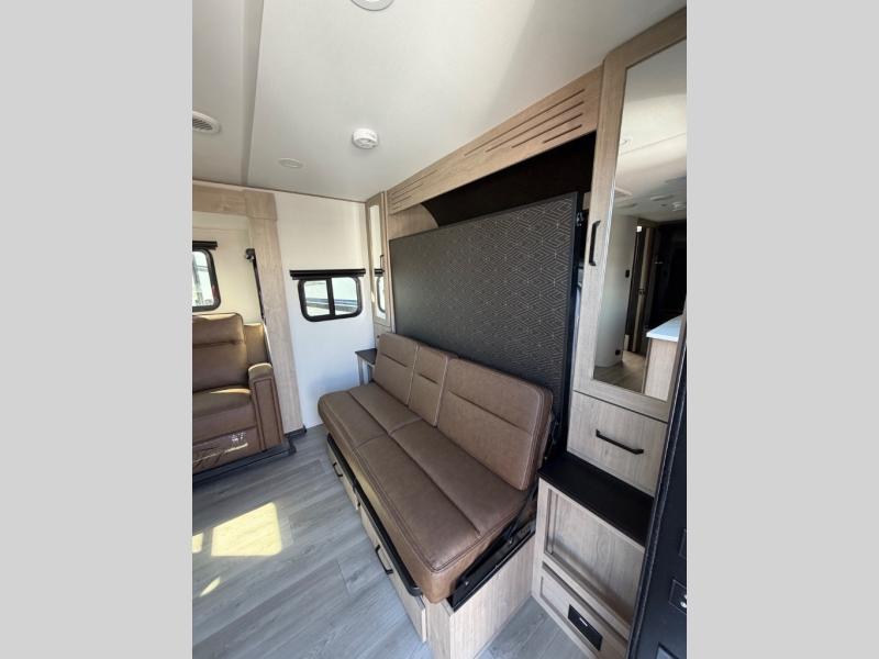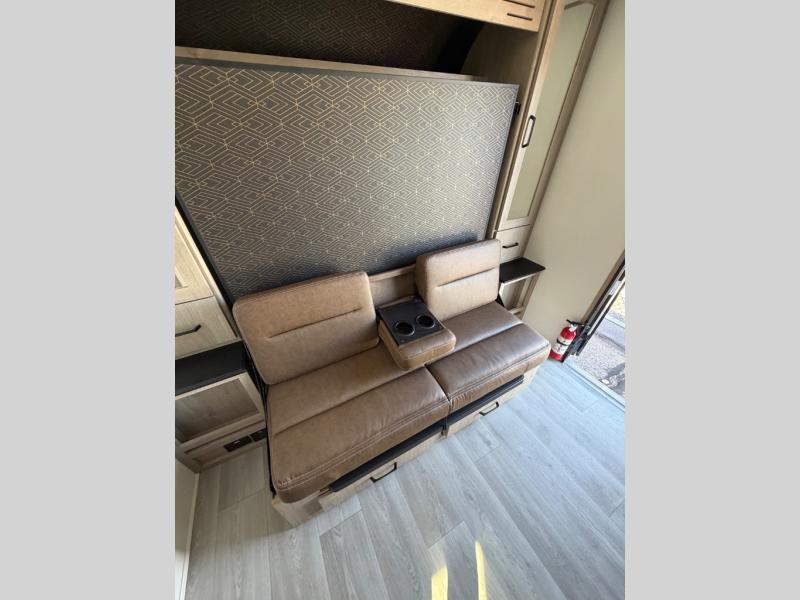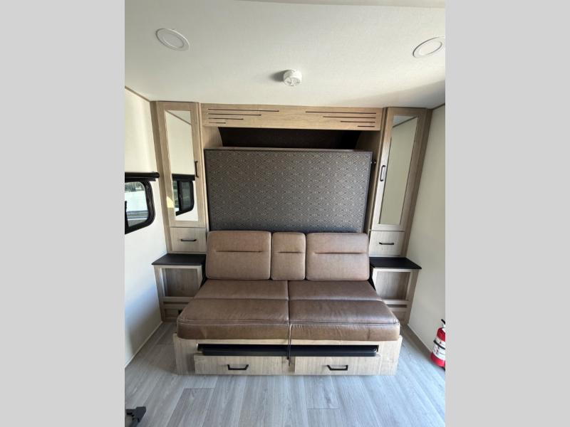 The Murphy bed is the eye-catching feature on this Imagine XLS travel trailer! Not only can it fold away in the morning to reveal a sofa for lounging, but it will also provide you with drawer storage under the sofa. Another functional feature is the theater dinette with a removable table in front, or you can choose the optional U-shaped dinette if you like to gather around for game night. It rests on the single slide so that there is more floor space, and it offers you great comfort while you dine across from the LED HDTV. A full bathroom will keep you clean and fresh with its residential walk-in shower, skylight, linen closet, vanity, toilet, and power vent fan.