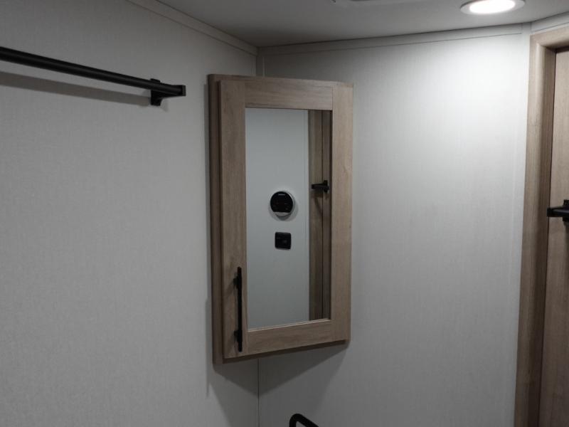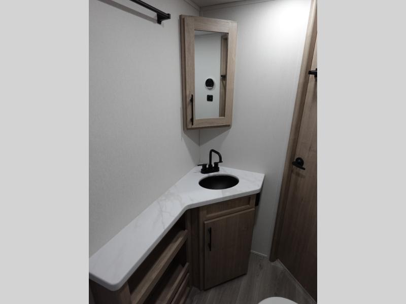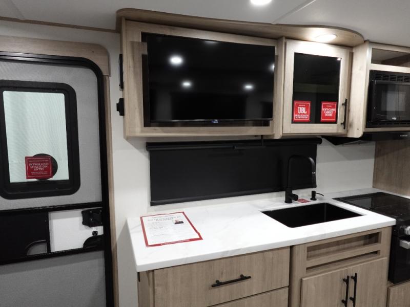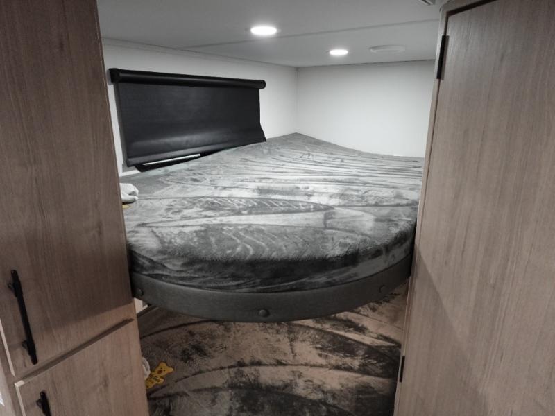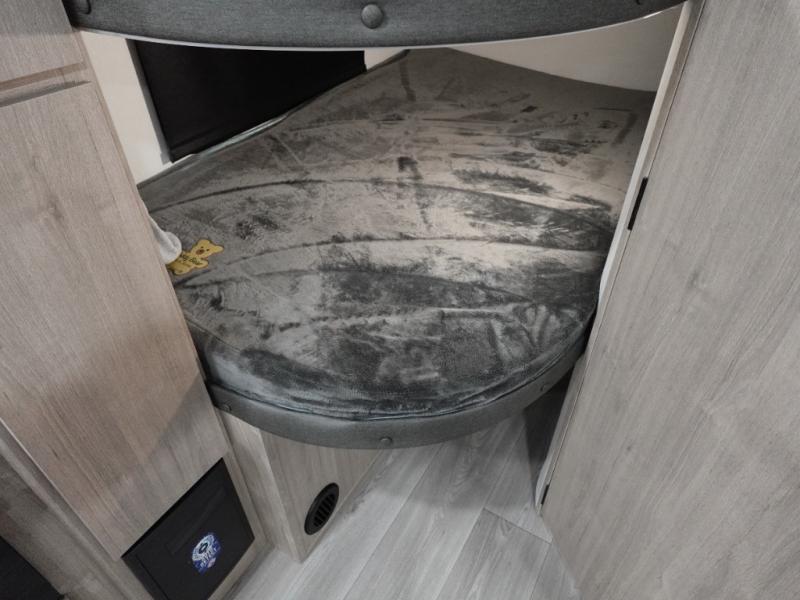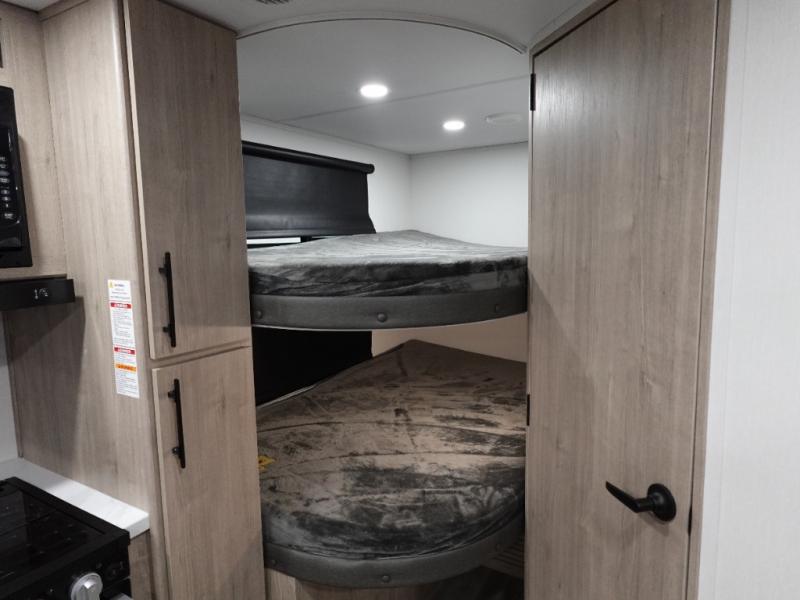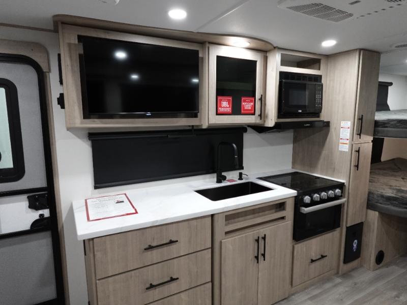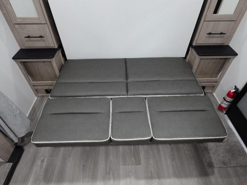 This travel trailer has everything you need for a great vacation! You will never miss home when you see all of the amenities included on this trailer. There is a full bathroom for easy morning routines, a set of 47" x 76" double over double-size bunks with privacy curtains for compact sleeping, a U-shaped dinette for meal times, and a full kitchen with all of the appliances needed for filling meals. The front Murphy bed not only provides versatility with a bed to sleep on at night, and a seating area during the day, but also a removable interior/exterior table. In addition to all of that, you'll also find an outdoor griddle and 1.6 cu. ft. refrigerator that you can use when the weather is nice. The unobstructed pass-through storage will be able to store your fishing poles and sports equipment while you travel.