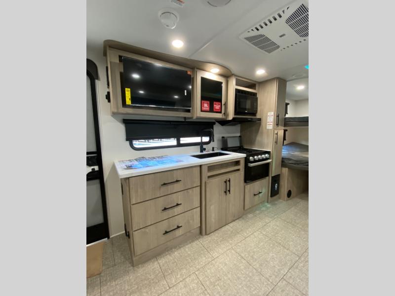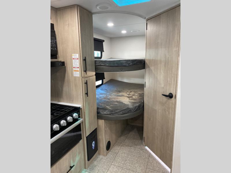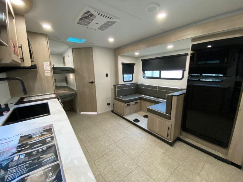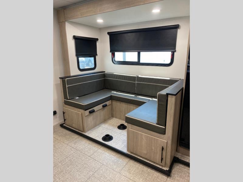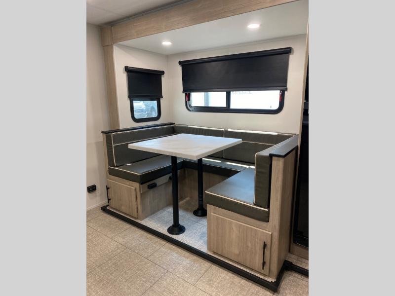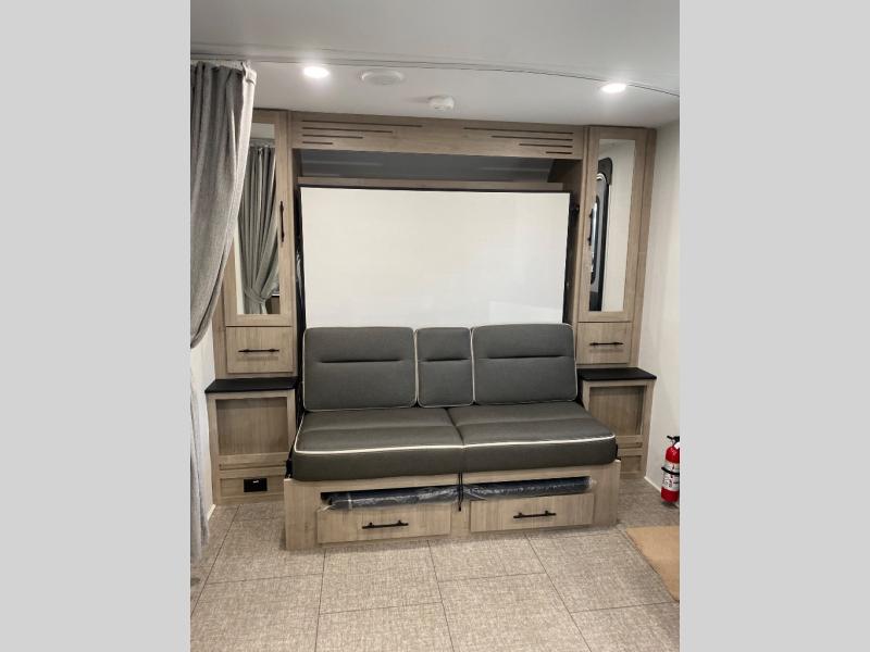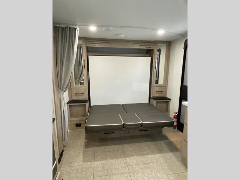 This travel trailer has everything you need for a great vacation! You will never miss home when you see all of the amenities included on this trailer. There is a full bathroom for easy morning routines, a set of 47" x 76" double over double-size bunks with privacy curtains for compact sleeping, a U-shaped dinette for meal times, and a full kitchen with all of the appliances needed for filling meals. You could even switch out the dinette for an optional theater dinette. The front Murphy bed not only provides versatility with a bed to sleep on at night, and a seating area during the day, but also a removable interior/exterior table. In addition to all of that, you'll also find an outdoor griddle and 1.6 cu. ft. refrigerator that you can use when the weather is nice. The unobstructed pass-through storage will be able to store your fishing poles and sports equipment while you travel.