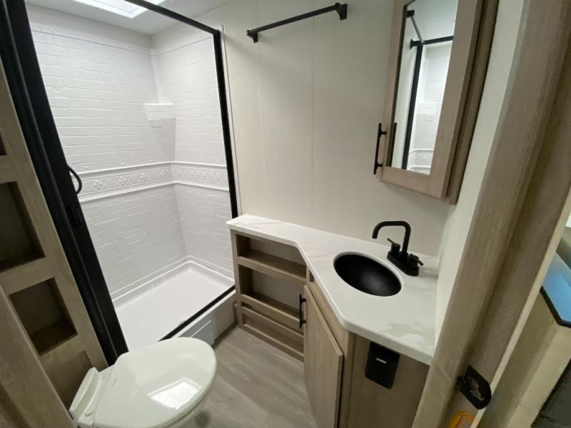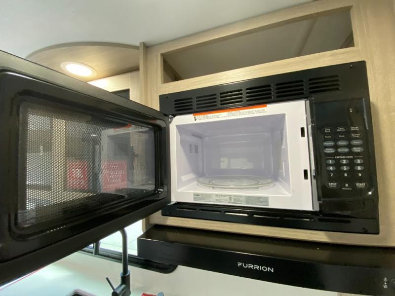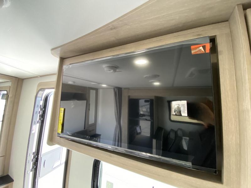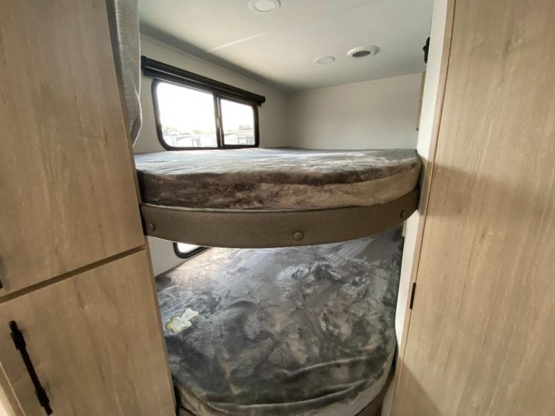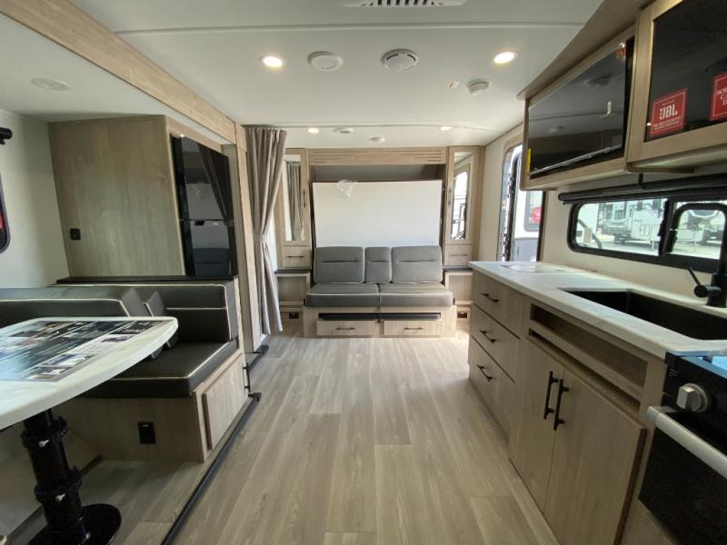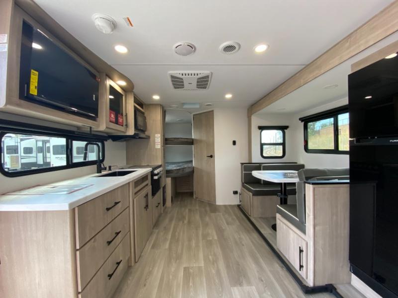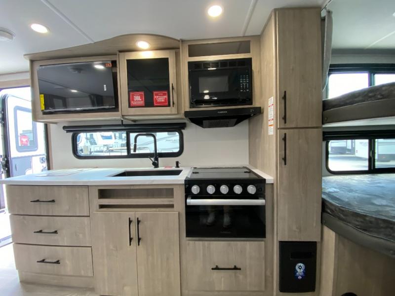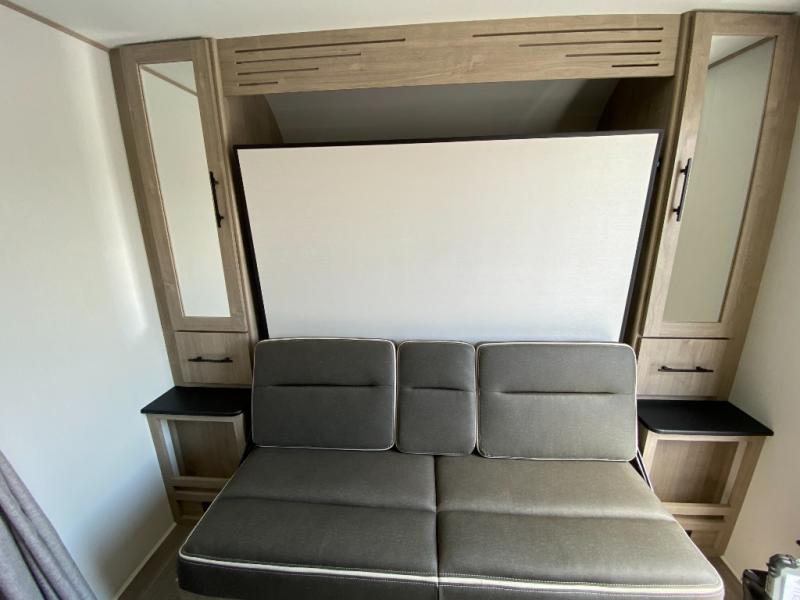 This travel trailer has everything you need for a great vacation! You will never miss home when you see all of the amenities included on this trailer. There is a full bathroom for easy morning routines, a set of 47" x 76" double over double-size bunks with privacy curtains for compact sleeping, a U-shaped dinette for meal times, and a full kitchen with all of the appliances needed for filling meals. You could even switch out the dinette for an optional theater dinette. The front Murphy bed not only provides versatility with a bed to sleep on at night, and a seating area during the day, but also a removable interior/exterior table. In addition to all of that, you'll also find an outdoor griddle and 1.6 cu. ft. refrigerator that you can use when the weather is nice. The unobstructed pass-through storage will be able to store your fishing poles and sports equipment while you travel.