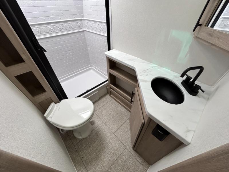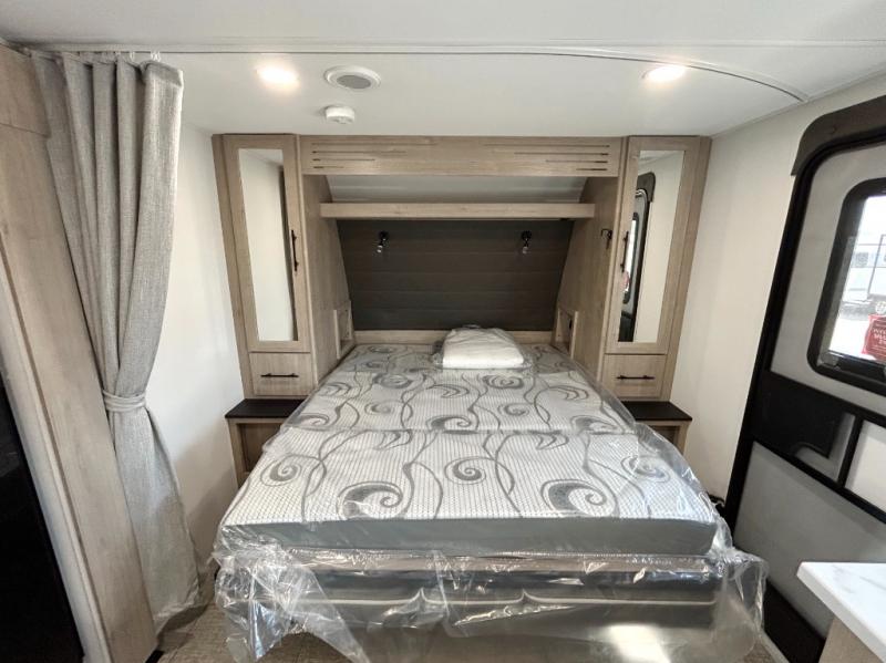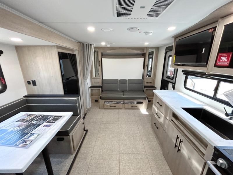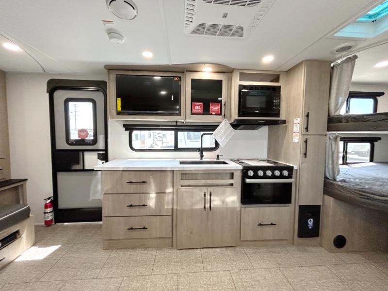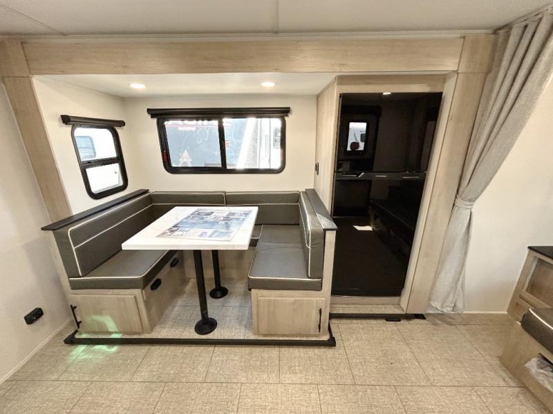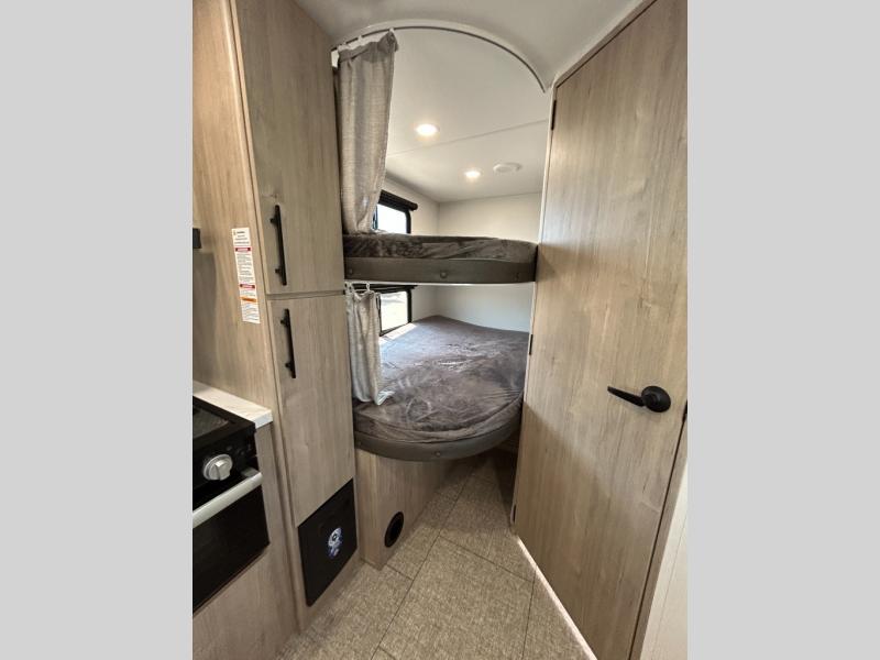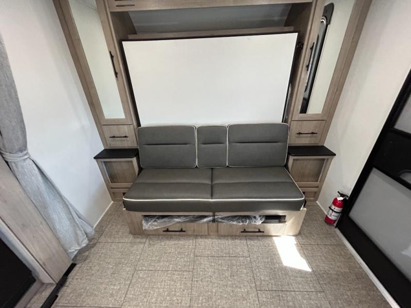 This travel trailer has everything you need for a great vacation! You will never miss home when you see all of the amenities included on this trailer. There is a full bathroom for easy morning routines, a set of 47" x 76" double over double-size bunks with privacy curtains for compact sleeping, a U-shaped dinette for meal times, and a full kitchen with all of the appliances needed for filling meals. You could even switch out the dinette for an optional theater dinette. The front Murphy bed not only provides versatility with a bed to sleep on at night, and a seating area during the day, but also a removable interior/exterior table. In addition to all of that, you'll also find an outdoor griddle and 1.6 cu. ft. refrigerator that you can use when the weather is nice. The unobstructed pass-through storage will be able to store your fishing poles and sports equipment while you travel.