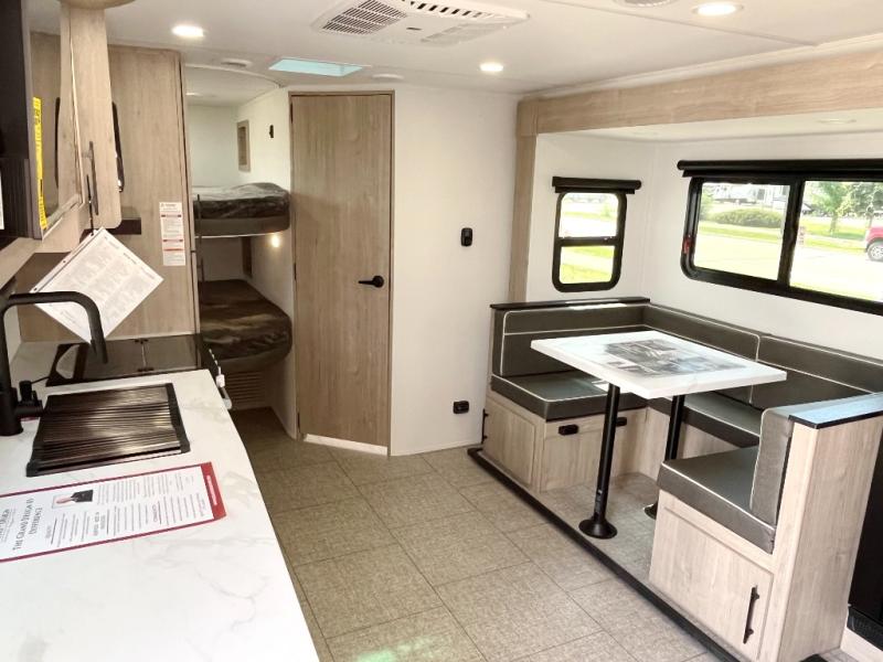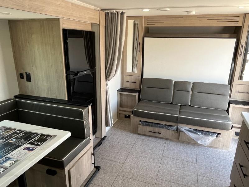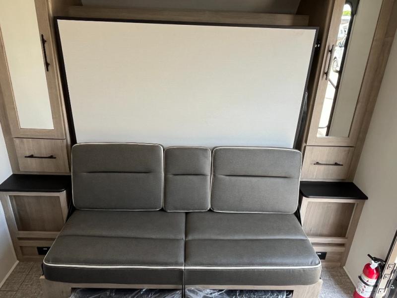 This travel trailer has everything you need for a great vacation! You will never miss home when you see all of the amenities included on this trailer. There is a full bathroom for easy morning routines, a set of 47" x 76" double over double-size bunks with privacy curtains for compact sleeping, a U-shaped dinette for meal times, and a full kitchen with all of the appliances needed for filling meals. You could even switch out the dinette for an optional theater dinette. The front Murphy bed not only provides versatility with a bed to sleep on at night, and a seating area during the day, but also a removable interior/exterior table. In addition to all of that, you'll also find an outdoor griddle and 1.6 cu. ft. refrigerator that you can use when the weather is nice. The unobstructed pass-through storage will be able to store your fishing poles and sports equipment while you travel.