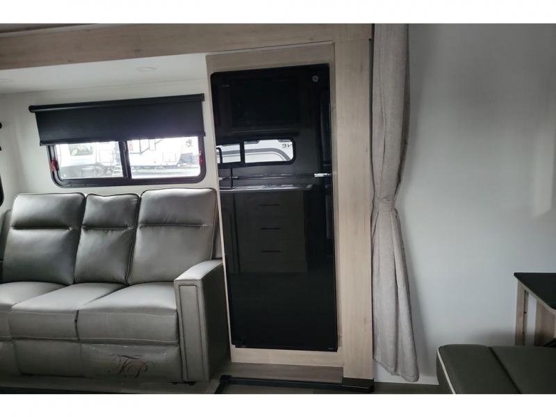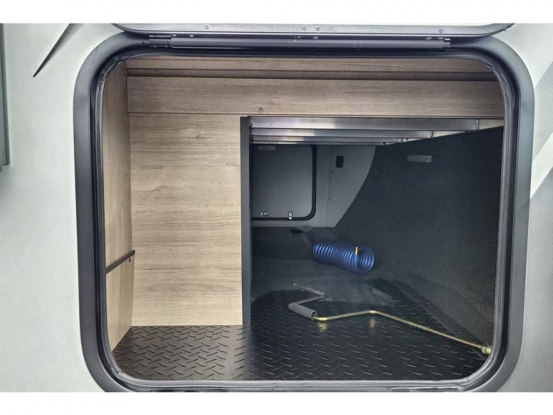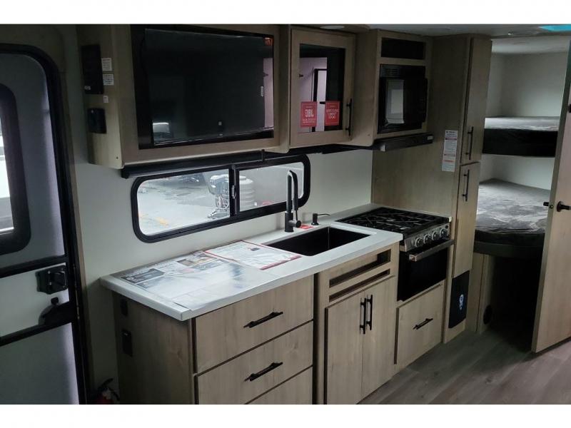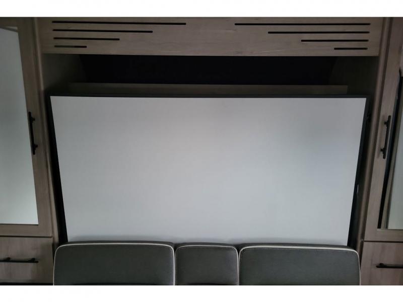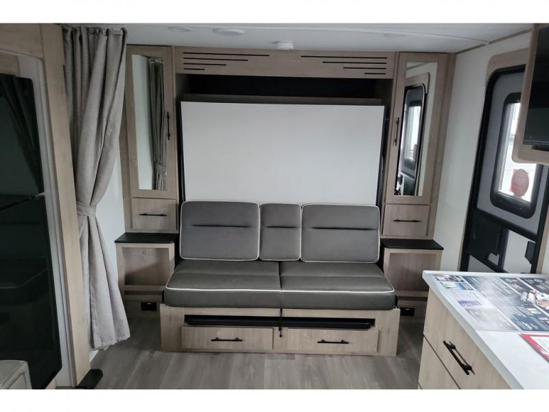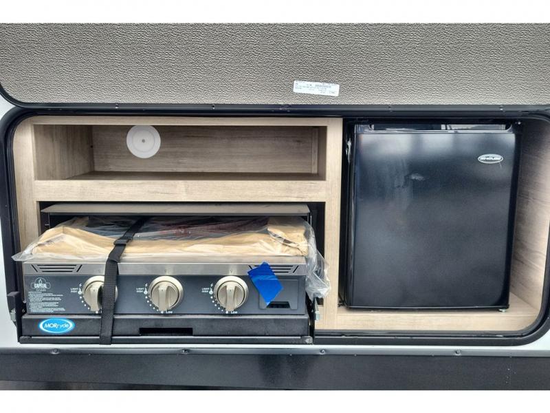This travel trailer has everything you need for a great vacation! You will never miss home when you see all of the amenities included on this trailer. There is a full bathroom for easy morning routines, a set of 47" x 76" double over double-size bunks with privacy curtains for compact sleeping, a U-shaped dinette for meal times, and a full kitchen with all of the appliances needed for filling meals. You could even switch out the dinette for an optional theater dinette. The front Murphy bed not only provides versatility with a bed to sleep on at night, and a seating area during the day, but also a removable interior/exterior table. In addition to all of that, you'll also find an outdoor griddle and 1.6 cu. ft. refrigerator that you can use when the weather is nice. The unobstructed pass-through storage will be able to store your fishing poles and sports equipment while you travel.