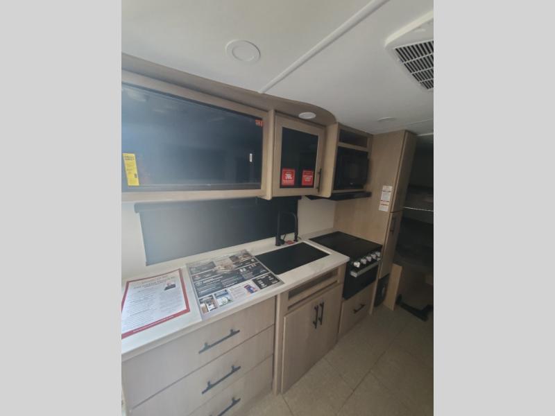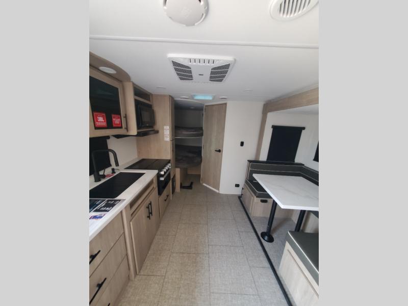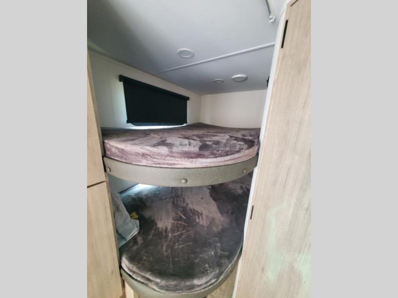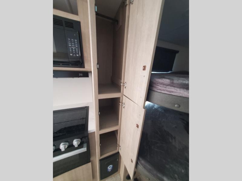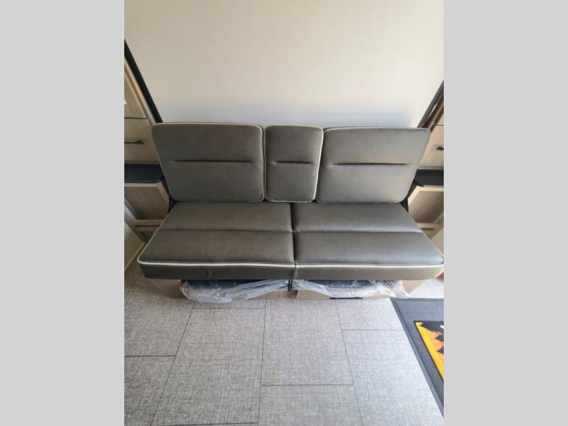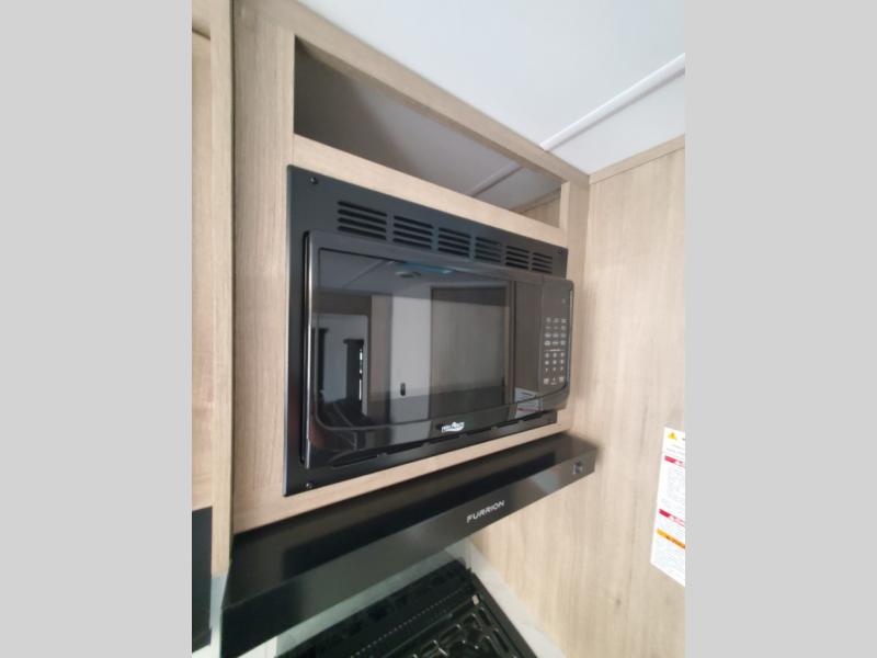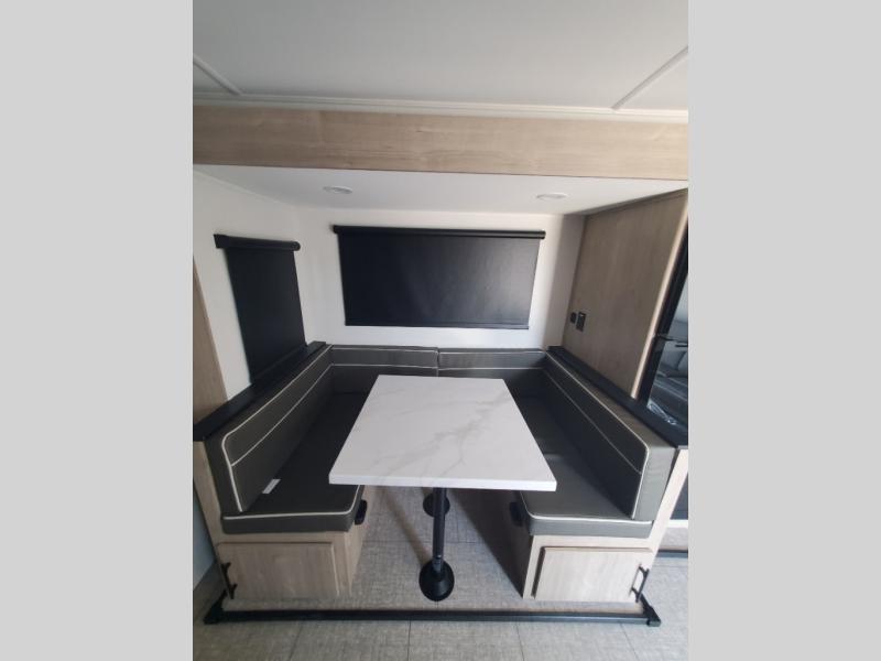 This travel trailer has everything you need for a great vacation! You will never miss home when you see all of the amenities included on this trailer. There is a full bathroom for easy morning routines, a set of 47" x 76" double over double-size bunks with privacy curtains for compact sleeping, a U-shaped dinette for meal times, and a full kitchen with all of the appliances needed for filling meals. You could even switch out the dinette for an optional theater dinette. The front Murphy bed not only provides versatility with a bed to sleep on at night, and a seating area during the day, but also a removable interior/exterior table. In addition to all of that, you'll also find an outdoor griddle and 1.6 cu. ft. refrigerator that you can use when the weather is nice. The unobstructed pass-through storage will be able to store your fishing poles and sports equipment while you travel.