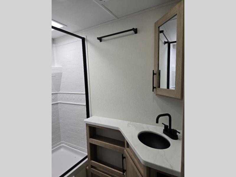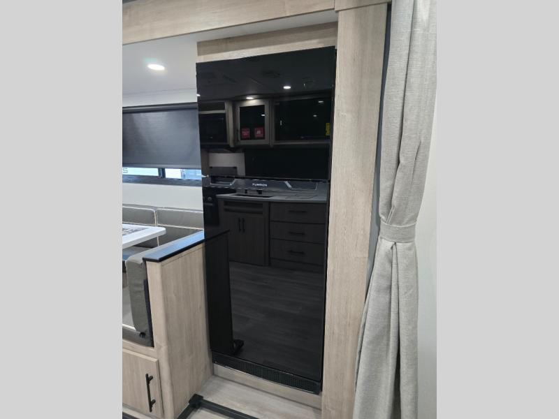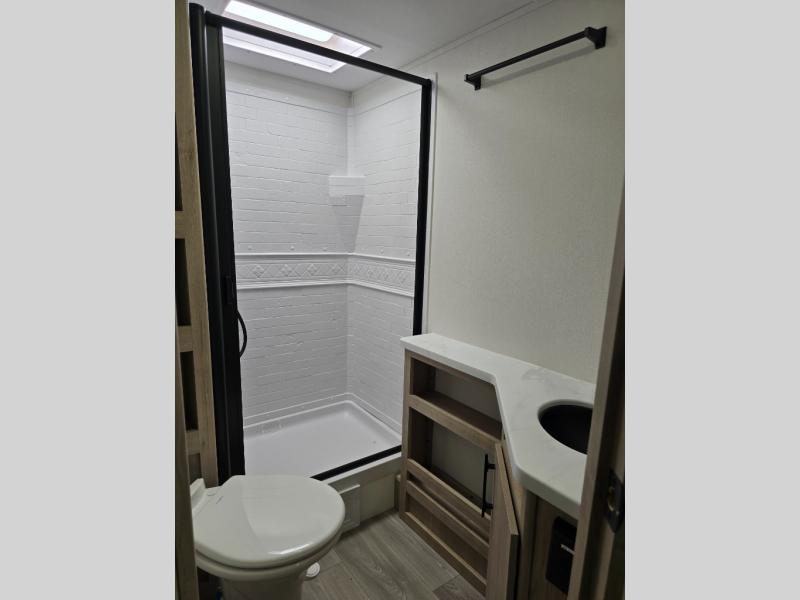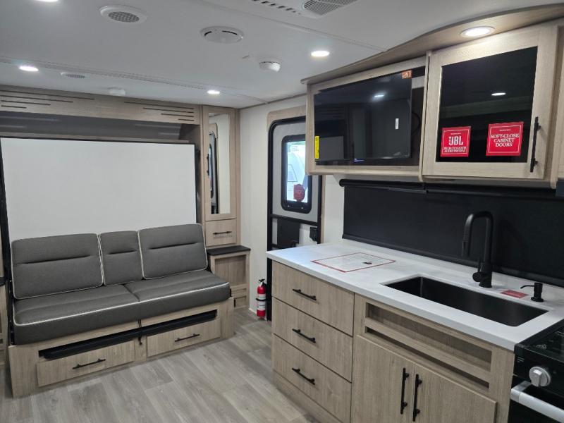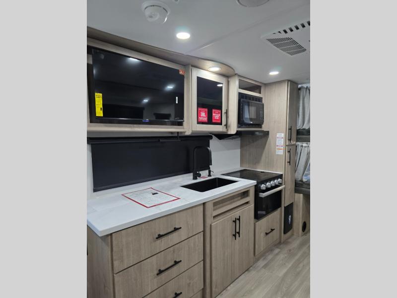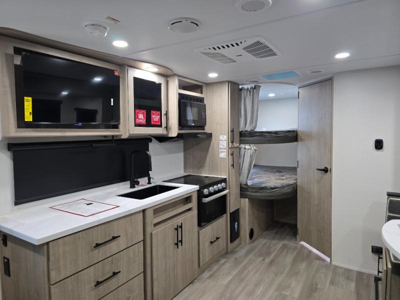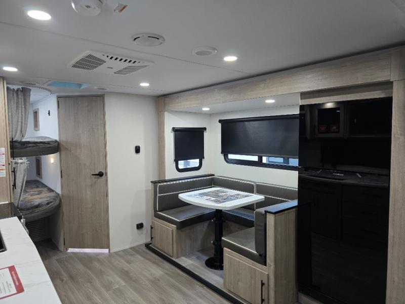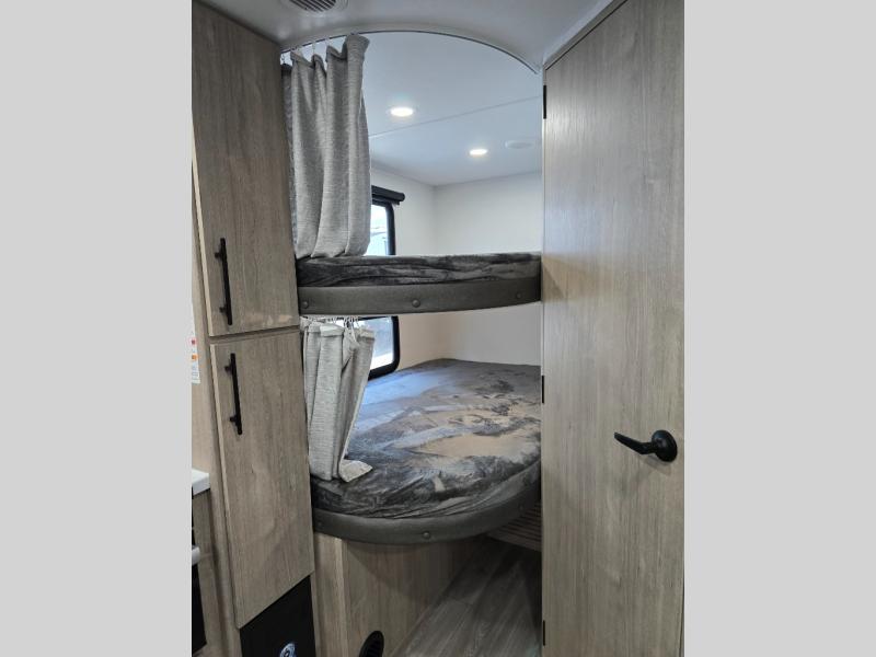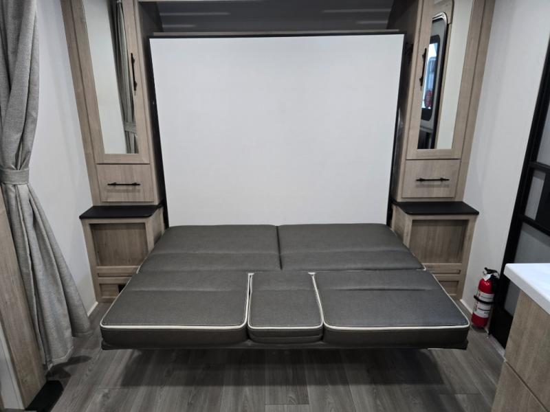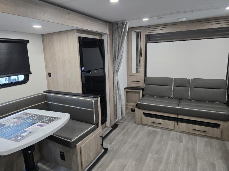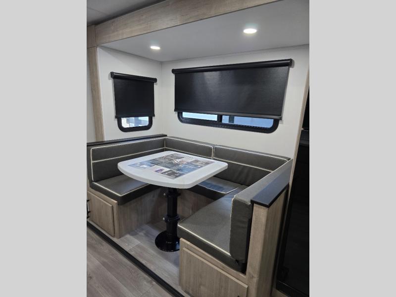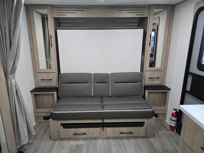 This travel trailer has everything you need for a great vacation! You will never miss home when you see all of the amenities included on this trailer. There is a full bathroom for easy morning routines, a set of 47" x 76" double over double-size bunks with privacy curtains for compact sleeping, a U-shaped dinette for meal times, and a full kitchen with all of the appliances needed for filling meals. You could even switch out the dinette for an optional theater dinette. The front Murphy bed not only provides versatility with a bed to sleep on at night, and a seating area during the day, but also a removable interior/exterior table. In addition to all of that, you'll also find an outdoor griddle and 1.6 cu. ft. refrigerator that you can use when the weather is nice. The unobstructed pass-through storage will be able to store your fishing poles and sports equipment while you travel.