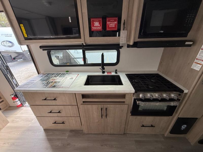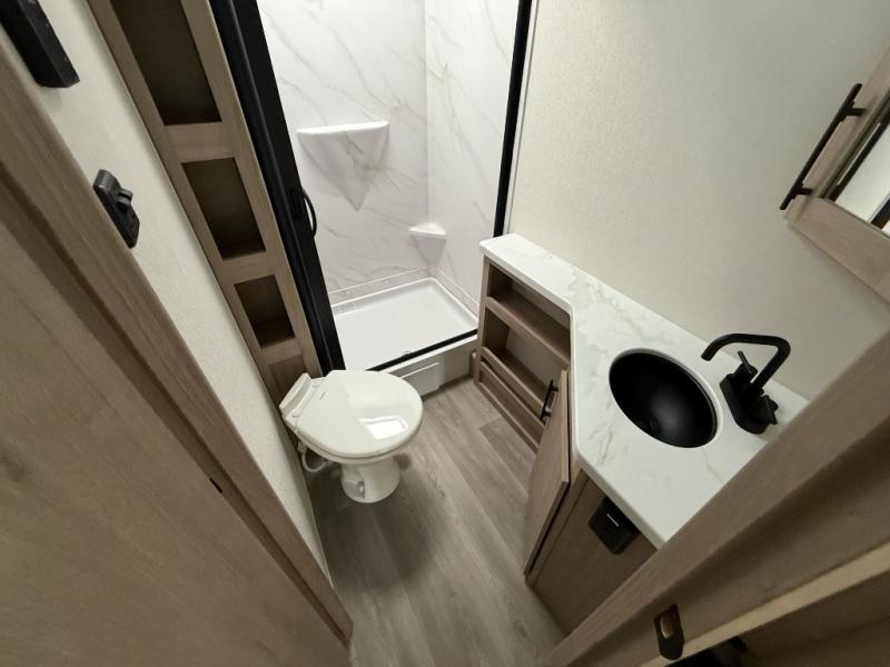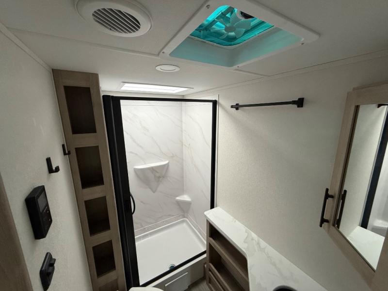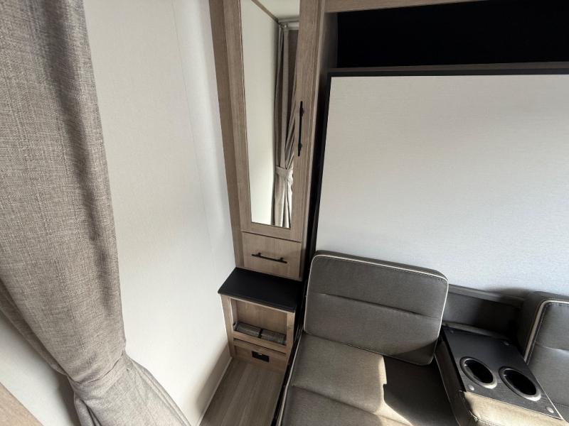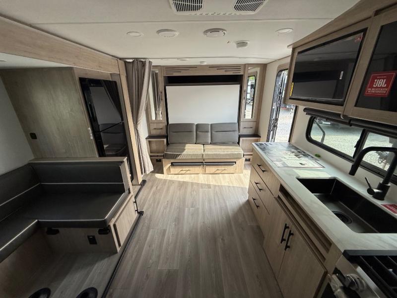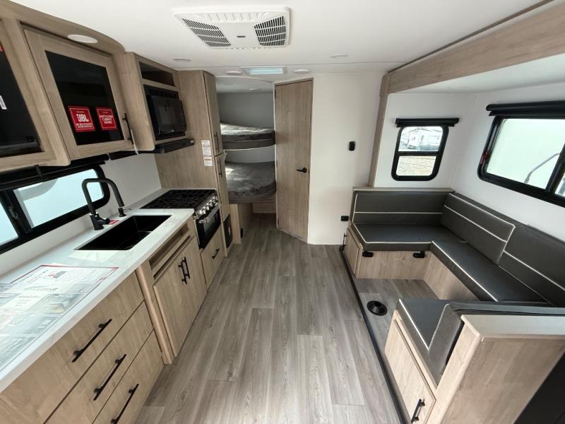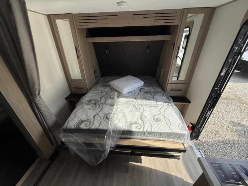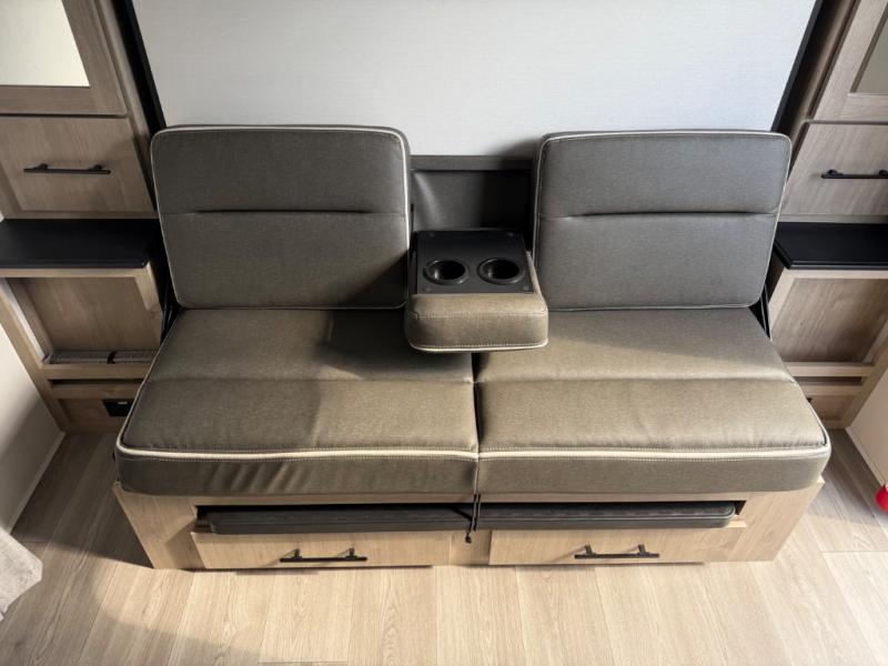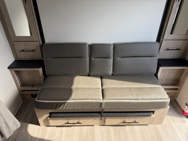 This travel trailer has everything you need for a great vacation! You will never miss home when you see all of the amenities included on this trailer. There is a full bathroom for easy morning routines, a set of 47" x 76" double over double-size bunks with privacy curtains for compact sleeping, a U-shaped dinette for meal times, and a full kitchen with all of the appliances needed for filling meals. You could even switch out the dinette for an optional theater dinette. The front Murphy bed not only provides versatility with a bed to sleep on at night, and a seating area during the day, but also a removable interior/exterior table. In addition to all of that, you'll also find an outdoor griddle and 1.6 cu. ft. refrigerator that you can use when the weather is nice. The unobstructed pass-through storage will be able to store your fishing poles and sports equipment while you travel.