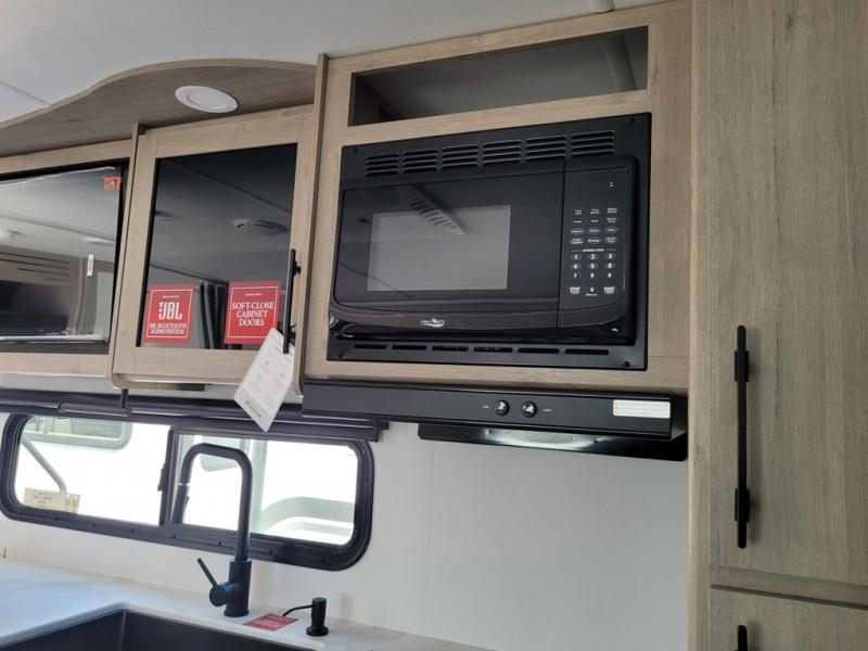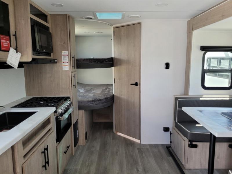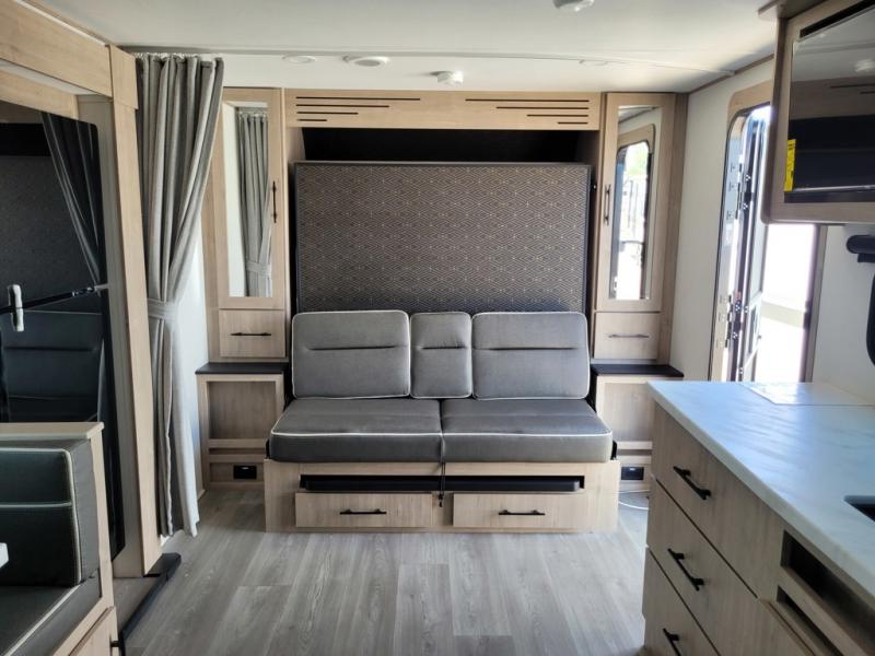 This travel trailer has everything you need for a great vacation! You will never miss home when you see all of the amenities included on this trailer. There is a full bathroom for easy morning routines, a set of 47" x 76" double over double-size bunks with privacy curtains for compact sleeping, a U-shaped dinette for meal times, and a full kitchen with all of the appliances needed for filling meals. You could even switch out the dinette for an optional theater dinette. The front Murphy bed not only provides versatility with a bed to sleep on at night, and a seating area during the day, but also a removable interior/exterior table. In addition to all of that, you'll also find an outdoor griddle and 1.6 cu. ft. refrigerator that you can use when the weather is nice. The unobstructed pass-through storage will be able to store your fishing poles and sports equipment while you travel.