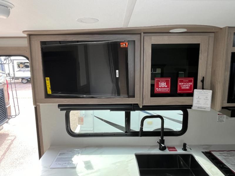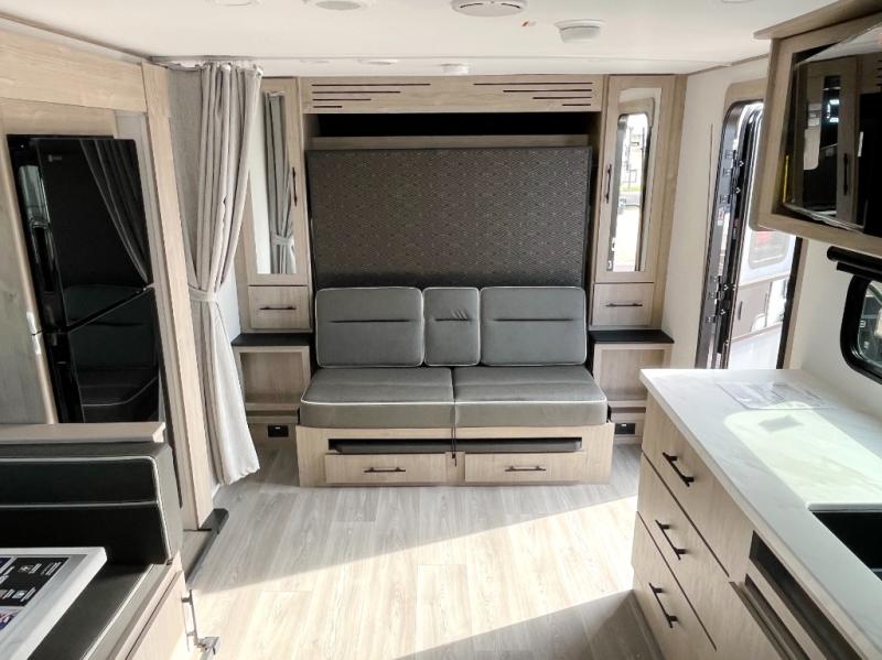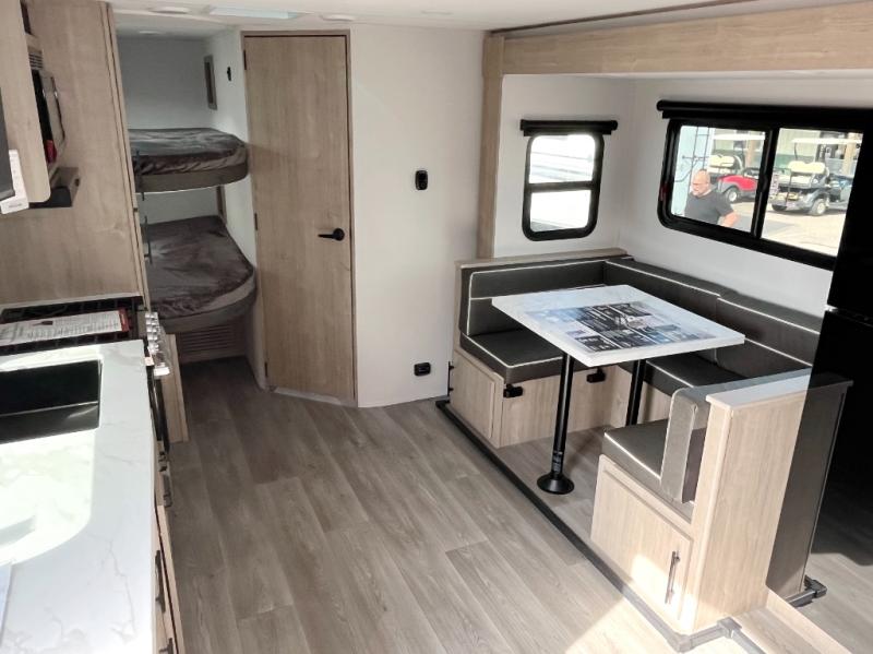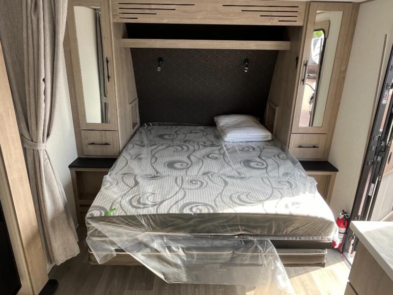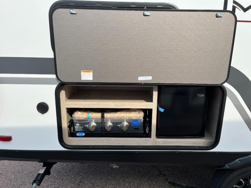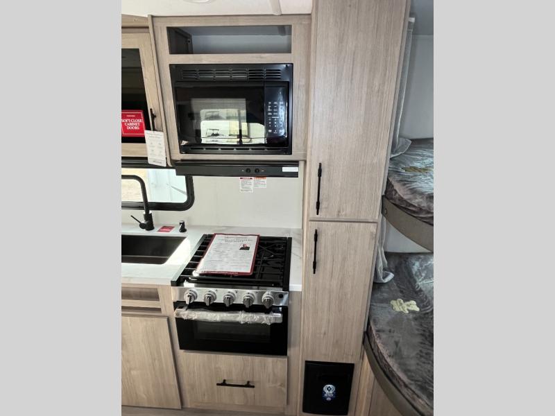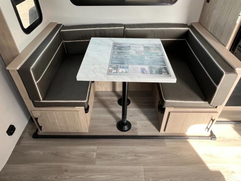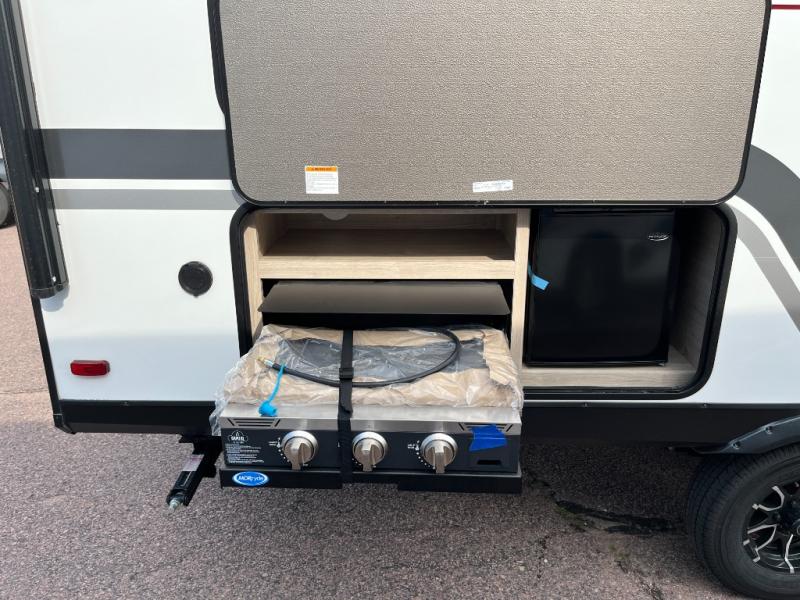 This travel trailer has everything you need for a great vacation! You will never miss home when you see all of the amenities included on this trailer. There is a full bathroom for easy morning routines, a set of 47" x 76" double over double-size bunks with privacy curtains for compact sleeping, a U-shaped dinette for meal times, and a full kitchen with all of the appliances needed for filling meals. You could even switch out the dinette for an optional theater dinette. The front Murphy bed not only provides versatility with a bed to sleep on at night, and a seating area during the day, but also a removable interior/exterior table. In addition to all of that, you'll also find an outdoor griddle and 1.6 cu. ft. refrigerator that you can use when the weather is nice. The unobstructed pass-through storage will be able to store your fishing poles and sports equipment while you travel.
