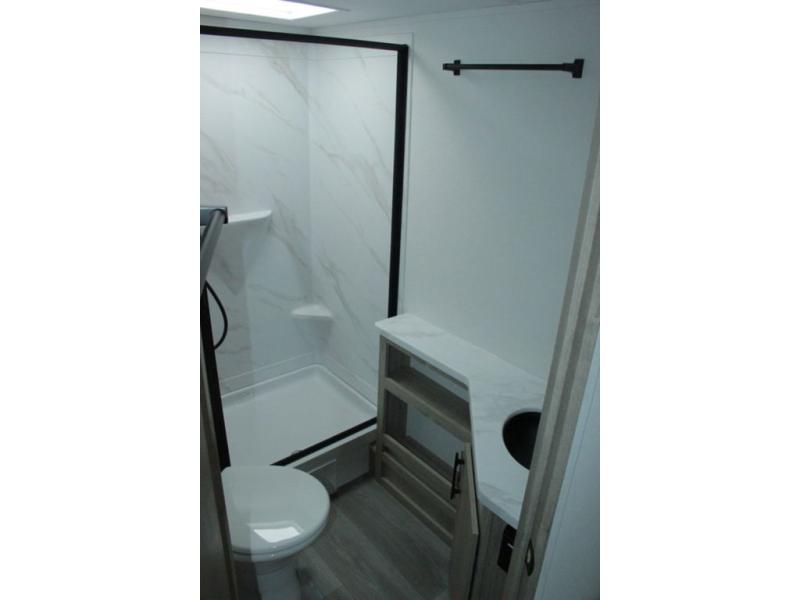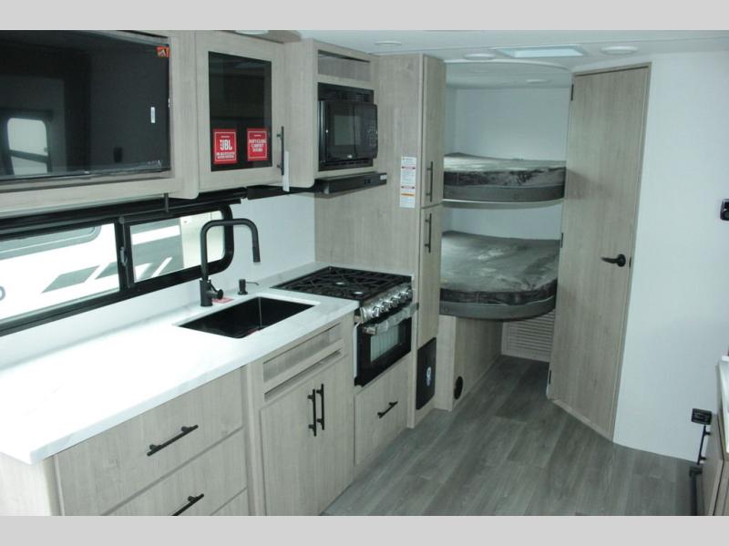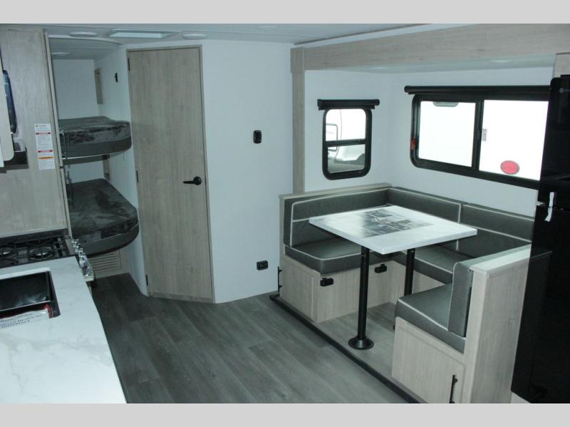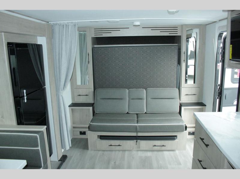 This travel trailer has everything you need for a great vacation! You will never miss home when you see all of the amenities included on this trailer. There is a full bathroom for easy morning routines, a set of 47" x 76" double over double-size bunks with privacy curtains for compact sleeping, a U-shaped dinette for meal times, and a full kitchen with all of the appliances needed for filling meals. You could even switch out the dinette for an optional theater dinette. The front Murphy bed not only provides versatility with a bed to sleep on at night, and a seating area during the day, but also a removable interior/exterior table. In addition to all of that, you'll also find an outdoor griddle and 1.6 cu. ft. refrigerator that you can use when the weather is nice. The unobstructed pass-through storage will be able to store your fishing poles and sports equipment while you travel.