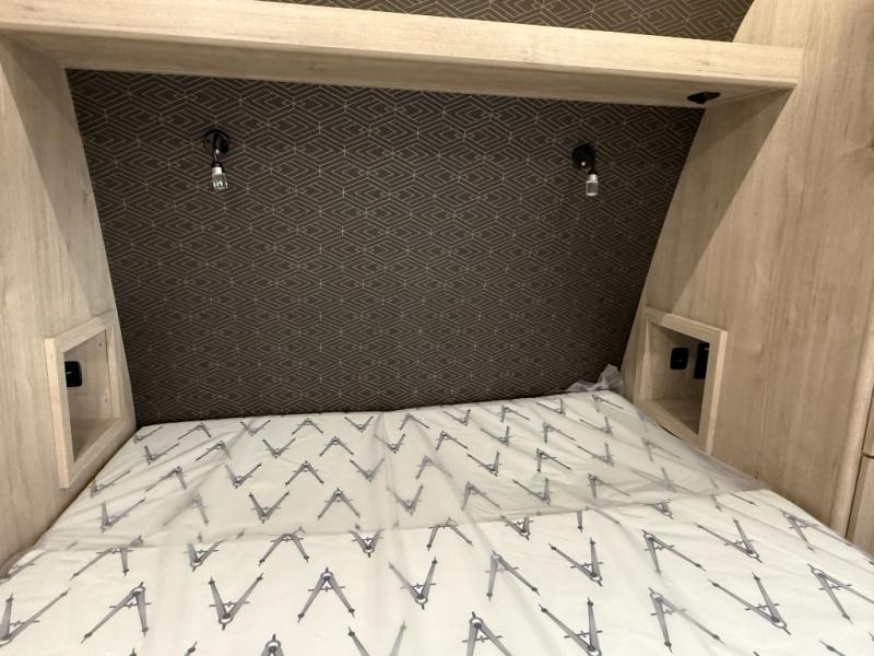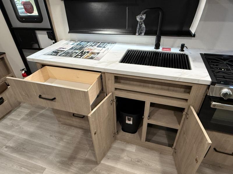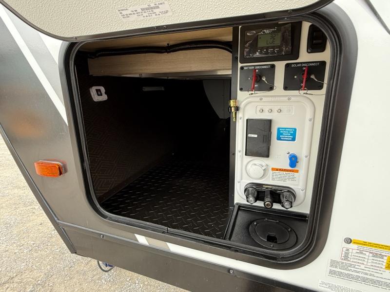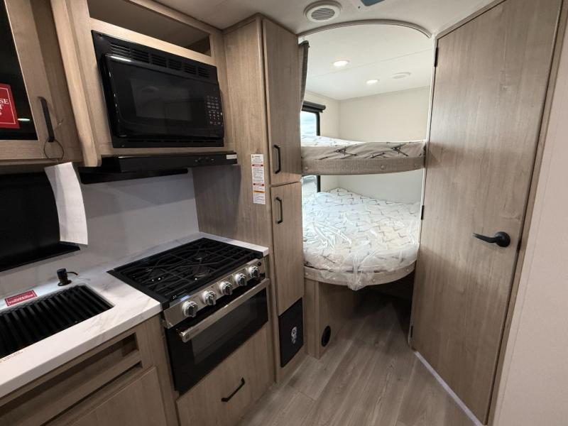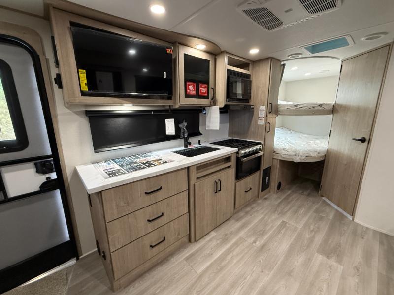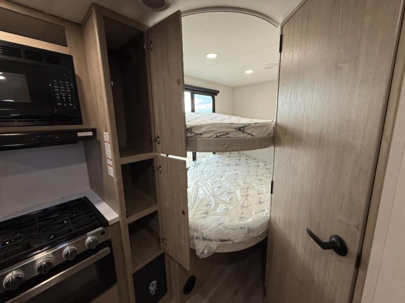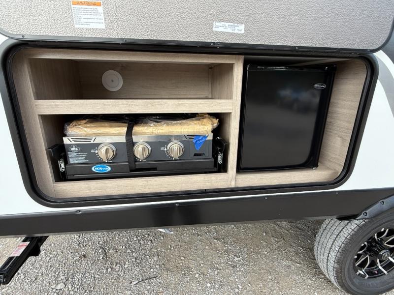 This travel trailer has everything you need for a great vacation! You will never miss home when you see all of the amenities included on this trailer. There is a full bathroom for easy morning routines, a set of 47" x 76" double over double-size bunks with privacy curtains for compact sleeping, a U-shaped dinette for meal times, and a full kitchen with all of the appliances needed for filling meals. You could even switch out the dinette for an optional theater dinette. The front Murphy bed not only provides versatility with a bed to sleep on at night, and a seating area during the day, but also a removable interior/exterior table. In addition to all of that, you'll also find an outdoor griddle and 1.6 cu. ft. refrigerator that you can use when the weather is nice. The unobstructed pass-through storage will be able to store your fishing poles and sports equipment while you travel.
