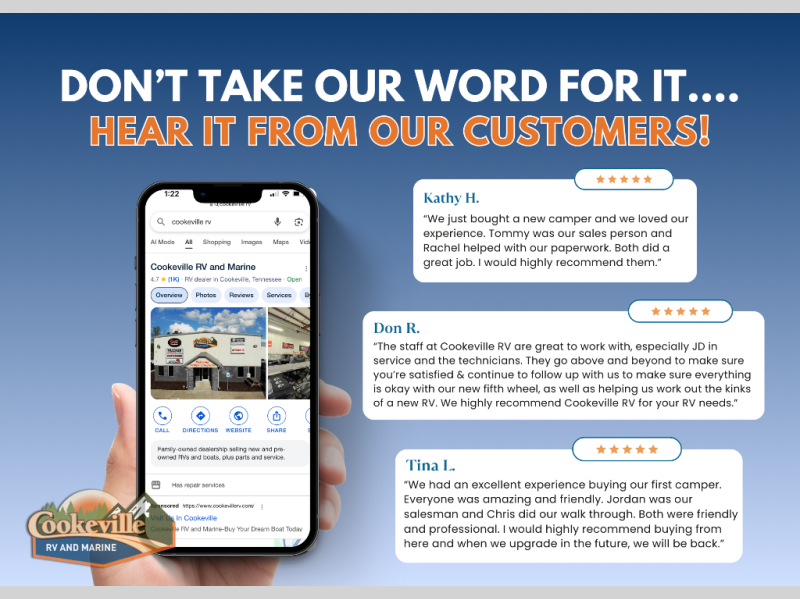 The team here is awesome to work with. They went above and beyond to get us out the door even faster than usual. Service is great. Sales team is friendly and not pushy. Management and finance were great. This is a great place to purchase your RV from. - Christopher