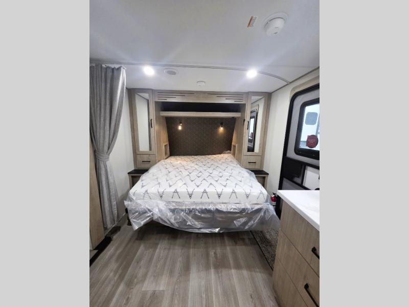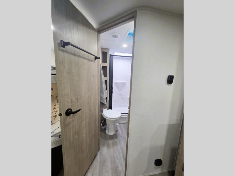This travel trailer has everything you need for a great vacation! You will never miss home when you see all of the amenities included on this trailer. There is a full bathroom for easy morning routines, a set of 47" x 76" double over double-size bunks with privacy curtains for compact sleeping, a U-shaped dinette for meal times, and a full kitchen with all of the appliances needed for filling meals. You could even switch out the dinette for an optional theater dinette. The front Murphy bed not only provides versatility with a bed to sleep on at night, and a seating area during the day, but also a removable interior/exterior table. In addition to all of that, you'll also find an outdoor griddle and 1.6 cu. ft. refrigerator that you can use when the weather is nice. The unobstructed pass-through storage will be able to store your fishing poles and sports equipment while you travel.