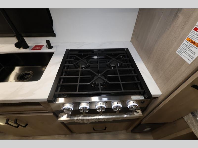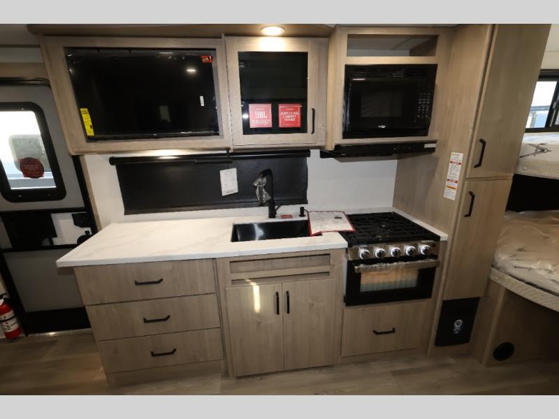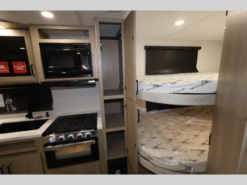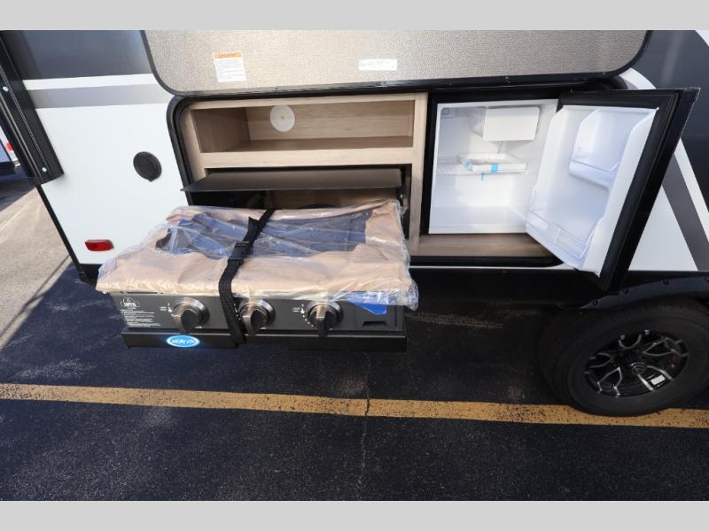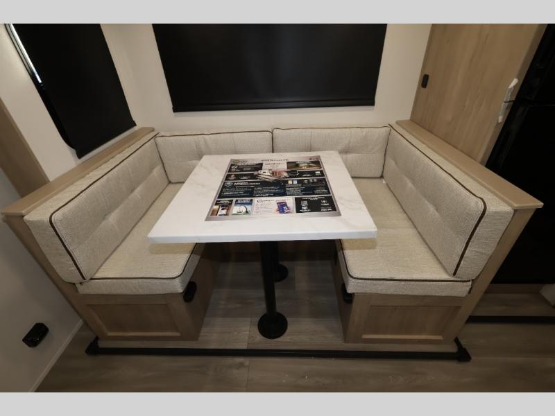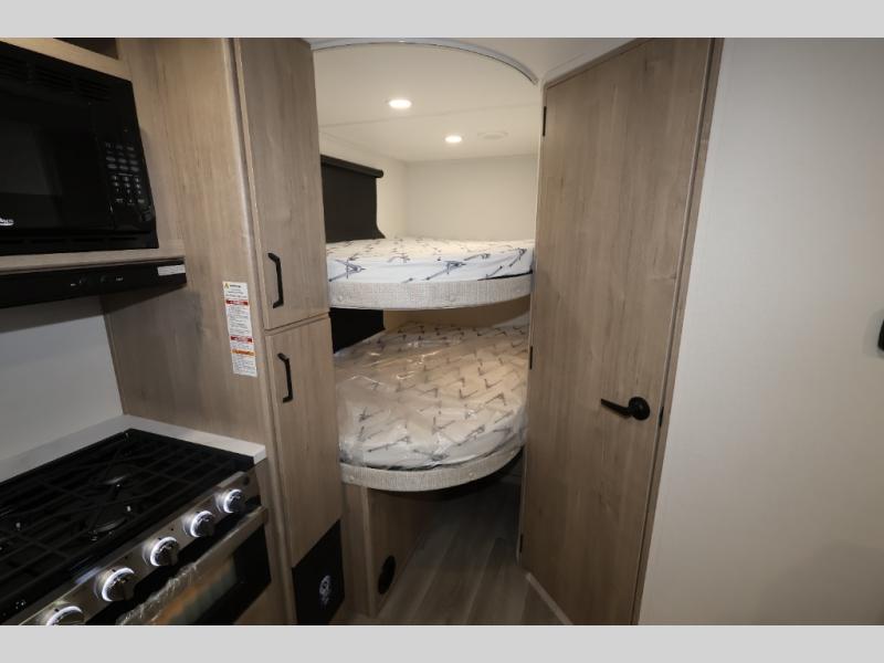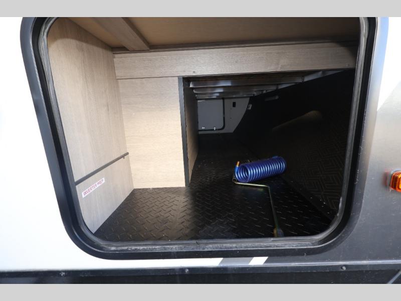 This travel trailer has everything you need for a great vacation! You will never miss home when you see all of the amenities included on this trailer. There is a full bathroom for easy morning routines, a set of 47" x 76" double over double-size bunks with privacy curtains for compact sleeping, a U-shaped dinette for meal times, and a full kitchen with all of the appliances needed for filling meals. You could even switch out the dinette for an optional theater dinette. The front Murphy bed not only provides versatility with a bed to sleep on at night, and a seating area during the day, but also a removable interior/exterior table. In addition to all of that, you'll also find an outdoor griddle and 1.6 cu. ft. refrigerator that you can use when the weather is nice. The unobstructed pass-through storage will be able to store your fishing poles and sports equipment while you travel.