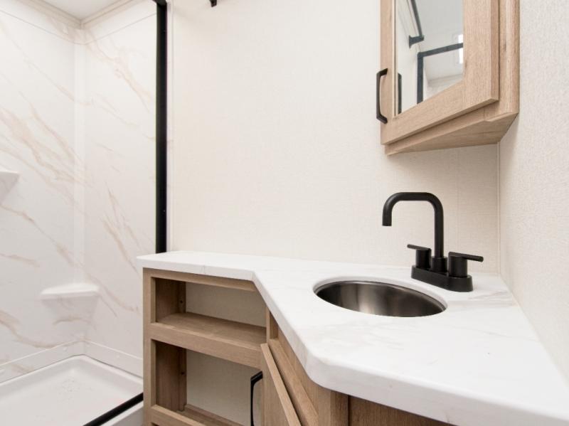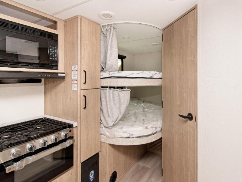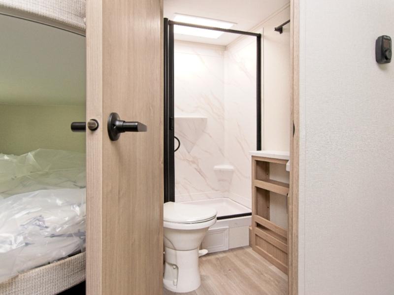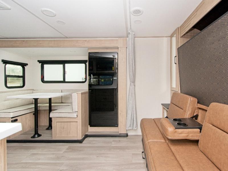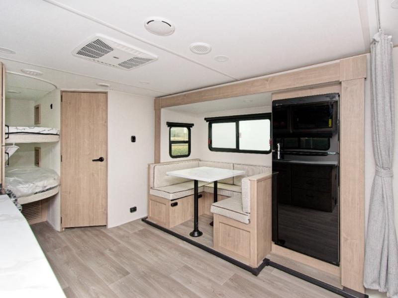 Inside, you’ll enjoy a full bathroom that makes morning routines easy, along with double-size bunk beds (47" x 76") featuring privacy curtains—ideal for kids or guests. The U-shaped dinette provides plenty of seating for meals, games, or relaxing evenings and can be upgraded to an optional theater dinette for even more comfort.