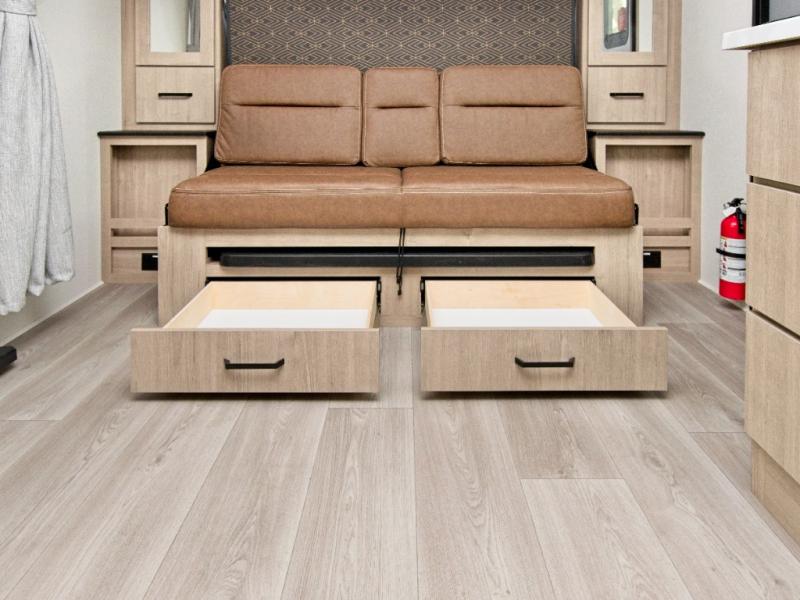 Outside, the electric awning with LED lighting creates the perfect shaded space for relaxing, while Tuff-Ply pass-through flooring is built to handle rugged adventures.