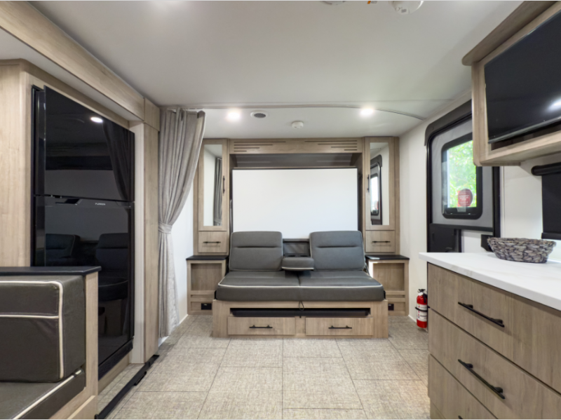 Front Murphy Bed – Enjoy versatility and function with a fold-down Murphy bed that transforms into a cozy sofa by day and a comfortable sleeping area by night.