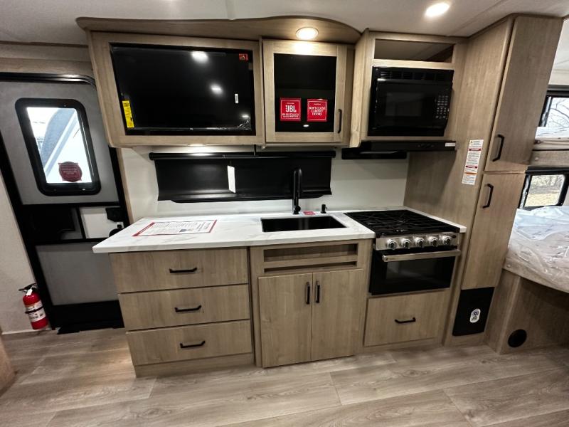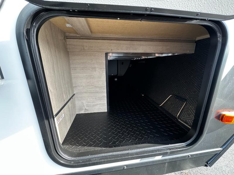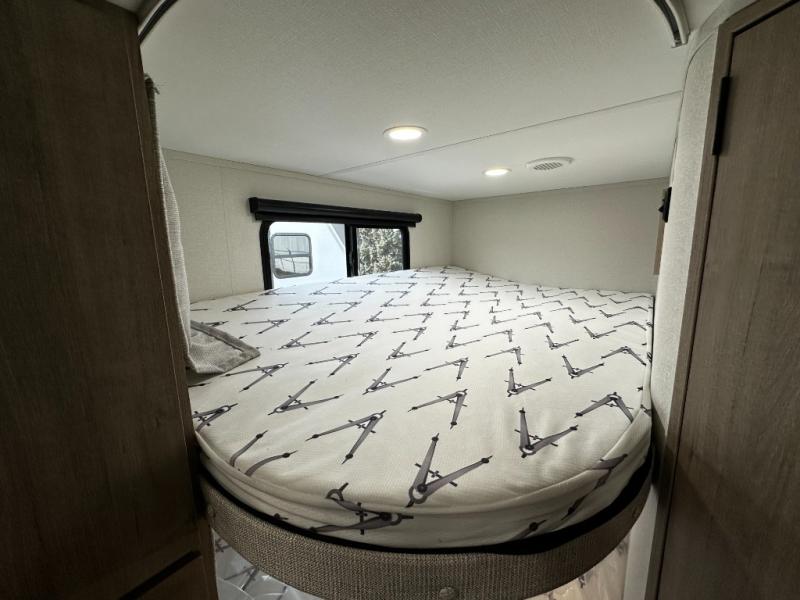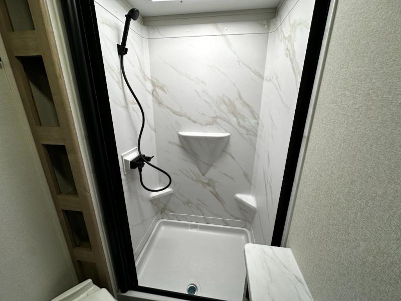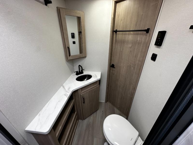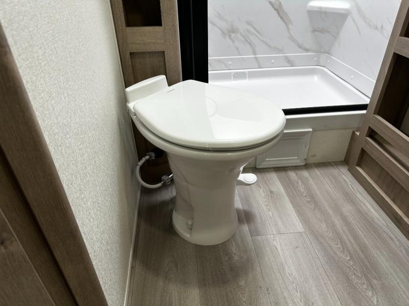The private bedroom area comfortably accommodates your rest with a dedicated bed layout that makes sleep feel just like home. A well-appointed bathroom with a shower, sink, and toilet ensures convenience and privacy no matter where you’re parked. Smart storage solutions throughout the trailer keep gear organized and accessible, letting you focus on the fun parts of RV life instead of clutter.