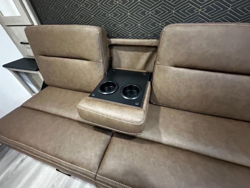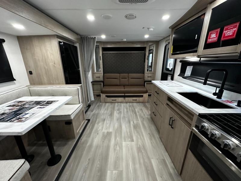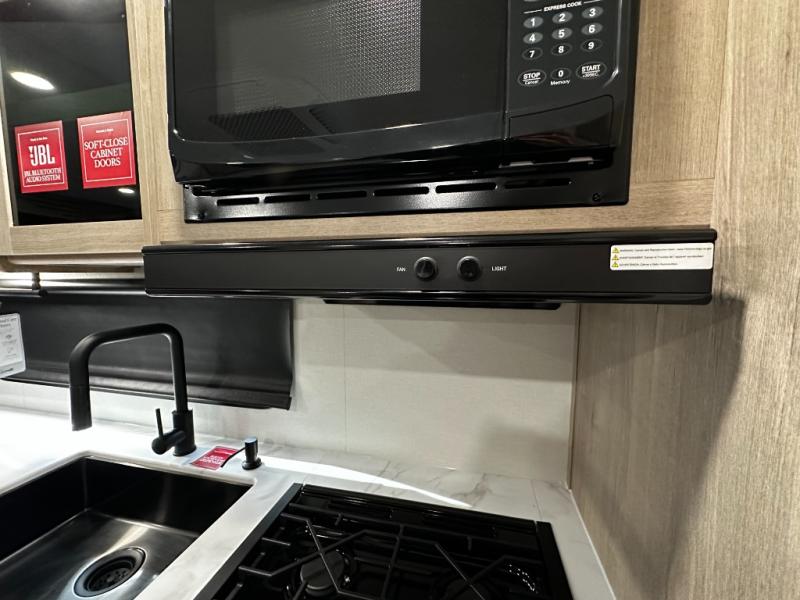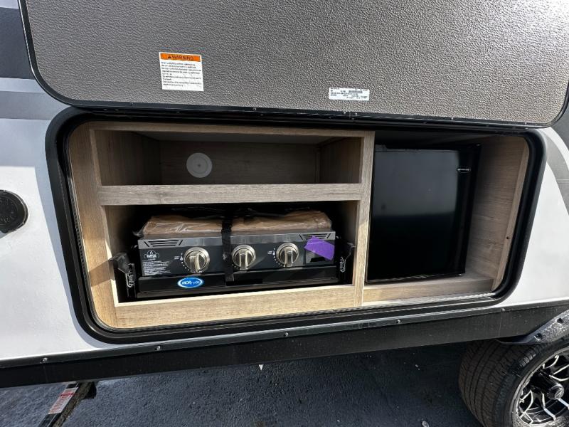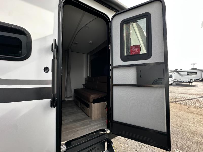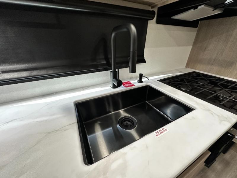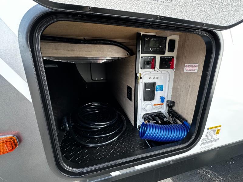 The private bedroom area comfortably accommodates your rest with a dedicated bed layout that makes sleep feel just like home. A well-appointed bathroom with a shower, sink, and toilet ensures convenience and privacy no matter where you’re parked. Smart storage solutions throughout the trailer keep gear organized and accessible, letting you focus on the fun parts of RV life instead of clutter.
